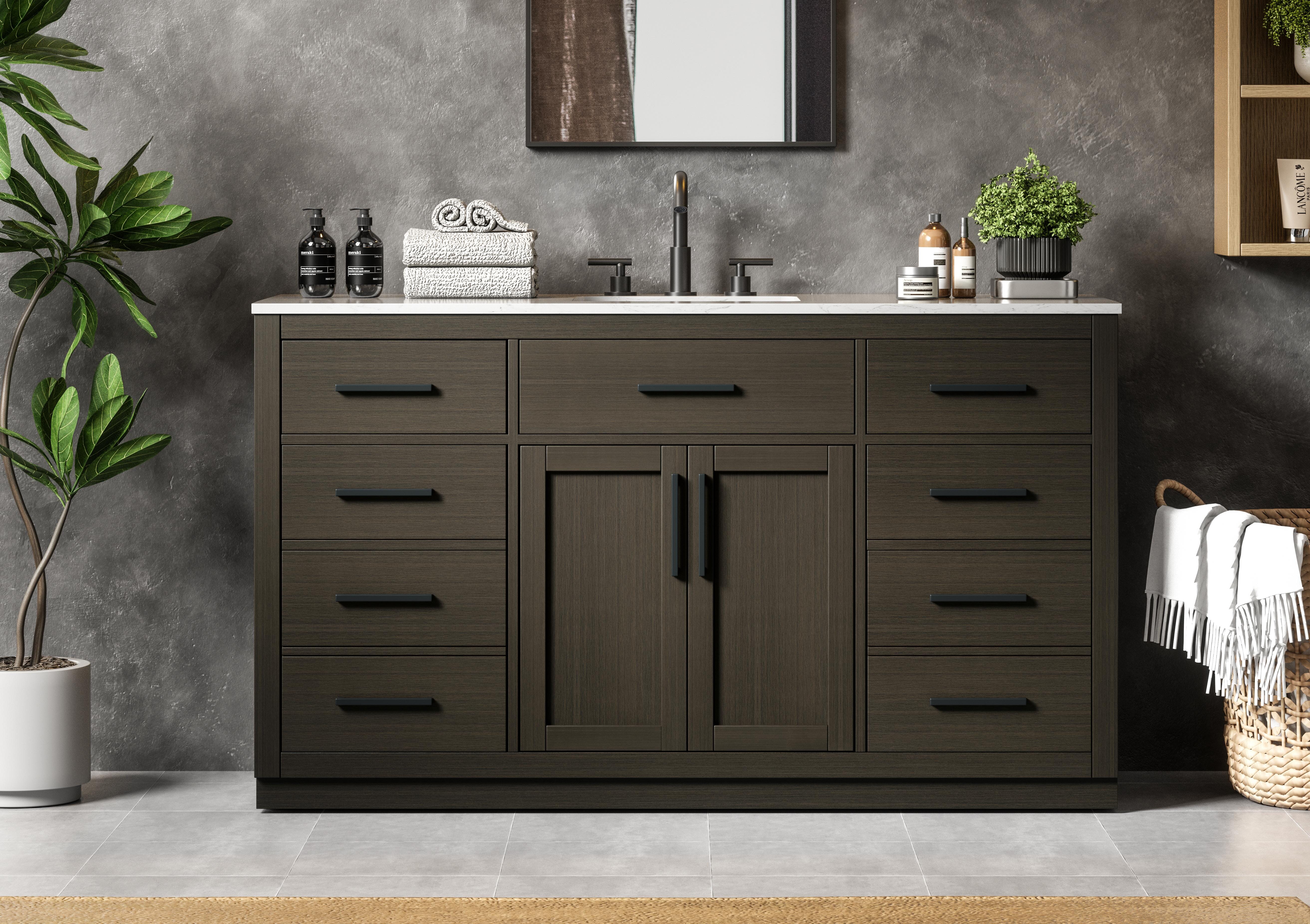 Introduce a perfect balance of functionality and style to your bathroom with this thoughtfully designed vanity. Constructed with a combination of solid wood and MDF, it offers durability and a sturdy build. The sleek engineered marble countertop with subtle grey marbling complements the rustic wood grain finish, creating a stylish and inviting centerpiece for your bathroom. Designed in a contemporary style with a transitional flair, it features a U-shaped shelf for seamless plumbing integration and multiple soft-close drawers for clutter-free organization. A pull-down drawer enhances convenience, while the toe kick adds a refined, clean-lined appearance and simplifies cleaning underneath. Matte black hardware contrasts beautifully with the cabinet finish, tying the look together. Delivered fully assembled and equipped with foot levelers, this vanity combines practicality and aesthetic appeal to suit modern and transitional bathrooms alike.