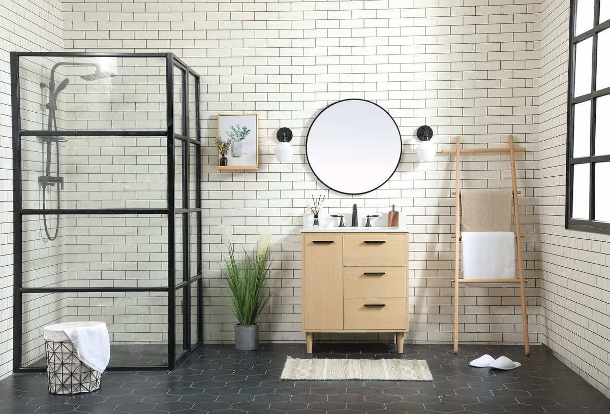 Modern sophistication is defined with the mape finish and black barpulls of this vanity and slender tapered legs. Its length makes it the perfect addition to any sized home, and saves space with its storage area hidden behind the Single cabinet door and two bottom drawers. Topped with a highly durable engineered stone countertop and a porcelain undermount sink, this modern design will become your focal point of your bathroom or powder room. Comes with a matching backsplash to complete the look and protects your wall. Equipped with soft-closing drawer and doors adds a quiet functional touch.