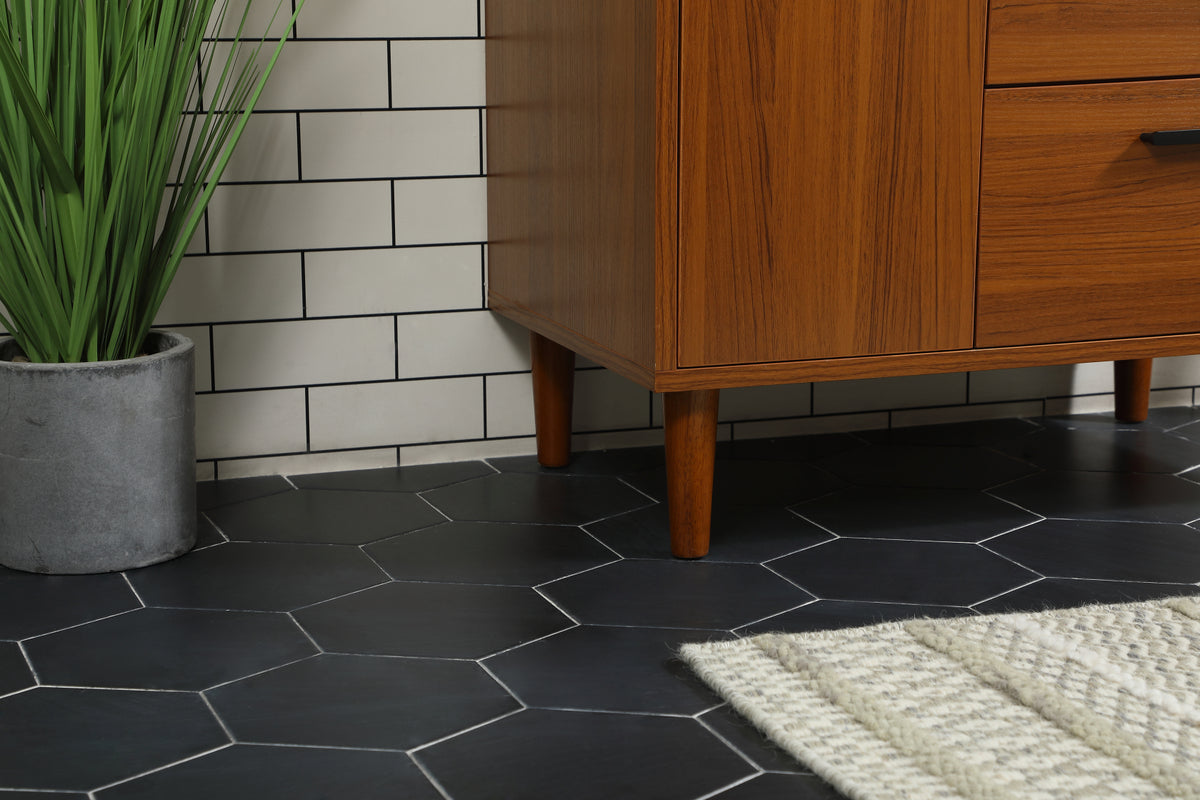 Modern sophistication is defined with the teak finish and black barpulls of this vanity and slender tapered legs. Its length makes it the perfect addition to any sized home, and saves space with its storage area hidden behind the Single cabinet door and two bottom drawers. Topped with a highly durable engineered stone countertop and a porcelain undermount sink, this modern design will become your focal point of your bathroom or powder room. Comes with a matching backsplash to complete the look and protects your wall. Equipped with soft-closing drawer and doors adds a quiet functional touch.