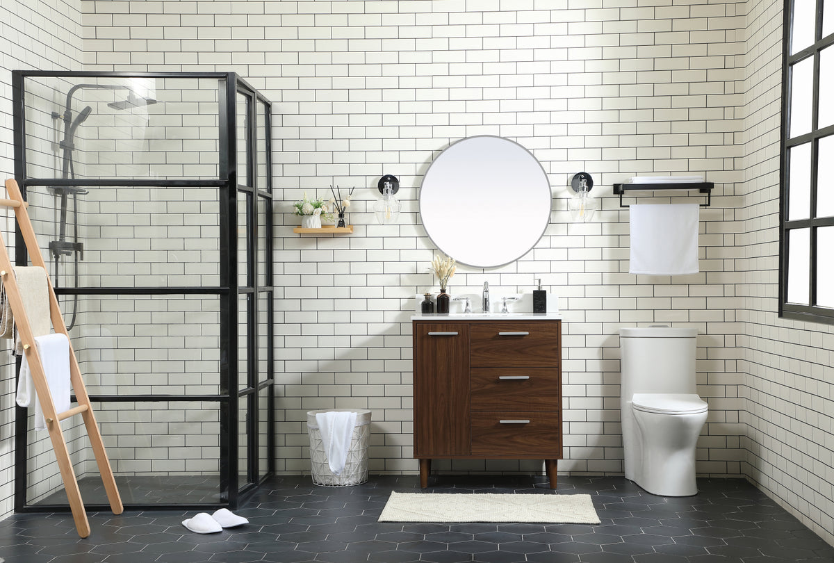 Modern sophistication is defined with the walnut finish and silver barpulls of this vanity and slender tapered legs. Its length makes it the perfect addition to any sized home, and saves space with its storage area hidden behind the Single cabinet door and two bottom drawers. Topped with a highly durable engineered stone countertop and a porcelain undermount sink, this modern design will become your focal point of your bathroom or powder room. Comes with a matching backsplash to complete the look and protects your wall. Equipped with soft-closing drawer and doors adds a quiet functional touch.