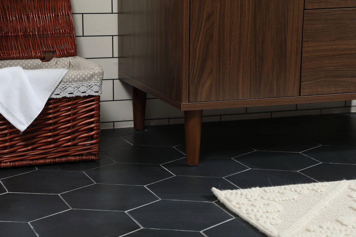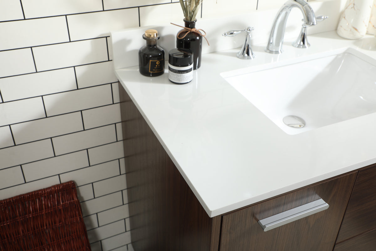 Modern sophistication is defined with the walnut finish and silver barpulls of this vanity and slender tapered legs. Its length makes it the perfect addition to any sized home, and saves space with its storage area hidden behind the Single cabinet door and two bottom drawers. Topped with a highly durable engineered stone countertop and a porcelain undermount sink, this modern design will become your focal point of your bathroom or powder room. Comes with a matching backsplash to complete the look and protects your wall. Equipped with soft-closing drawer and doors adds a quiet functional touch.