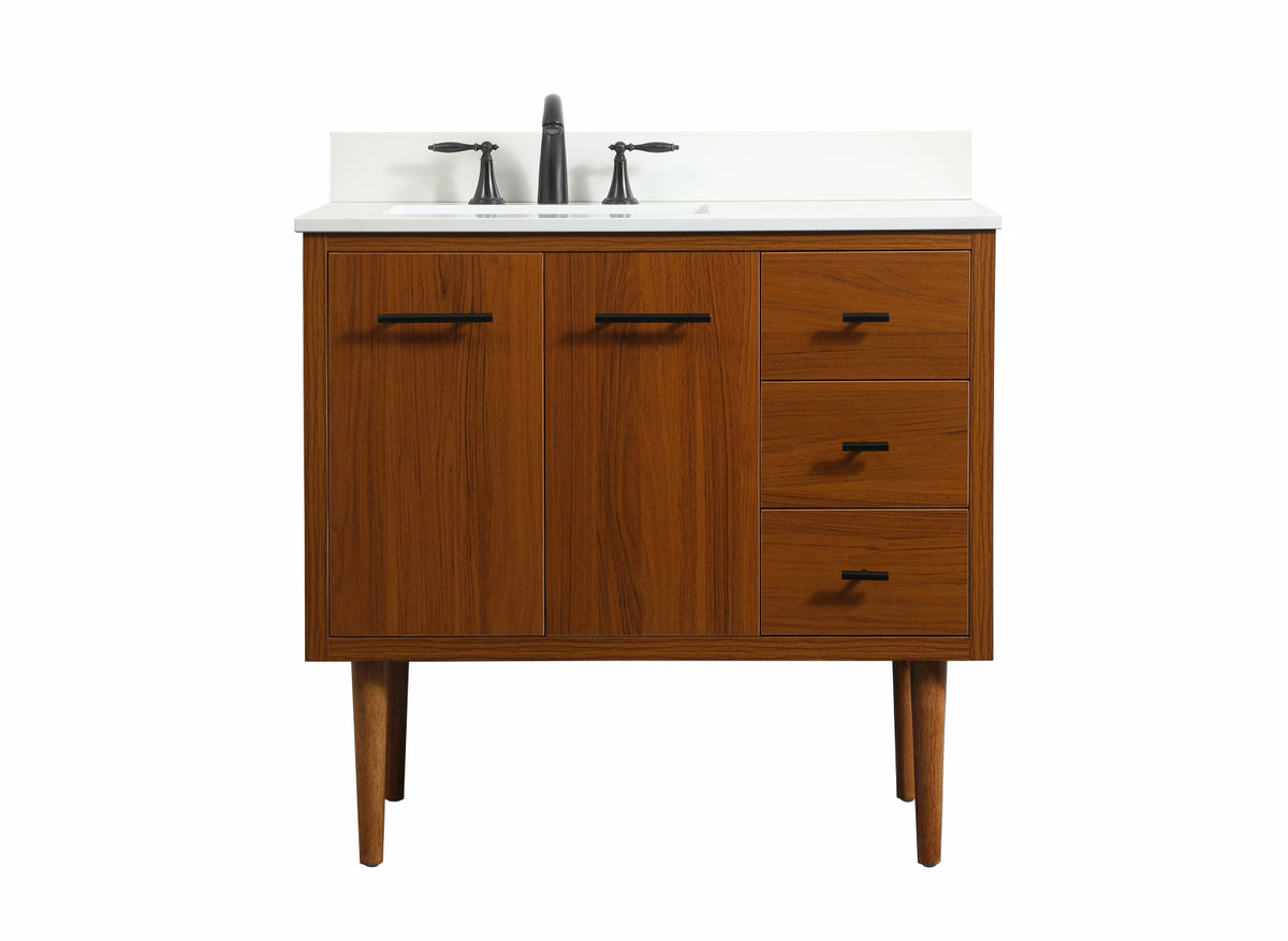 Delve into a world of minimalistic fashion and contemporary styling with this midcentury modern vanity. The clean lines anchors the design, while the straight tapered cylinder legs add subtle interest. Bar pull handle adorns the soft closing door hiding the base of the rectangular porcelain sink and letting you store your bathroom necessities and toiletries. Three soft closing drawers add plenty of storage option. Whether you want to use this as a floating vanity or a freestanding vanity, the choice is yours. The durable ivory white engineered marble countertop complements the manufactured wood base vanity and is built to last. Comes with a matching backsplash to complete the look and protects your wall.