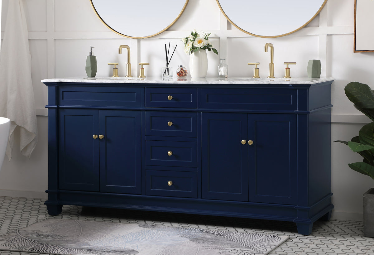 The Wesley Collection vanity cabinet will bring a settle pop of color into your bathroom. The navy blue is a cool color which creates a calming atmosphere in the room. The gold knobs bring a vibrant touch to balance the vanity. With the detailed engravings, the cabinet catches eyes with its beautiful lining work. Open the cabinet doors to store what you desire and make use of the spacious area. To top it off, the Carrara white marble adds a luxury and modern finish to the countertop.