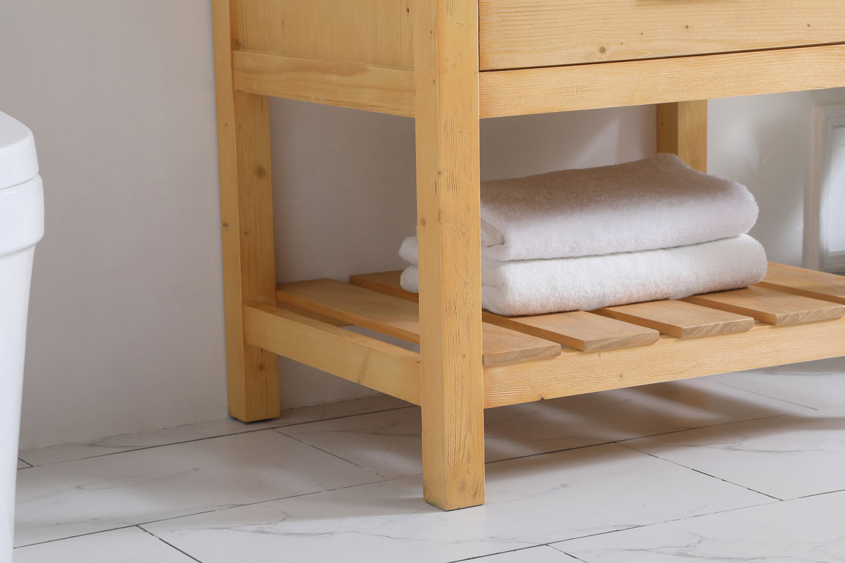 Make the most of your space with this farmhouse style bathroom vanity. Complements well with its beautiful finish, carrara white marble countertop, and the contemporary slender handle bar that sits on the functional drawers with soft closing mechanism, allowing you to store an assortment of bathroom essentials. The lower shelf makes it the perfect space to hold new towels for your guests. This stylish vanity ensures both form and function in your bathroom for you and your guests. Comes with a matching backsplash to complete the look and protects your wall.