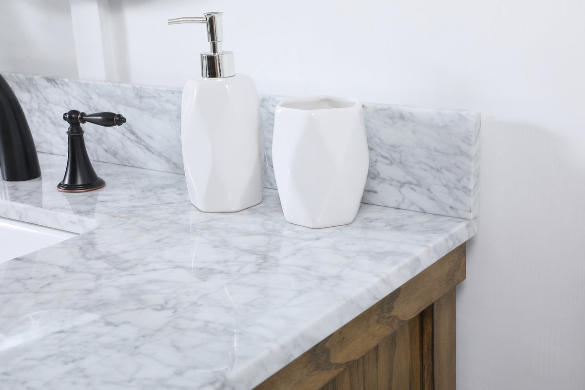 Make the most of your space with this farmhouse style bathroom vanity. Complements well with its beautiful finish, carrara white marble countertop, and the contemporary slender handle bar that sits on the functional drawers with soft closing mechanism, allowing you to store an assortment of bathroom essentials. The lower shelf makes it the perfect space to hold new towels for your guests. This stylish vanity ensures both form and function in your bathroom for you and your guests.