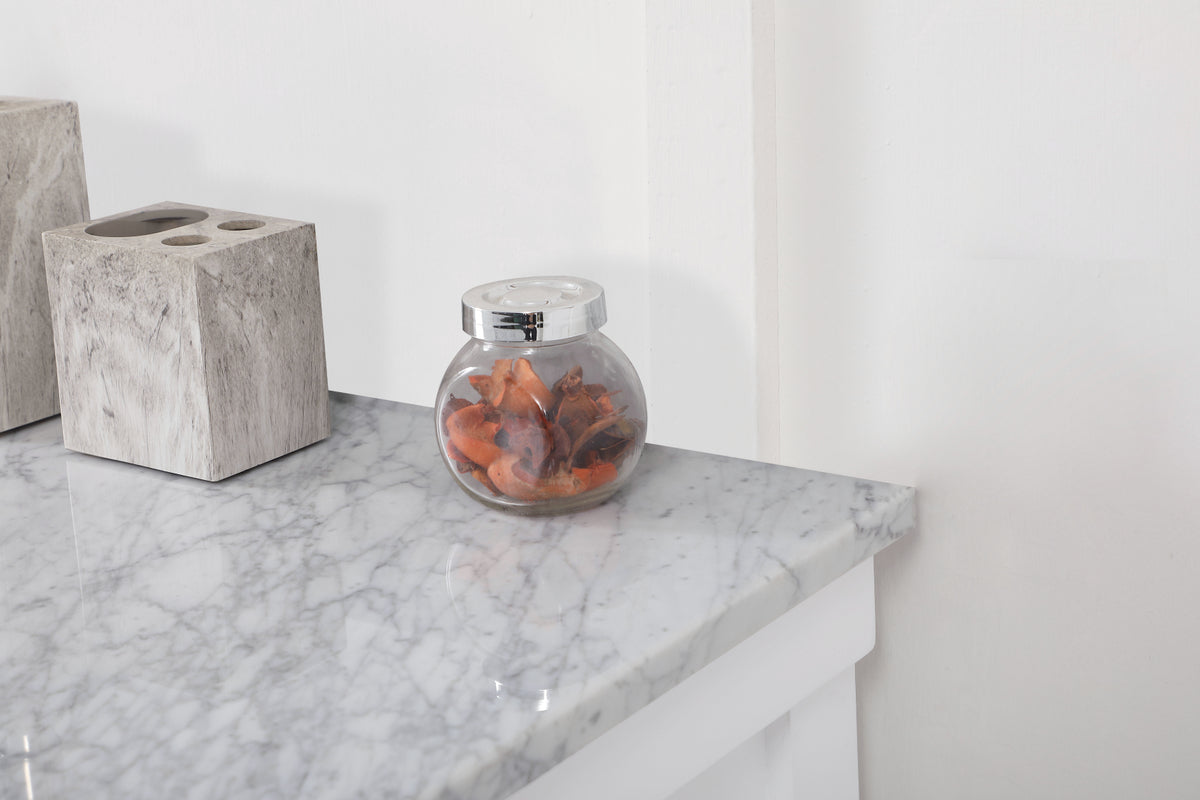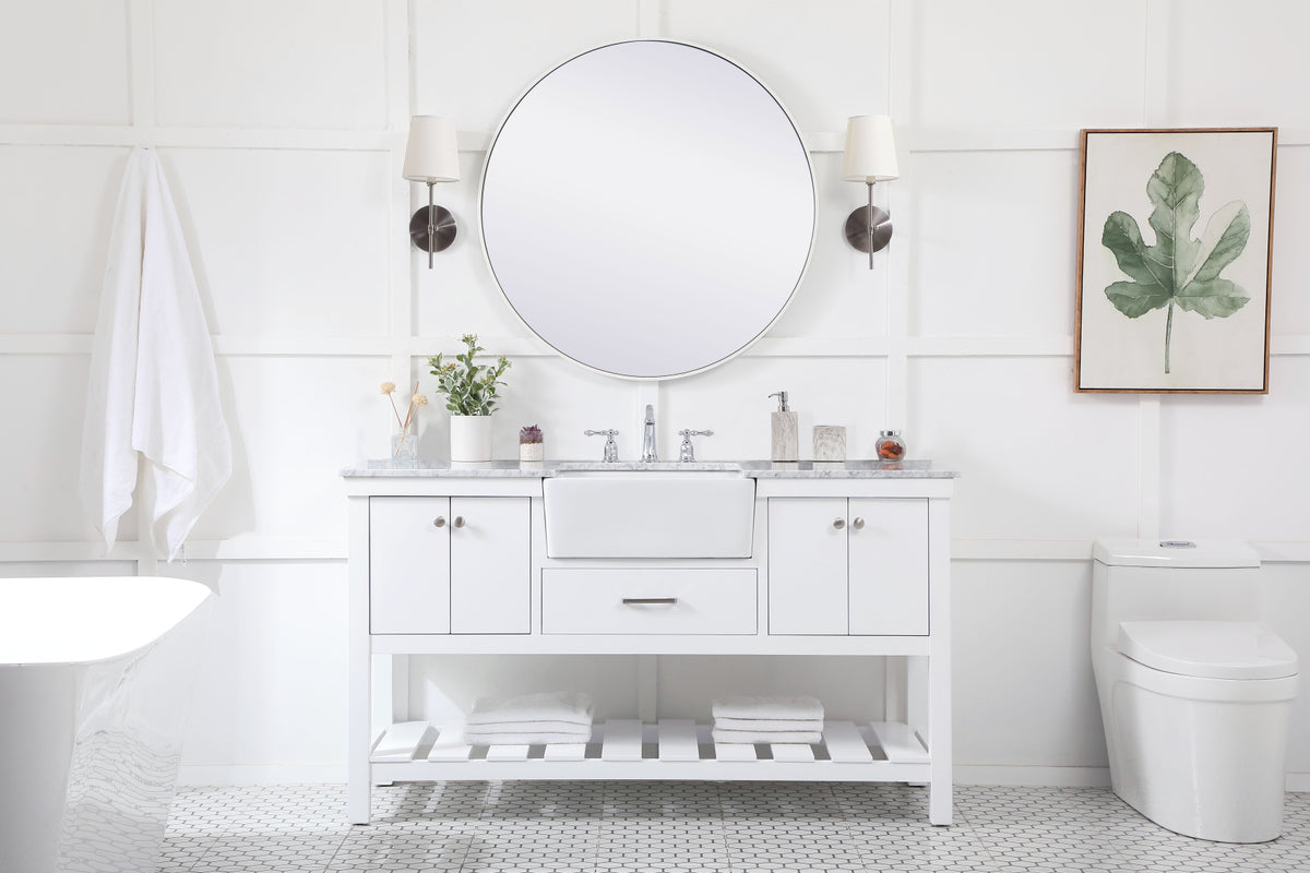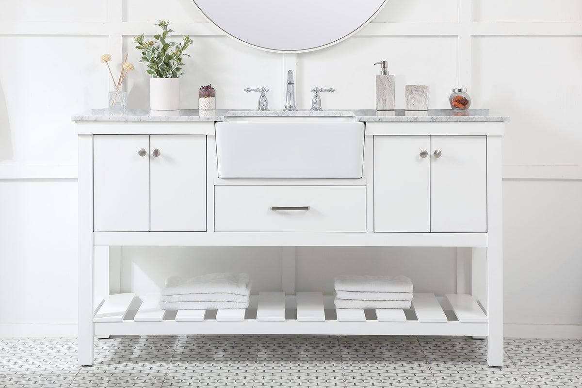 Make the most of your space with this farmhouse style bathroom vanity. Complements well with its beautiful finish, carrara white marble countertop, and the contemporary slender handle bar that sits on the functional drawers with soft closing mechanism, allowing you to store an assortment of bathroom essentials. The lower shelf makes it the perfect space to hold new towels for your guests. This stylish vanity ensures both form and function in your bathroom for you and your guests.