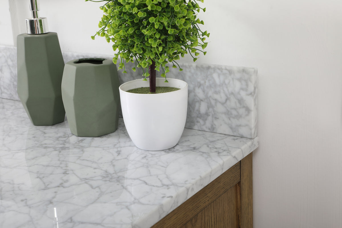Make the most of your space with this farmhouse style bathroom vanity. Complements well with its beautiful finish, carrara white marble countertop, and the contemporary slender handle bar that sits on the functional drawers with soft closing mechanism, allowing you to store an assortment of bathroom essentials. The lower shelf makes it the perfect space to hold new towels for your guests. This stylish vanity ensures both form and function in your bathroom for you and your guests. Comes with a matching backsplash to complete the look and protects your wall.