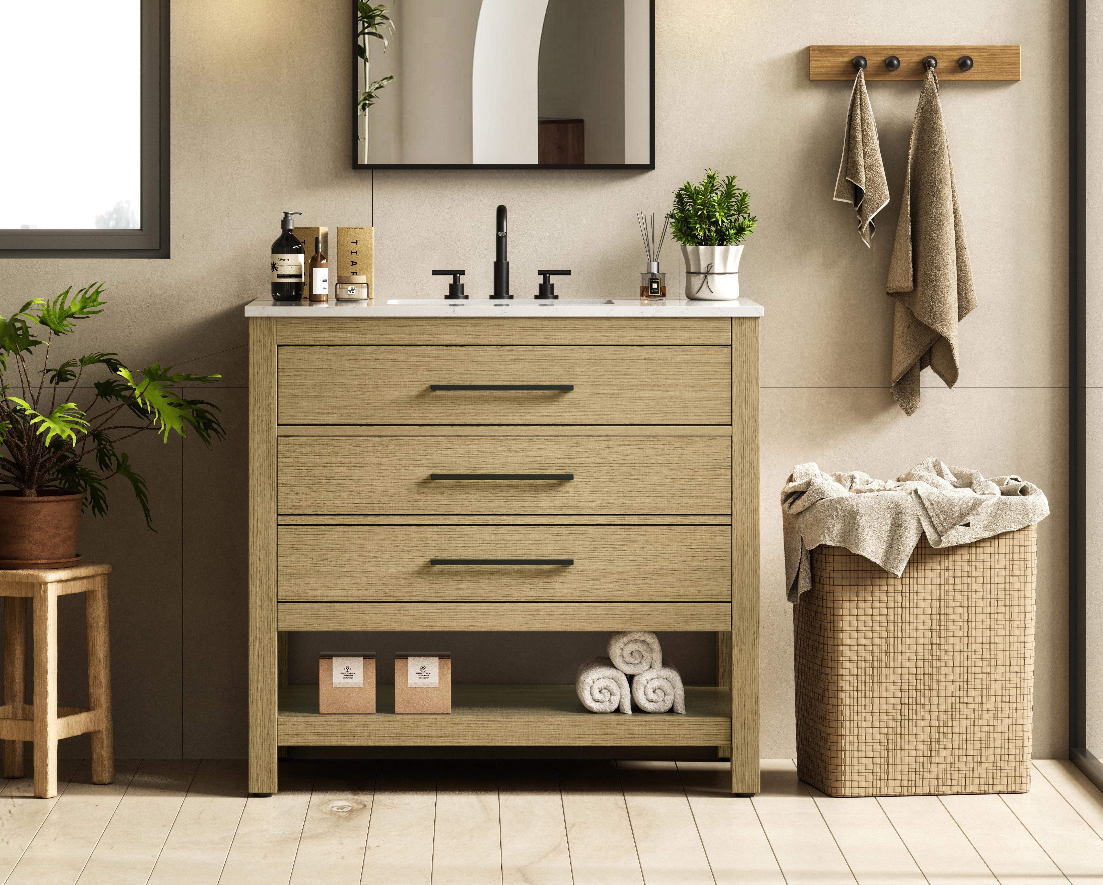 Available in four stunning finishes—Chestnut Brown, Honey Brown, Mocha Brown, and White—this vanity suits any interior style. Designed with convenience in mind, it features soft-closing drawers with modern handles and a tip-out drawer for easy access to small essentials, keeping your space tidy. The bottom deep drawer mimics the appearance of two separate drawers, providing ample storage for larger items, while the open shelf at the base offers additional storage space for towels or decor.