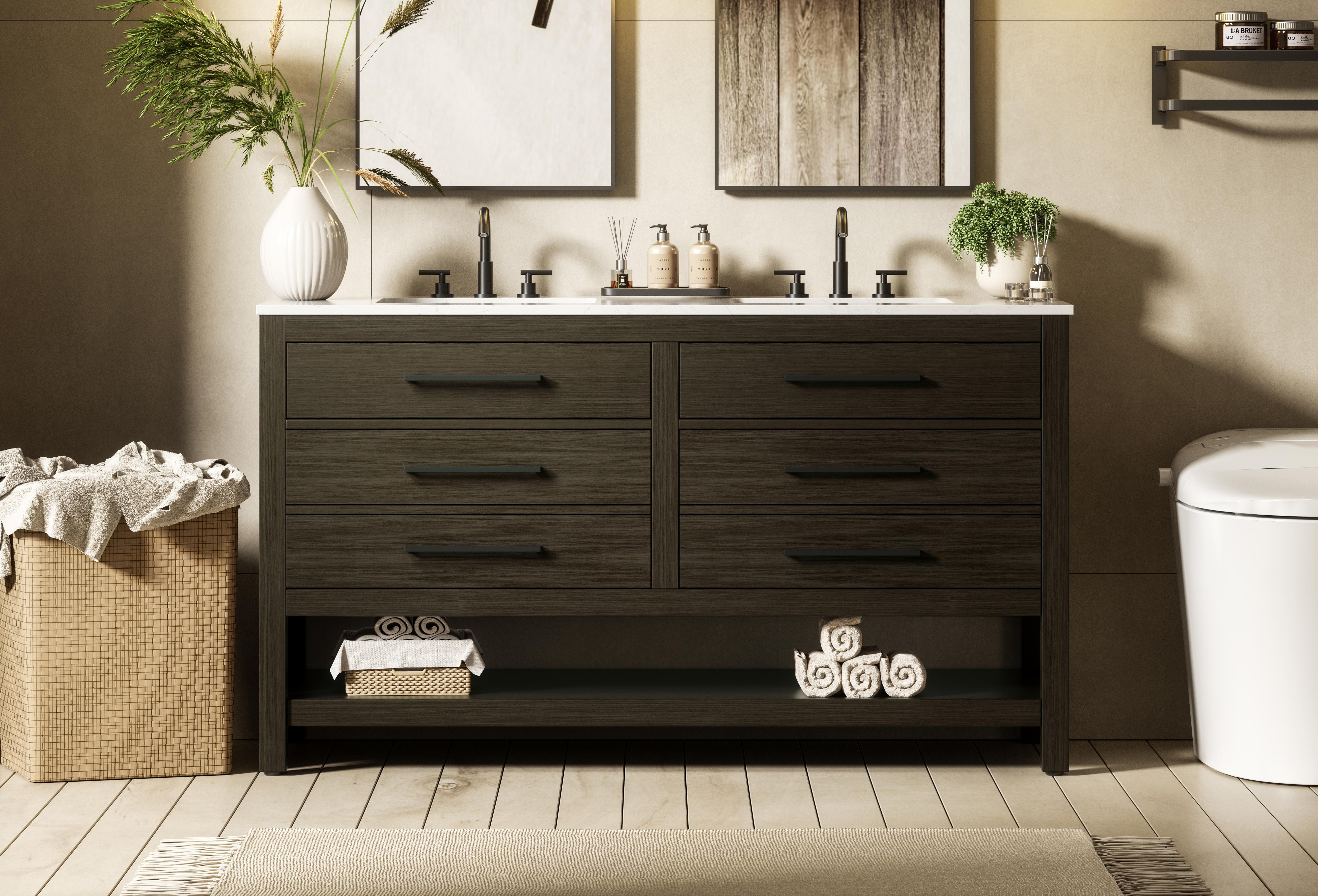 Available in four stunning finishes—Chestnut Brown, Honey Brown, Mocha Brown, and White—this vanity suits any interior style. Designed with convenience in mind, it features soft-closing drawers with modern handles and a tip-out drawer for easy access to small essentials, keeping your space tidy. The bottom deep drawer mimics the appearance of two separate drawers, providing ample storage for larger items, while the open shelf at the base offers additional storage space for towels or decor.