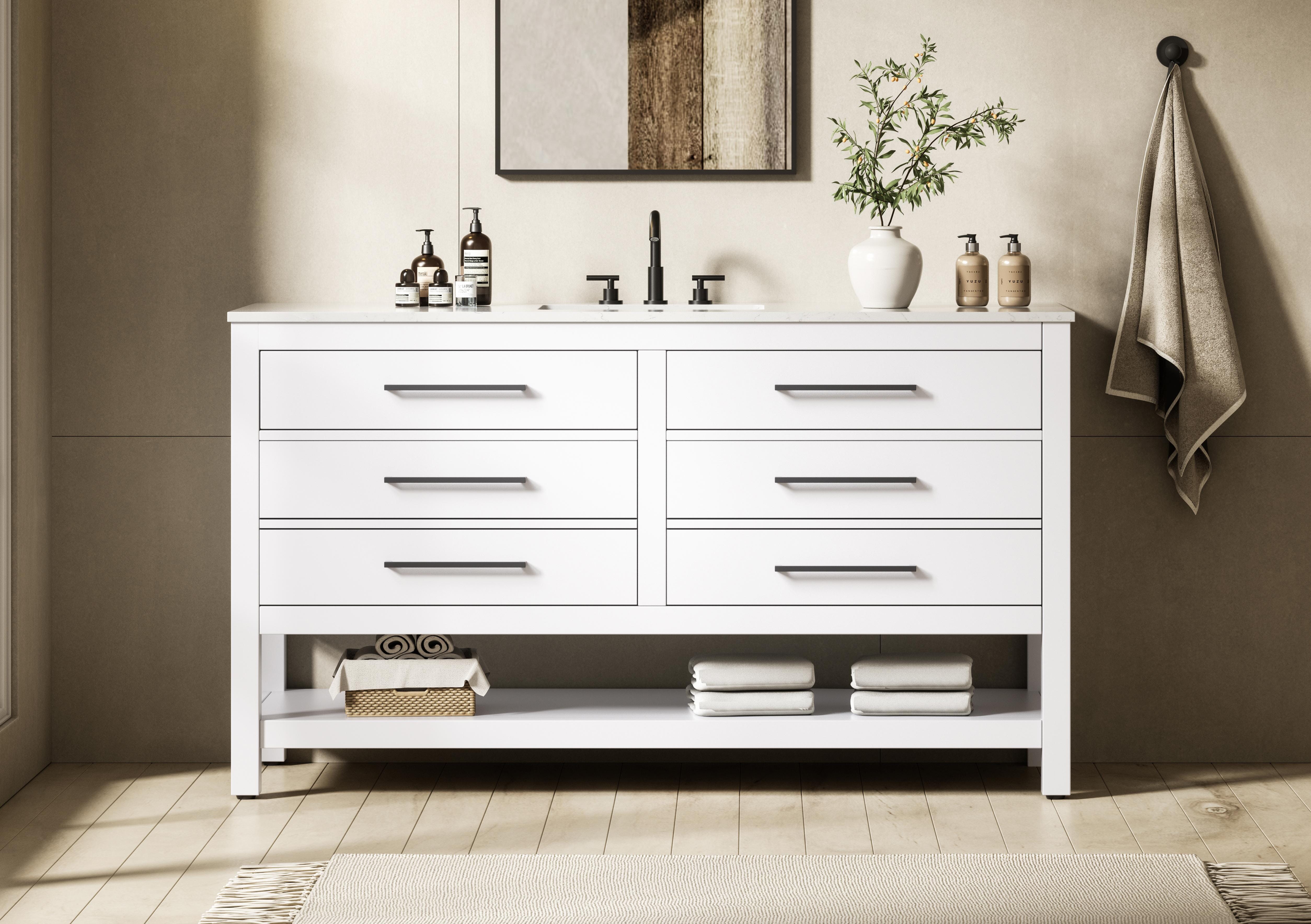 Available in four stunning finishes—Chestnut Brown, Honey Brown, Mocha Brown, and White—this vanity suits any interior style. Designed with convenience in mind, it features soft-closing drawers with modern handles and a tip-out drawer for easy access to small essentials, keeping your space tidy. The bottom deep drawer mimics the appearance of two separate drawers, providing ample storage for larger items, while the open shelf at the base offers additional storage space for towels or decor.