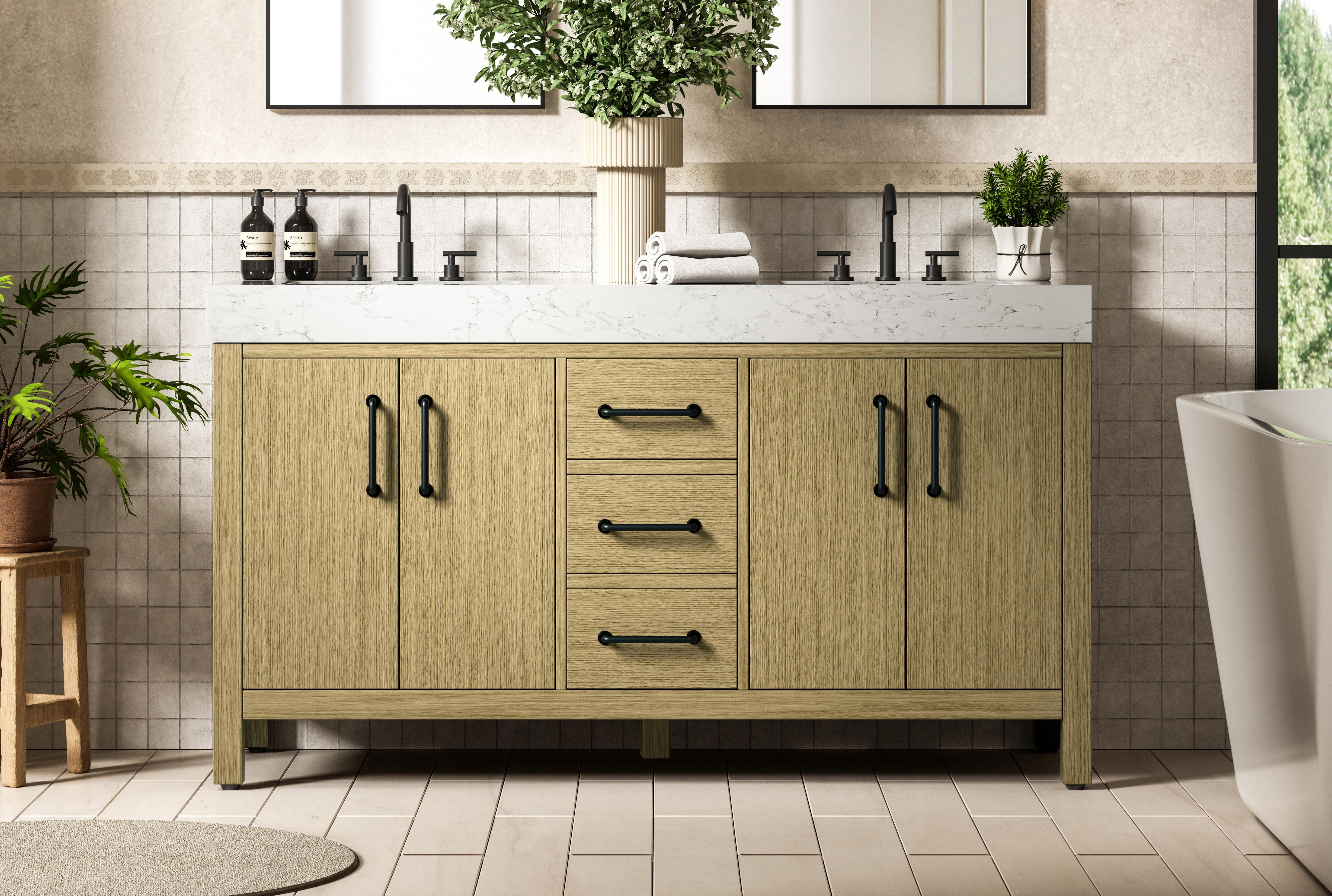 This bathroom vanity showcases a balanced blend of contemporary style and warm, natural-like elements, making it a versatile addition to various interior designs. The clean, straight edges and flat-panel doors lend a modern, streamlined look, while the soft, light wood finish highlights the faux grain pattern, adding warmth and a sense of organic texture to the piece. The design features a double-sink layout, emphasizing functionality and spaciousness, ideal for shared bathrooms. The central drawers and symmetrical cabinet doors create a sense of balance and structure. Matte black hardware offers a bold contrast to the light wood tone, reinforcing the modern aesthetic while maintaining a timeless appeal. The thick engineered marble countertop adds a sturdy, minimalist element, with its clean white surface further elevating the overall sophistication of the vanity. This piece is a perfect marriage of style and practicality, effortlessly complementing both modern and transitional bathroom designs. This vanity is delivered fully assembled and equipped with foot levelers for effortless installation and stability. Combining practicality and bold design, this vanity is UPC certified and ready to transform your bathroom space.