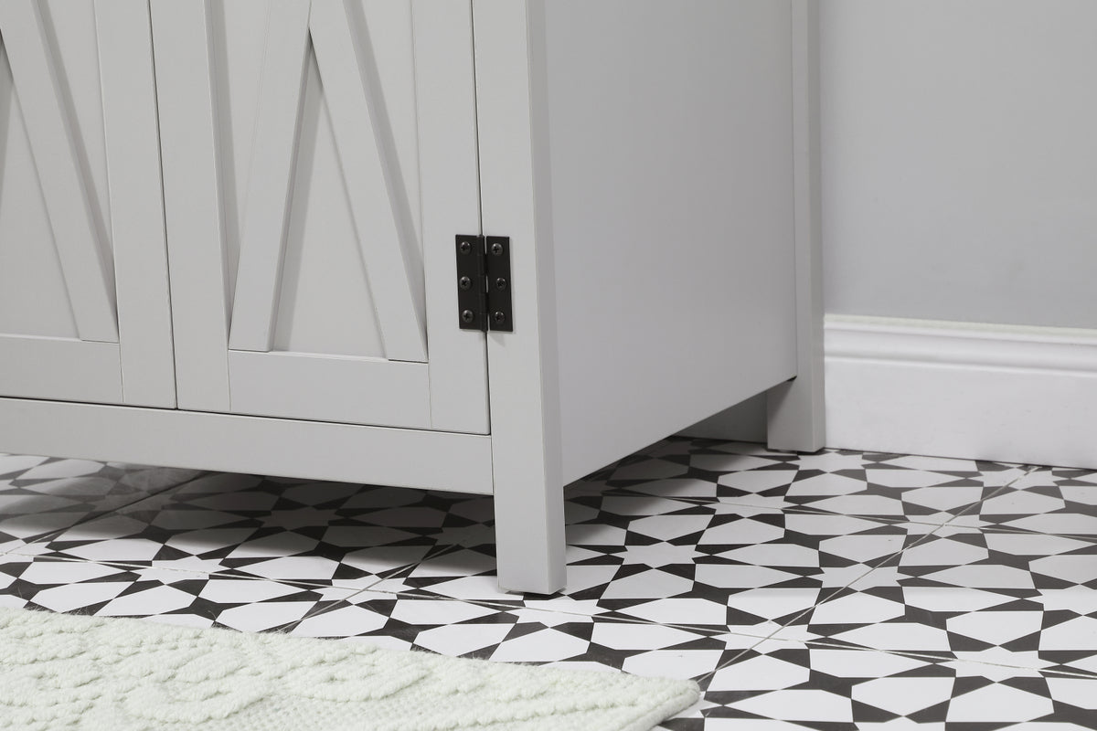 Reminiscent of barn doors, the 2 door cabinet adds both stylistic charm and function with its plethora of storage options for all your bathroom essentials. Whether for your bathroom or the guests', everyone will marvel at its classic look for traditional and farmhouse aesthetics. A slab of engineered marble rounds out the piece up top, as well as the porcelain under mount sink and predrilled faucet holes. This vanity arrives fully assembled.