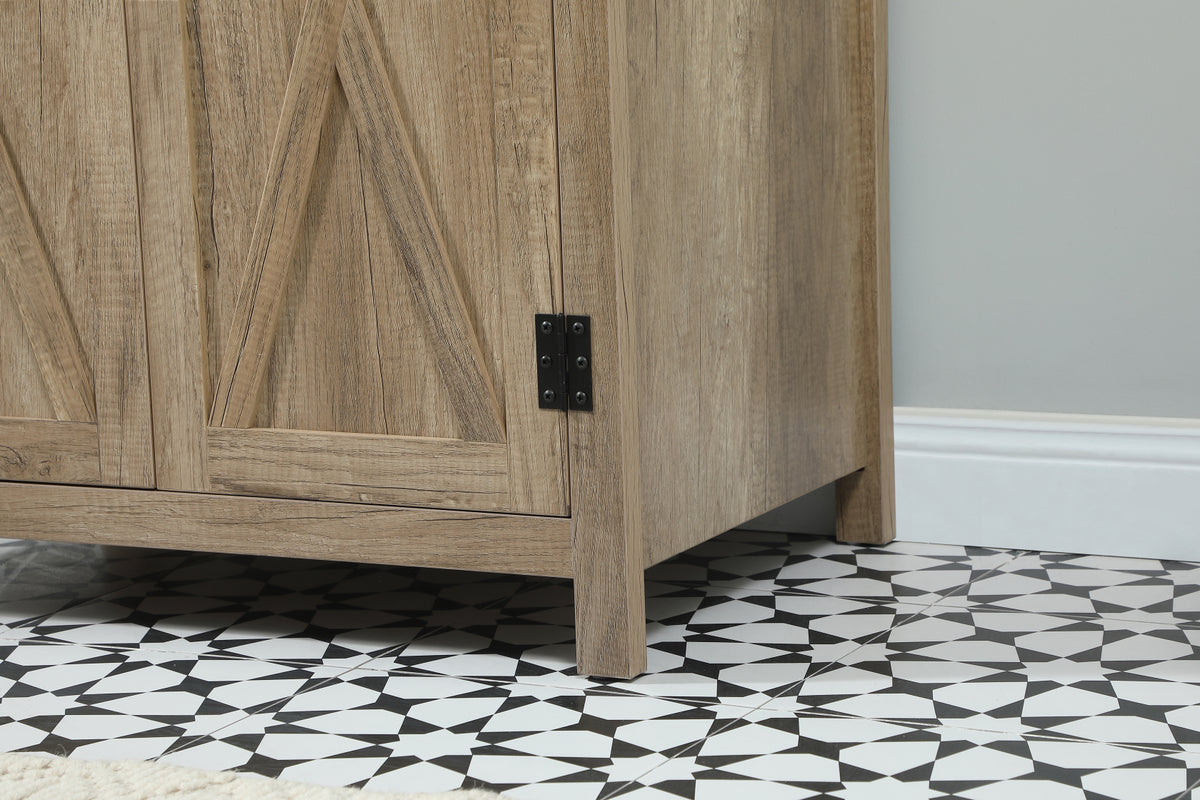Reminiscent of barn doors, the 2 door cabinet adds both stylistic charm and function with its plethora of storage options for all your bathroom essentials. Whether for your bathroom or the guests', everyone will marvel at its classic look for traditional and farmhouse aesthetics. A slab of engineered marble rounds out the piece up top, as well as the porcelain under mount sink and predrilled faucet holes. This vanity arrives fully assembled. Comes with a matching backsplash to complete the look and protects your wall.