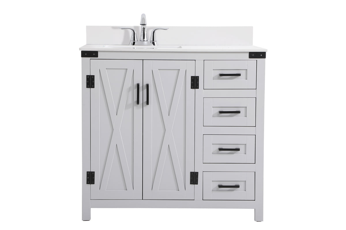 The Grant Collection 36 in. vanity is a practical and stylish upgrade for your bathroom. Its grey finish is highlighted by the engineered white stone top featuring an under-counter rectangular sink. The cross patterned cabinet doors are decorated with bold black hinges and bar pulls. The cabinet has four pullout drawers, ideal for towels, washcloths and bath accessories Comes with a matching backsplash to complete the look and protects your wall.