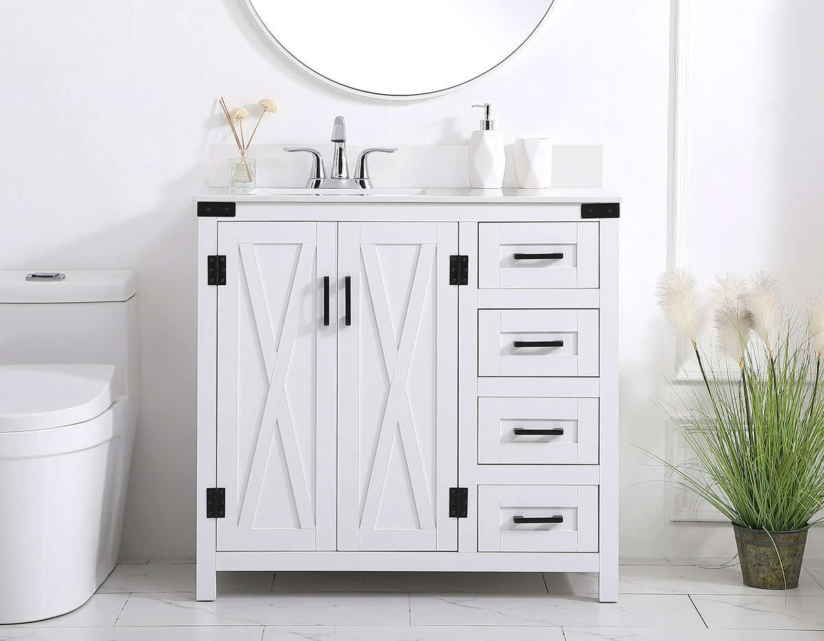 The Grant Collection 36 in. vanity is a practical and stylish upgrade for your bathroom. Its white finish is highlighted by the engineered white stone top featuring an under-counter rectangular sink. The cross patterned cabinet doors are decorated with bold black hinges and bar pulls. The cabinet has four pullout drawers, ideal for towels, washcloths and bath accessories Comes with a matching backsplash to complete the look and protects your wall.