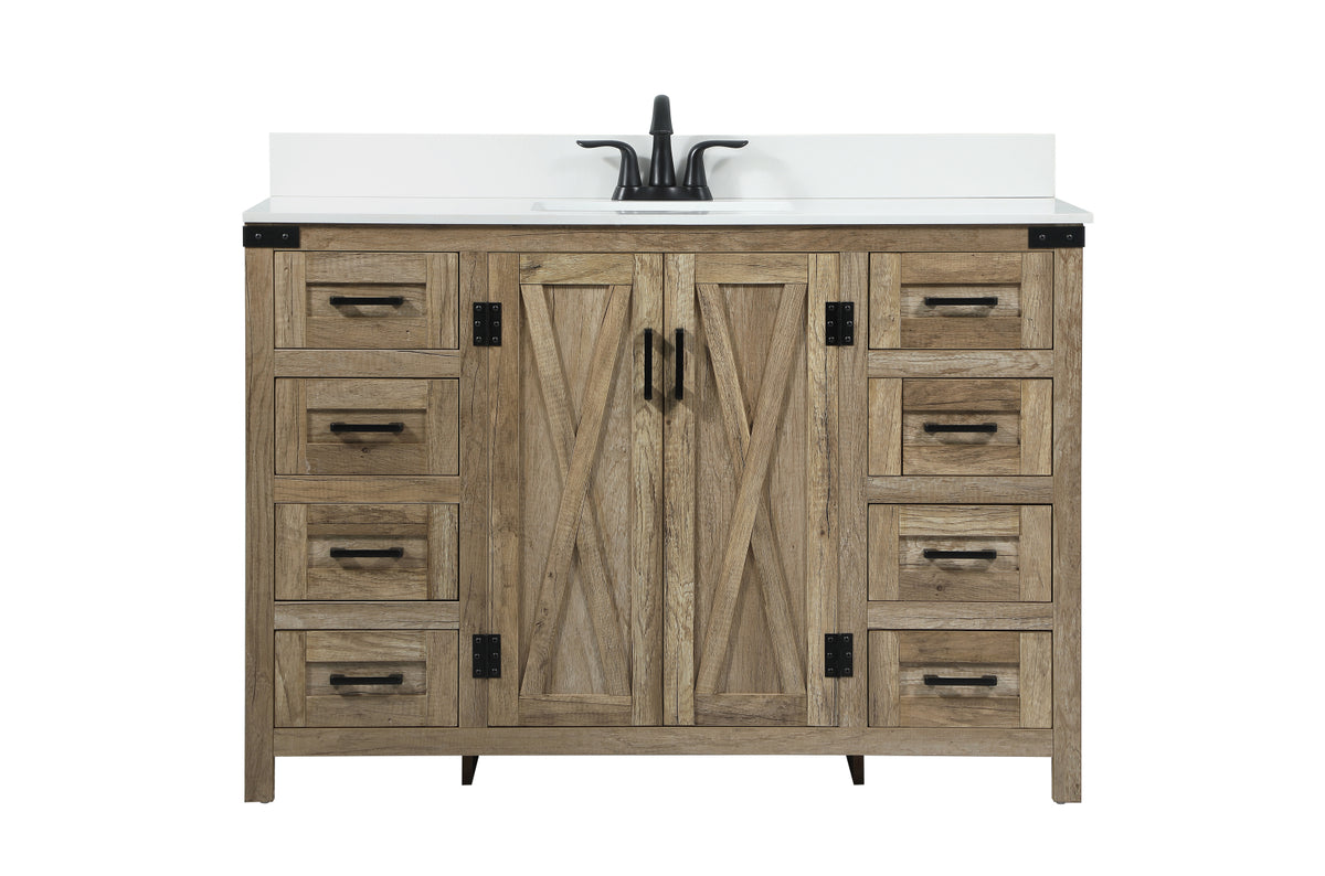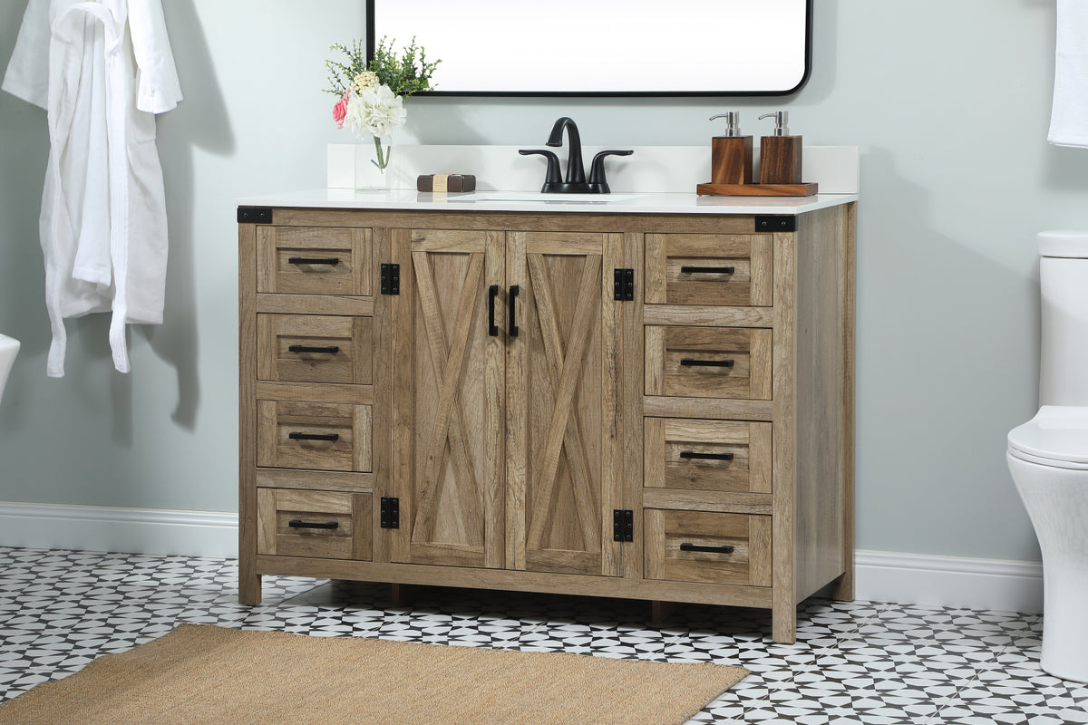 Reminiscent of barn doors, the two door cabinet and eight drawers adds both stylistic charm and function with its plethora of storage options for all your bathroom essentials. Whether for your bathroom or the guests', everyone will marvel at its classic look for traditional and farmhouse aesthetics. A slab of engineered marble rounds out the piece up top, as well as the porcelain under mount sink and predrilled faucet holes. This vanity arrives fully assembled. Comes with a matching backsplash to complete the look and protects your wall.