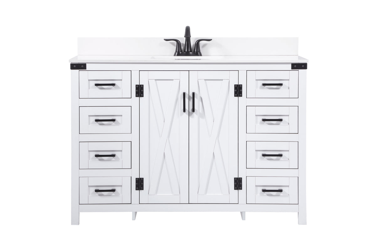 Reminiscent of barn doors, the two door cabinet and eight drawers adds both stylistic charm and function with its plethora of storage options for all your bathroom essentials. Whether for your bathroom or the guests', everyone will marvel at its classic look for traditional and farmhouse aesthetics. A slab of engineered marble rounds out the piece up top, as well as the porcelain under mount sink and predrilled faucet holes. This vanity arrives fully assembled. Comes with a matching backsplash to complete the look and protects your wall.
