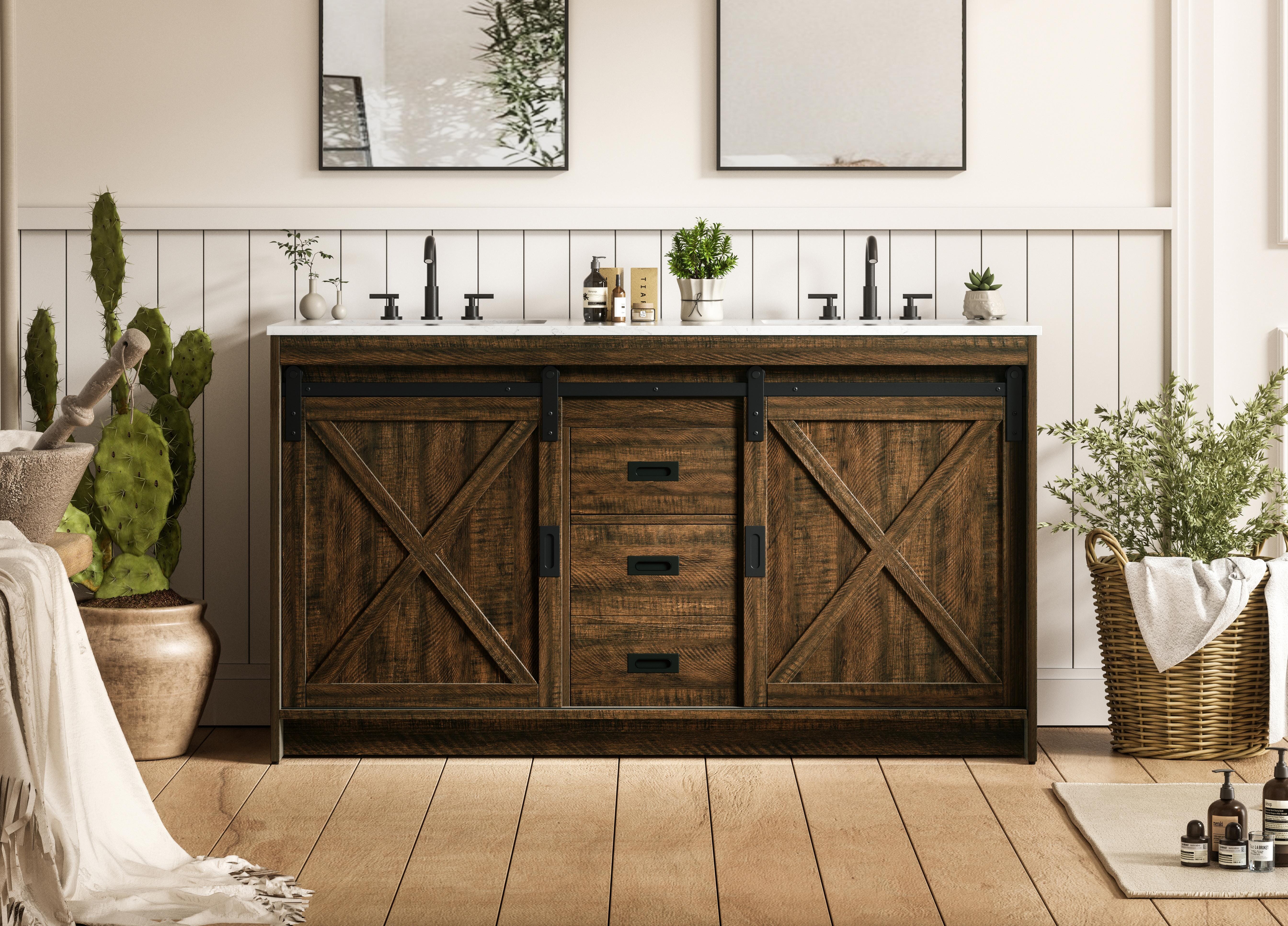 Transform your bathroom with this rustic barnyard-style vanity, designed to balance aesthetic appeal and functionality. Featuring a sliding barn door with black metal hardware and complementary handle pulls, this piece blends rugged charm with practical design. The engineered marble countertop displays unique marbling, while the porcelain undermount sink offers easy maintenance and durability. Available in Espresso, Natural Oak, and Rustic Grey finishes, this vanity suits a range of styles. It includes a deep storage drawer for larger items, a hidden shelf for towels or décor, and adjustable foot levelers for added stability on uneven floors. With pre-drilled faucet holes for easy setup, this vanity delivers style and substance to enhance your bathroom.