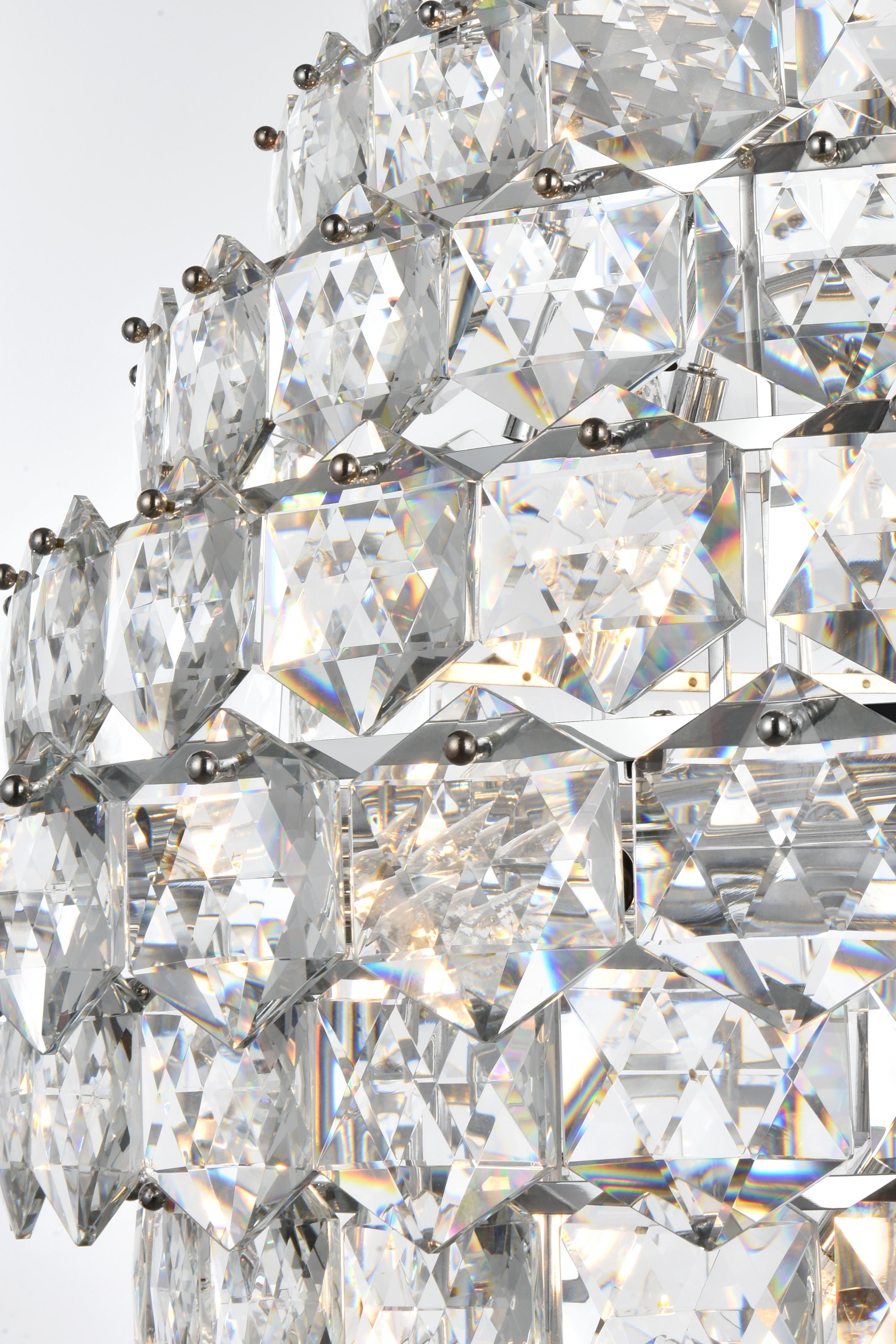 Make a bold statement with this stunning teardrop-shaped pendant light that combines architectural form with radiant details. The cascading multi-tier arrangement of six-sided faceted crystals creates a dazzling visual effect, beautifully diffusing light to enhance the ambiance of any room. Built with a durable iron frame and available in chrome for a sleek, contemporary edge or satin gold for a rich, inviting tone, this lighting fixture complements a range of decor styles. Its grand adjustable hanging height—from 75 inches to 135 inches—makes it ideal for spaces with high ceilings. With 38 E12 sockets (bulbs sold separately) and dimmable compatibility, it provides versatile lighting options tailored to your needs. The matching canopy and chain finish complete its cohesive design. Whether placed in a dining room, living room, office, or a grand foyer, this chandelier-style pendant transforms any space into a brilliant masterpiece.