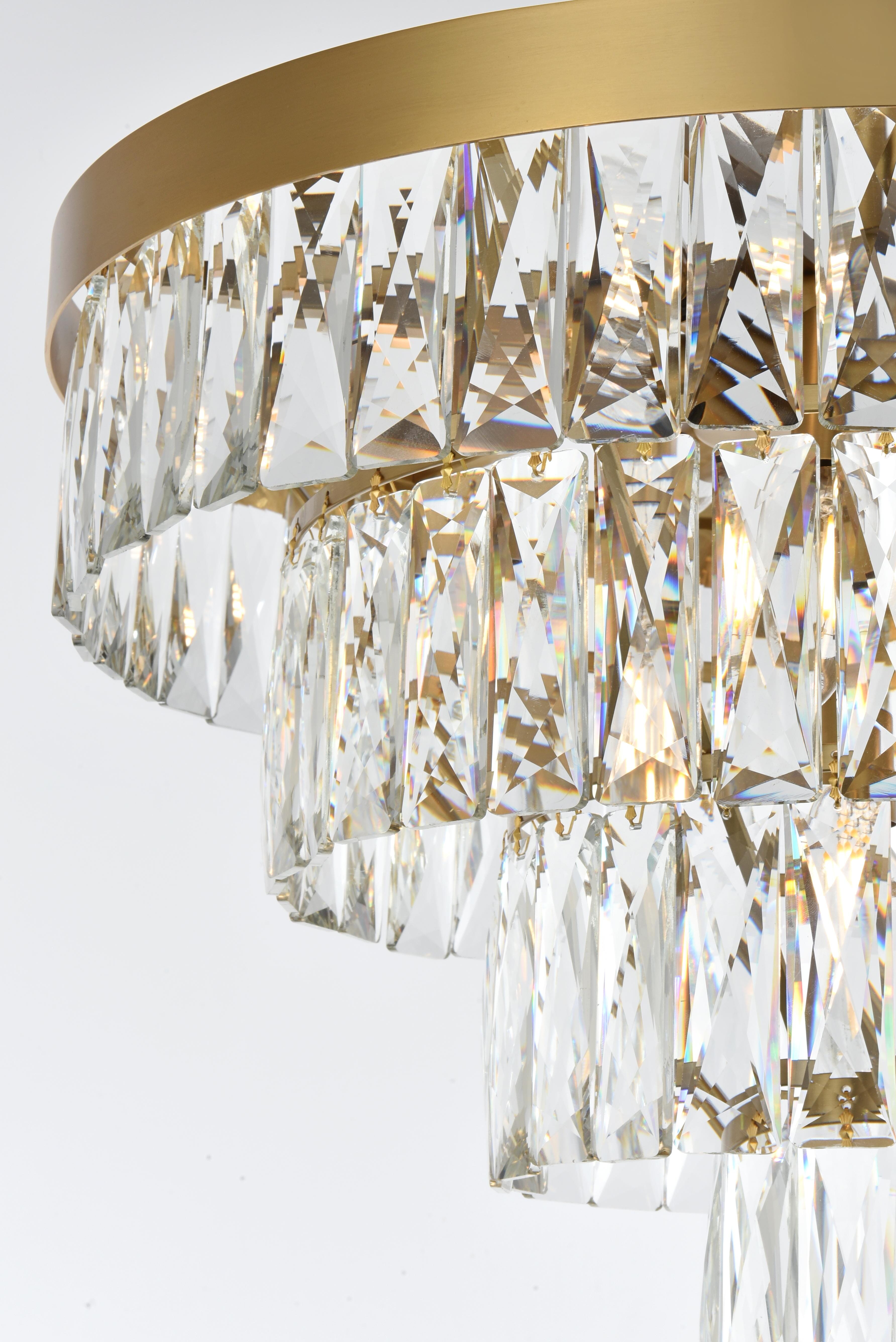 Transform your space with this extraordinary pendant that reimagines classical crystal design for contemporary interiors. The masterfully engineered silhouette features six graduating tiers that create a spectacular inverted pyramid, reminiscent of a frozen cascade captured in mid-descent. Each precisely cut rectangular crystal is strategically positioned to maximize light play, creating mesmerizing displays of fractured light throughout your space. The substantial scale makes this fixture an ideal centerpiece for grand entryways, sophisticated dining rooms, or executive offices. The thoughtful construction incorporates 13 light sources distributed throughout the tiers, ensuring both spectacular illumination and enchanting crystal animation. The robust iron framework provides a secure foundation while maintaining visual lightness, allowing the crystals to appear as if floating in space. Available in reflective chrome, sophisticated black, or warm satin gold, this pendant makes an unforgettable statement while maintaining refined restraint. The cascading arrangement creates a sense of movement and flow, while the geometric precision of each crystal adds contemporary edge to the classical form. This is more than a light fixture – it's an architectural feature that transforms your space through its commanding presence and spectacular light performance.
