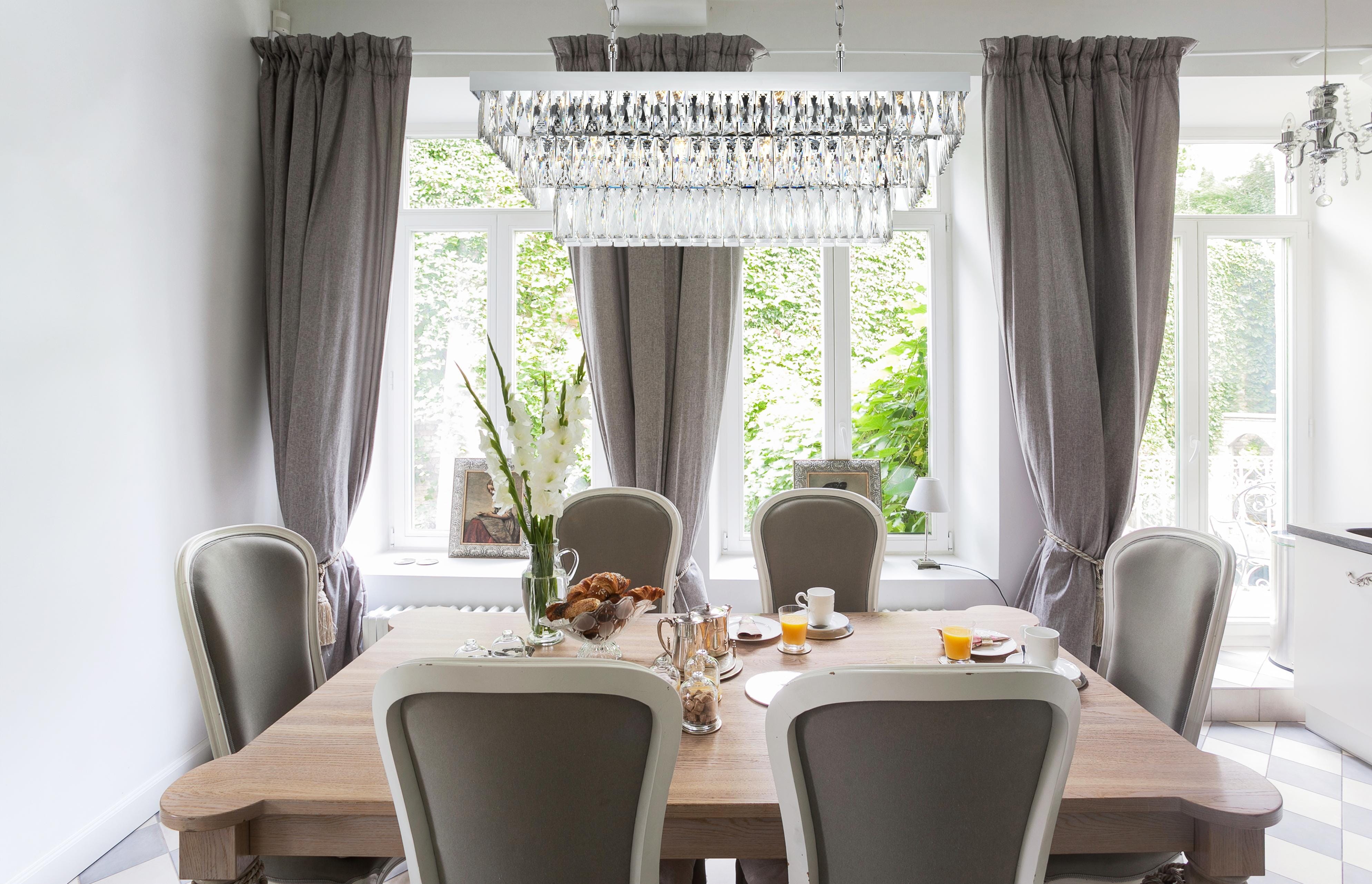 Transform your space with this spectacular linear pendant that reinvents crystal lighting for contemporary interiors. The bold rectangular frame suspends two perfectly proportioned crystal tiers, creating a mesmerizing interplay of light and structure. Each precisely cut crystal is strategically positioned to maximize light play, producing brilliant refractions that dance across your space. The strong horizontal presence makes this fixture an ideal centerpiece above dining tables, conference rooms, or in grand living spaces. The thoughtful construction marries industrial strength with crystalline delicacy, as the robust metal frame appears to float above while supporting the spectacular crystal arrangement. Whether styled in reflective chrome, sophisticated black, or warm satin gold, this pendant commands attention through its architectural presence. The linear composition offers a fresh interpretation of crystal lighting, where clean lines and geometric precision meet the spectacular light performance of premium crystal. This fixture doesn't merely illuminate – it defines space through its commanding horizontal presence while creating an ever-changing display of light and shadow.