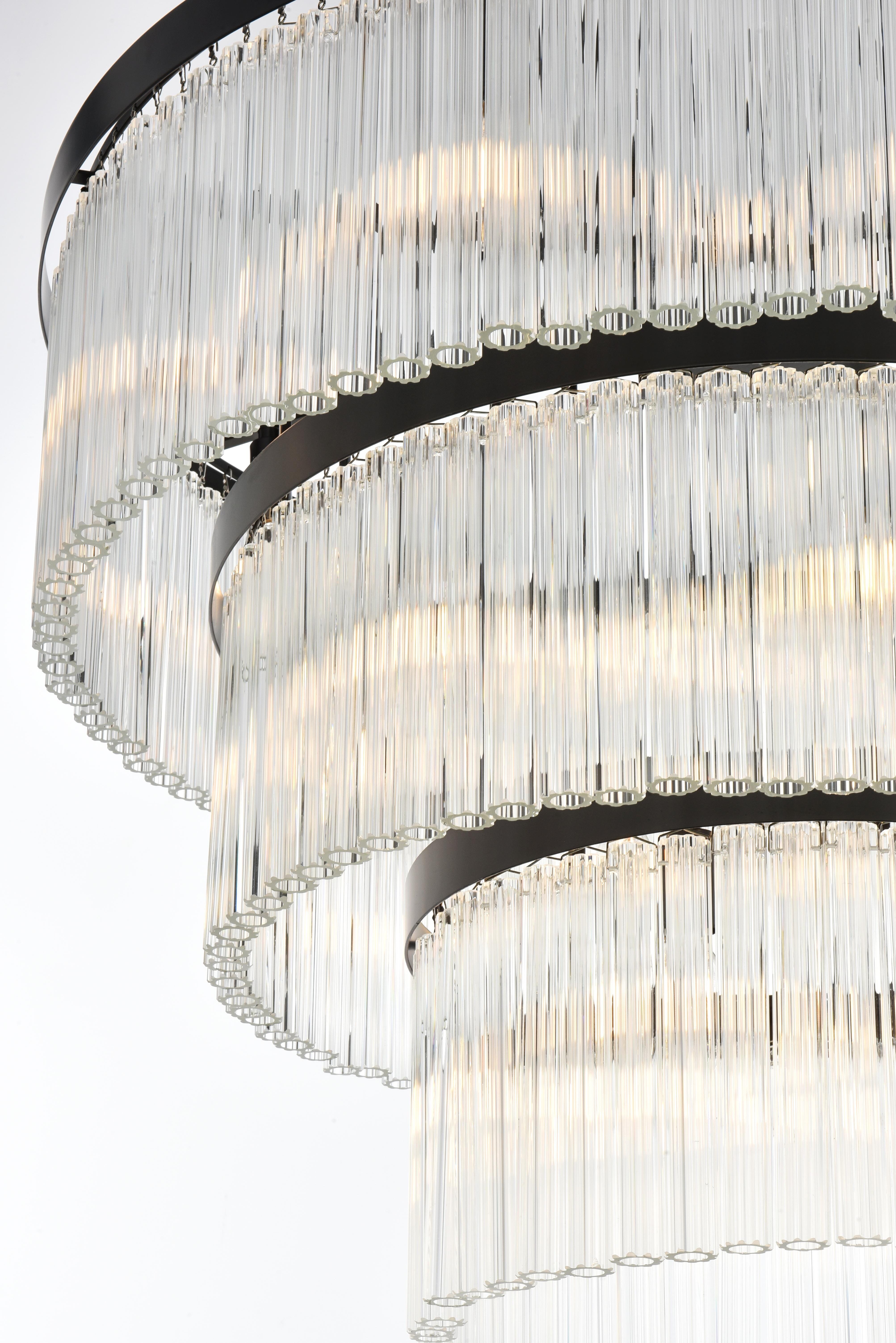 Turn your space into a glowing masterpiece with this striking pendant light, crafted from durable iron and shimmering clear ribbed glass. The cascading layers create a stunning interplay of light and shadow, refracting illumination into a radiant display that transforms your space into an illuminated work of art. Available in chrome for a sleek, contemporary aesthetic, black for bold contrast, and satin gold for an inviting warmth, this pendant light is as versatile as it is beautiful. Whether you choose a single tier for minimalist charm, two tiers for balanced depth, three tiers for bold presence, or four tiers for show-stopping grandeur, there’s an option for every setting. Featuring both round and rectangular frame designs, this fixture adapts to any space with ease. Complete with a matching canopy and chain, and fully dimmable for customized lighting, this pendant pairs perfectly with the coordinating single-tier flush mount and wall sconce collection, ensuring a cohesive, radiant design throughout your home or office. Please note: light bulbs are sold separately.