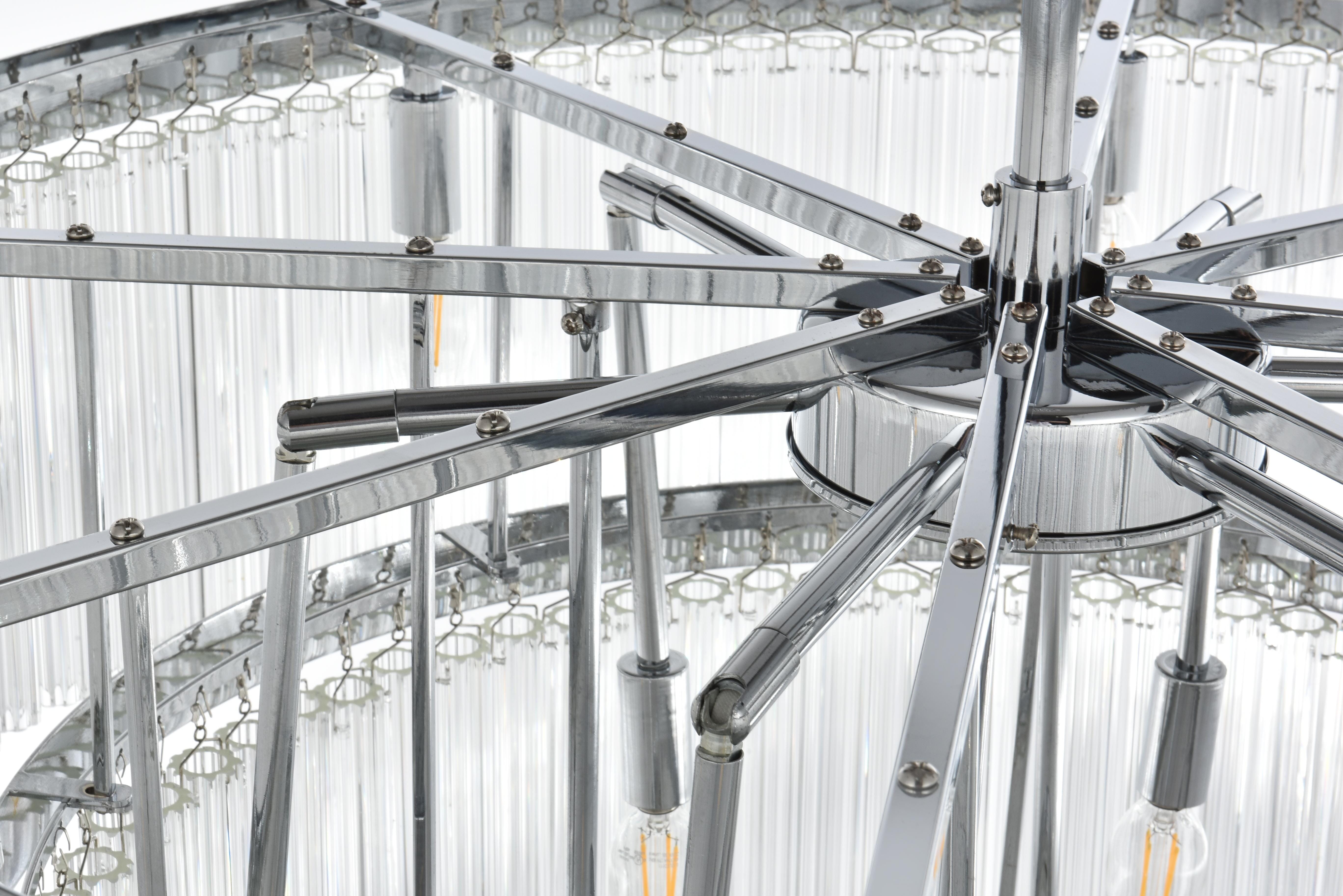Turn your space into a glowing masterpiece with this striking pendant light, crafted from durable iron and shimmering clear ribbed glass. The cascading layers create a stunning interplay of light and shadow, refracting illumination into a radiant display that transforms your space into an illuminated work of art. Available in chrome for a sleek, contemporary aesthetic, black for bold contrast, and satin gold for an inviting warmth, this pendant light is as versatile as it is beautiful. Whether you choose a single tier for minimalist charm, two tiers for balanced depth, three tiers for bold presence, or four tiers for show-stopping grandeur, there’s an option for every setting. Featuring both round and rectangular frame designs, this fixture adapts to any space with ease. Complete with a matching canopy and chain, and fully dimmable for customized lighting, this pendant pairs perfectly with the coordinating single-tier flush mount and wall sconce collection, ensuring a cohesive, radiant design throughout your home or office. Please note: light bulbs are sold separately.