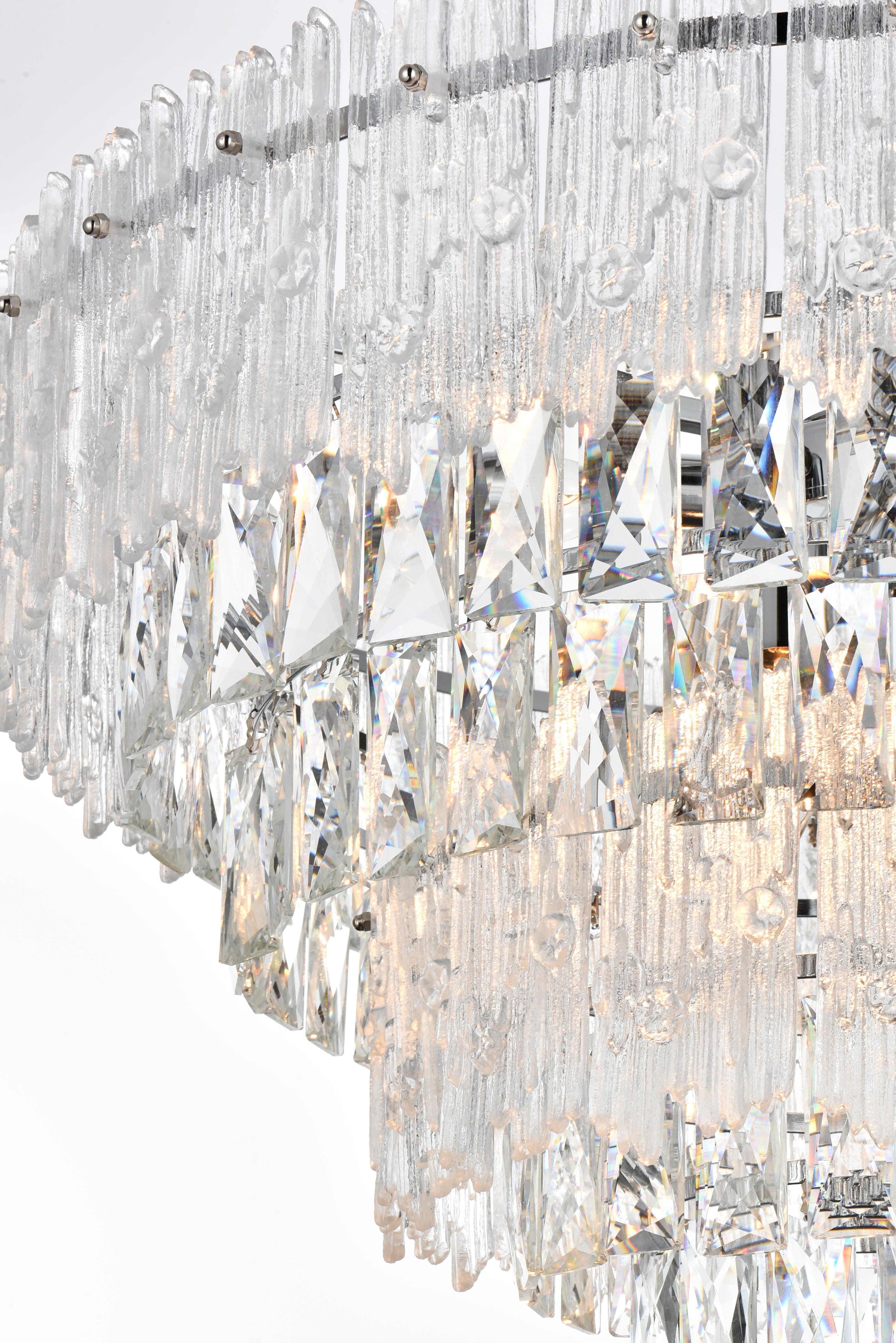 Transform your home with the opulent charm of this indoor lighting, meticulously designed to make a statement in any space. The light fixture showcases an intricate array of precision-cut clear crystals, each expertly faceted to maximize light refraction and create a dazzling display of brilliance. These crystals are complemented by textured glass accents that add depth and visual interest, casting a soft, shimmering glow across the room. Available in your choice of chrome or satin gold finishes, it is the epitome of luxury and modern elegance. As part of a coordinated collection, it also includes matching chandeliers, wall sconces and flush mounts, allowing you to create a harmonious lighting scheme throughout your home.