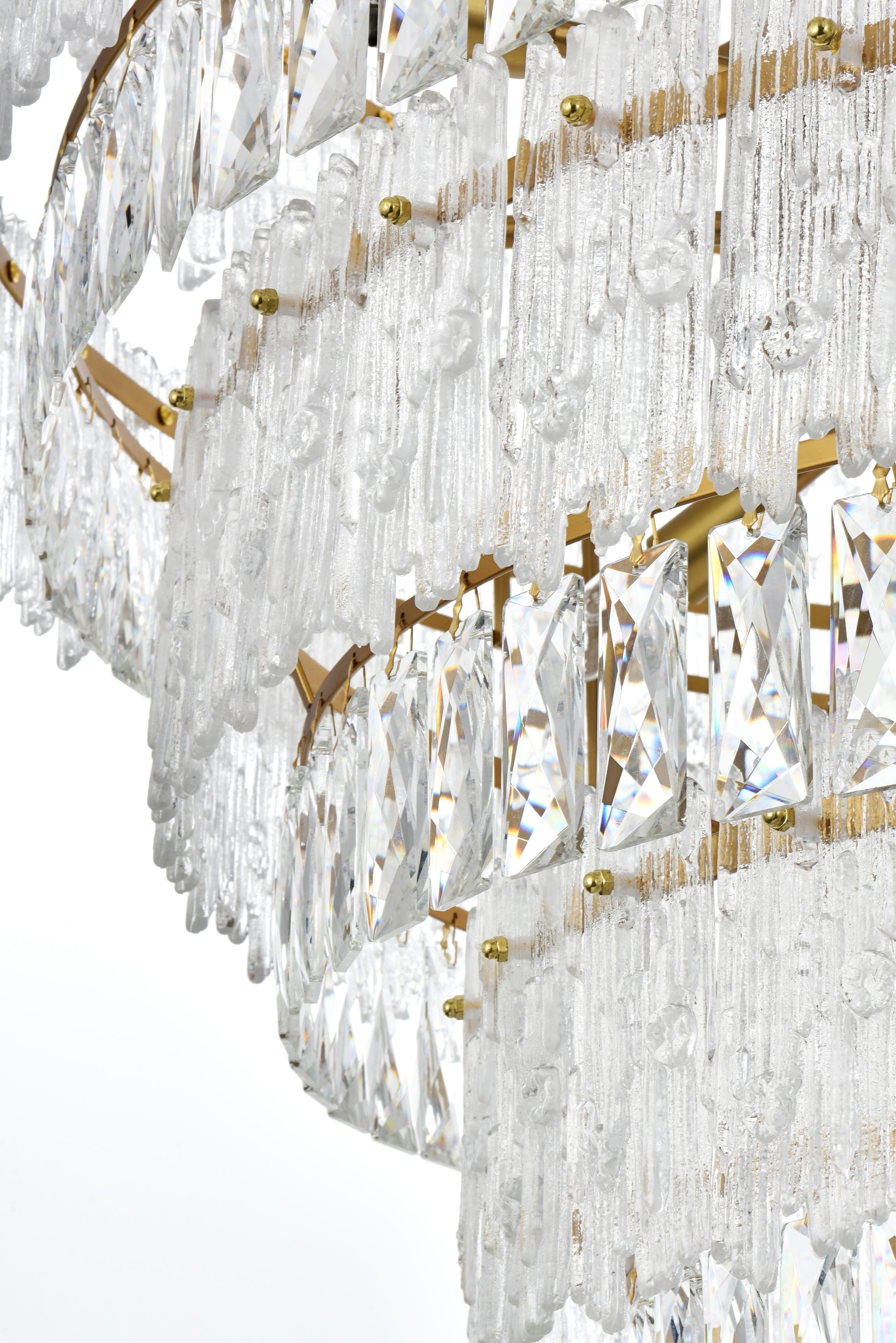 Transform your home with the opulent charm of this indoor lighting, meticulously designed to make a statement in any space. The light fixture showcases an intricate array of precision-cut clear crystals, each expertly faceted to maximize light refraction and create a dazzling display of brilliance. These crystals are complemented by textured glass accents that add depth and visual interest, casting a soft, shimmering glow across the room. Available in your choice of chrome or satin gold finishes, it is the epitome of luxury and modern elegance. As part of a coordinated collection, it also includes matching chandeliers, wall sconces and flush mounts, allowing you to create a harmonious lighting scheme throughout your home.