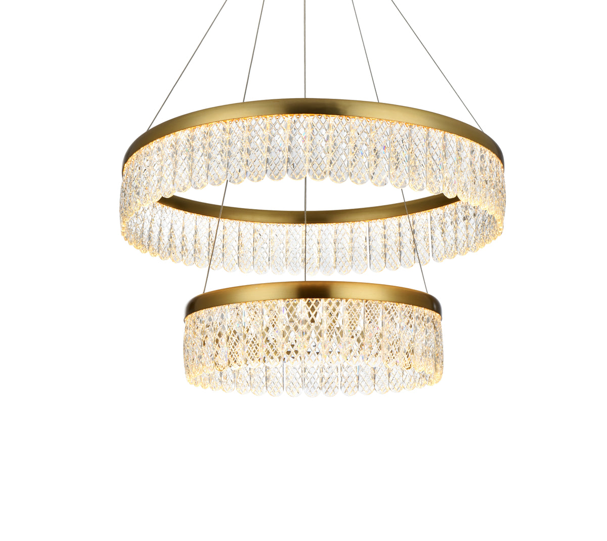 Illuminate your space with the Rune 24 inch LED chandelier, boasting two tiers gracefully adorned with crystals through which the light is elegantly diffused, creating a captivating interplay of radiance and elegance. The integrated LED lights provide energy-efficient and enduring brightness, seamlessly blending modern design with functional efficiency. Meticulously crafted from iron and aluminum, this chandelier exudes modern sophistication while ensuring durability. The distinctive argyle design of the royal cut crystals adds a touch of opulence, while the discreet toggle switch on the canopy provides convenient control, allowing you to effortlessly tailor the lighting settings to suit your preferences. Elevate your home with this versatile and elegant lighting solution. With a simple flick, effortlessly transition between three distinct color temperatures—3000K for warm and cozy moments, 4500K for a balanced ambiance, and 6000K for a crisp, invigorating brightness. This innovative toggle switch empowers you to set the mood and adapt the lighting to suit various occasions. Whether you seek a relaxed evening glow, a neutral and focused atmosphere, or a vibrant and energizing radiance, our chandelier provides the flexibility to cater to your preferences.