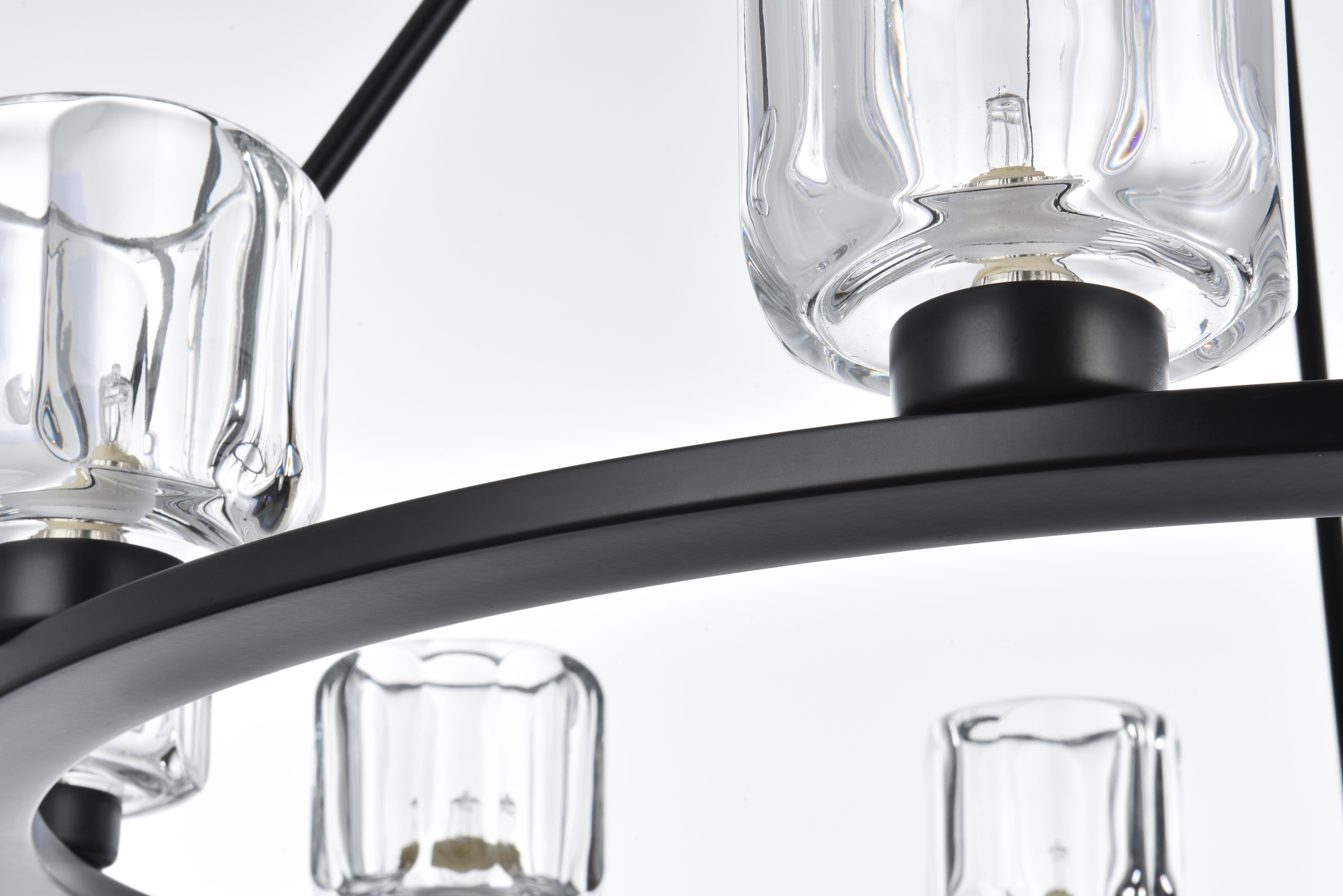 Add modern charm to your space with this striking chandelier, where a sleek circular iron frame meets sculpted clear glass shades. The unique design features decorative hanging rods with hooks, enhancing the structure with industrial flair. The clear glass refracts light beautifully, creating a radiant glow that uplights your space with warmth and dimension. Perfect for dining rooms, living rooms, or offices, this chandelier is available in black for a bold contrast, satin gold for a luxurious touch, and chrome for a sleek, modern vibe. With multiple size options and a matching canopy and chain for seamless installation, this dimmable chandelier offers both beauty and versatility. Light bulbs are not included, allowing you to choose the perfect style to match your vision.