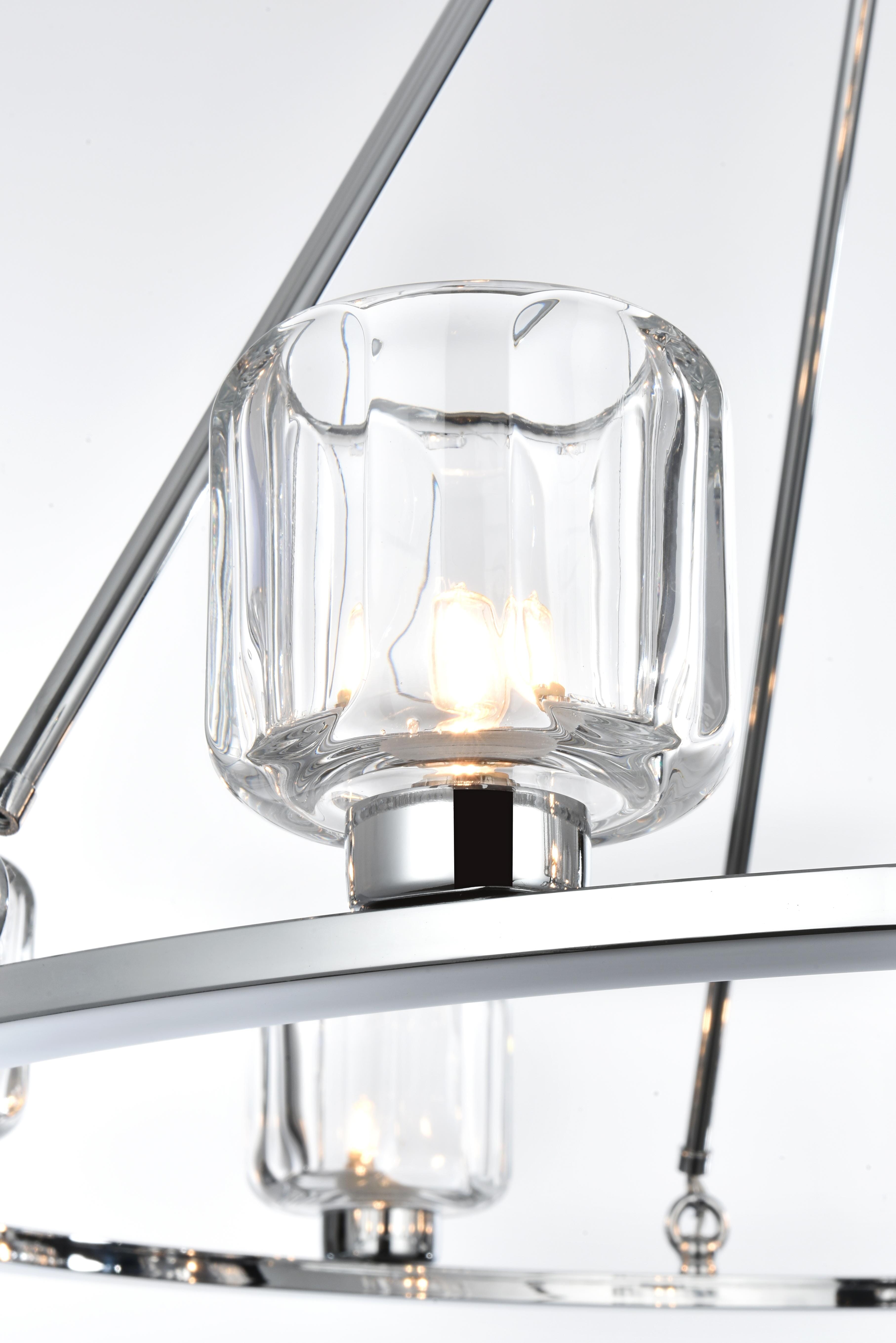 Add modern charm to your space with this striking chandelier, where a sleek circular iron frame meets sculpted clear glass shades. The unique design features decorative hanging rods with hooks, enhancing the structure with industrial flair. The clear glass refracts light beautifully, creating a radiant glow that uplights your space with warmth and dimension. Perfect for dining rooms, living rooms, or offices, this chandelier is available in black for a bold contrast, satin gold for a luxurious touch, and chrome for a sleek, modern vibe. With multiple size options and a matching canopy and chain for seamless installation, this dimmable chandelier offers both beauty and versatility. Light bulbs are not included, allowing you to choose the perfect style to match your vision.