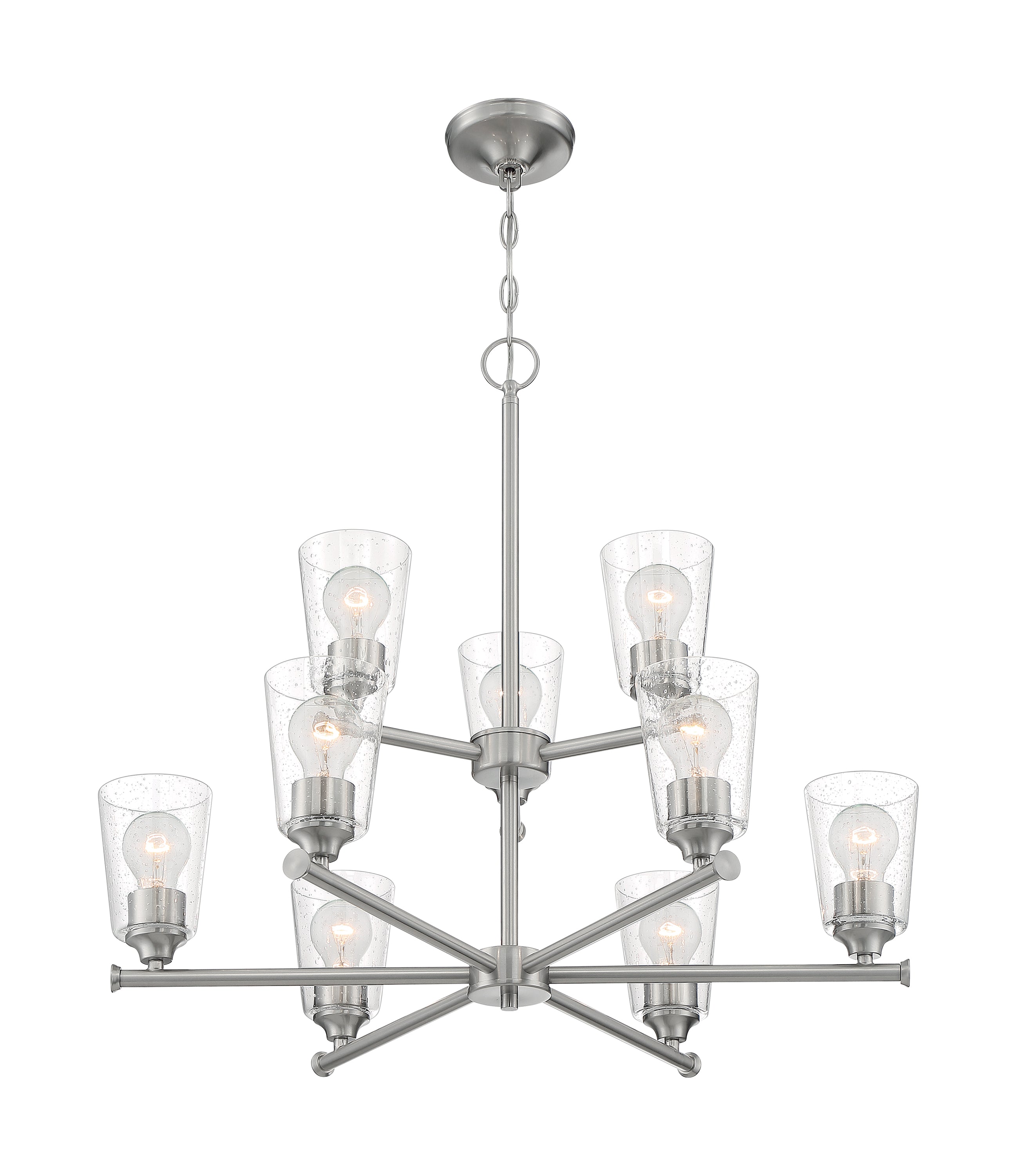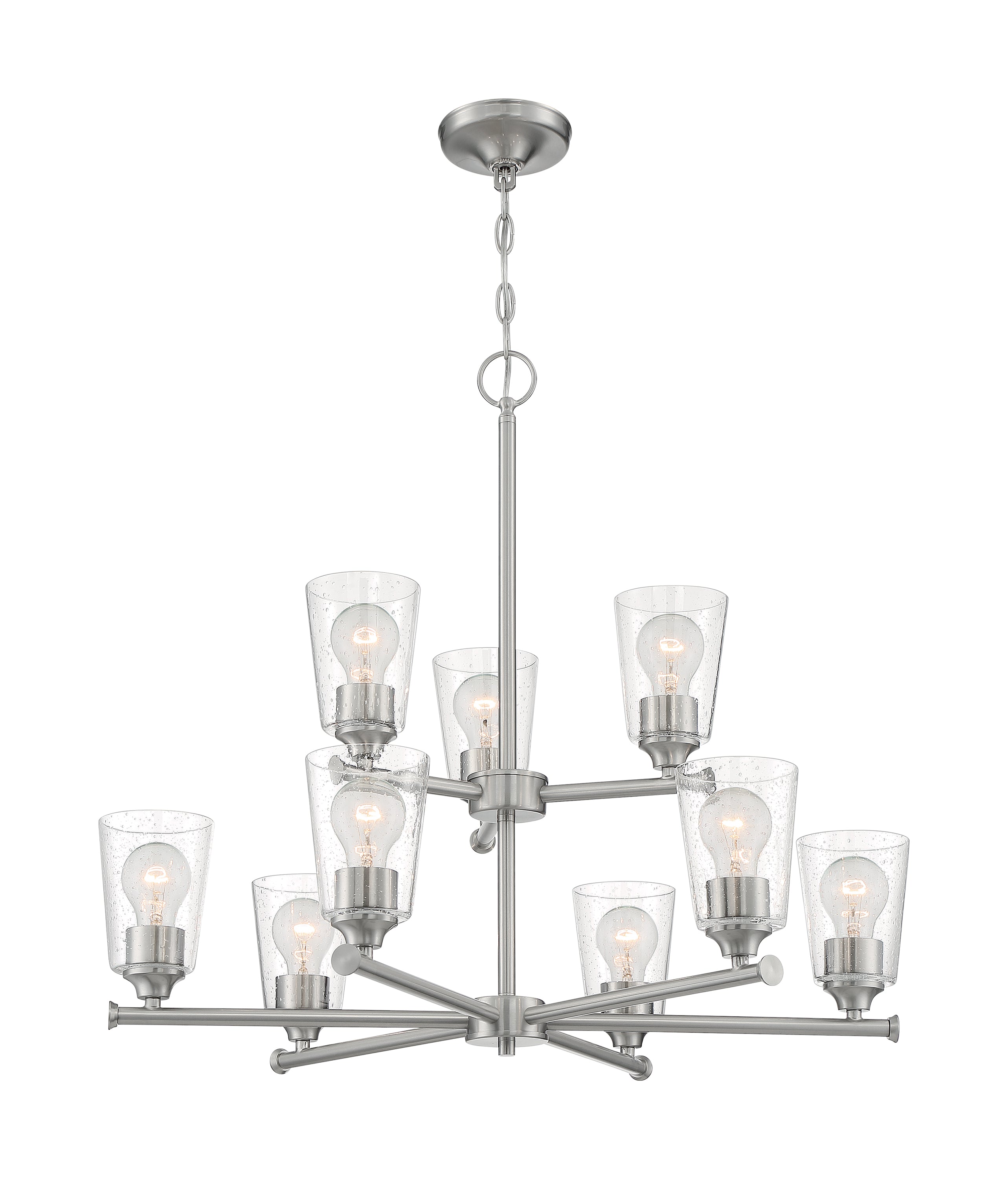 The seeded glass goblet shades provide an accent to the Brushed Nickel finish on the Bransel 2 tier - 9 light chandelier. The sleek, streamlined appearance of the Bransel chandelier strikes a balance and compliments both the popular modern farmhouse style or can be at home in a coastal setting. 28 inches diameter by 25 inches in height, the Bransel 2 tier chandelier is perfect for high ceiling applications.