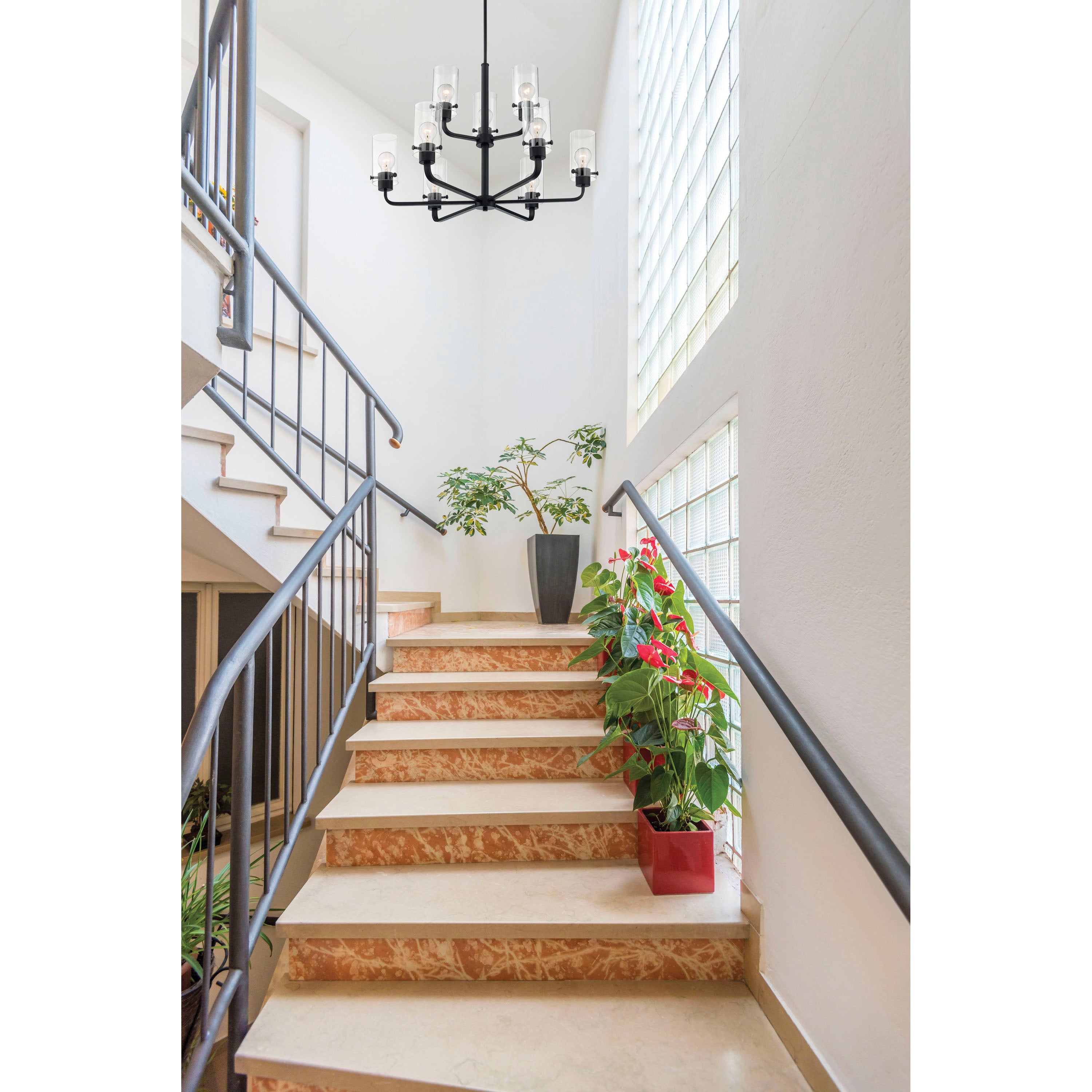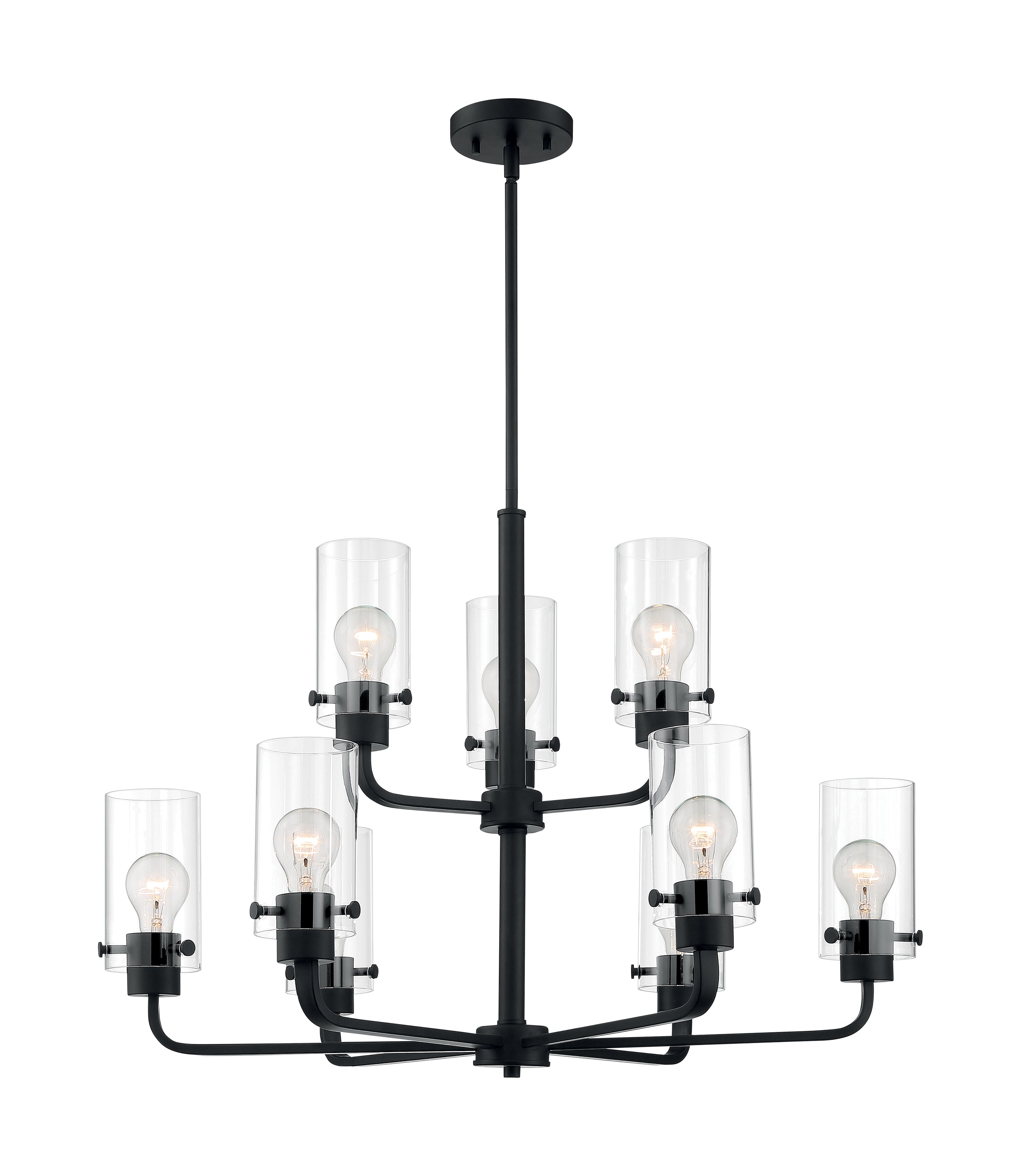 The Sommerset nine-light chandelier complements both modern and transitional styles. Nine bulbs sit inside clear glass, for a sleek, streamlined design. This 2 tier chandelier is perfect for high ceiling applications.