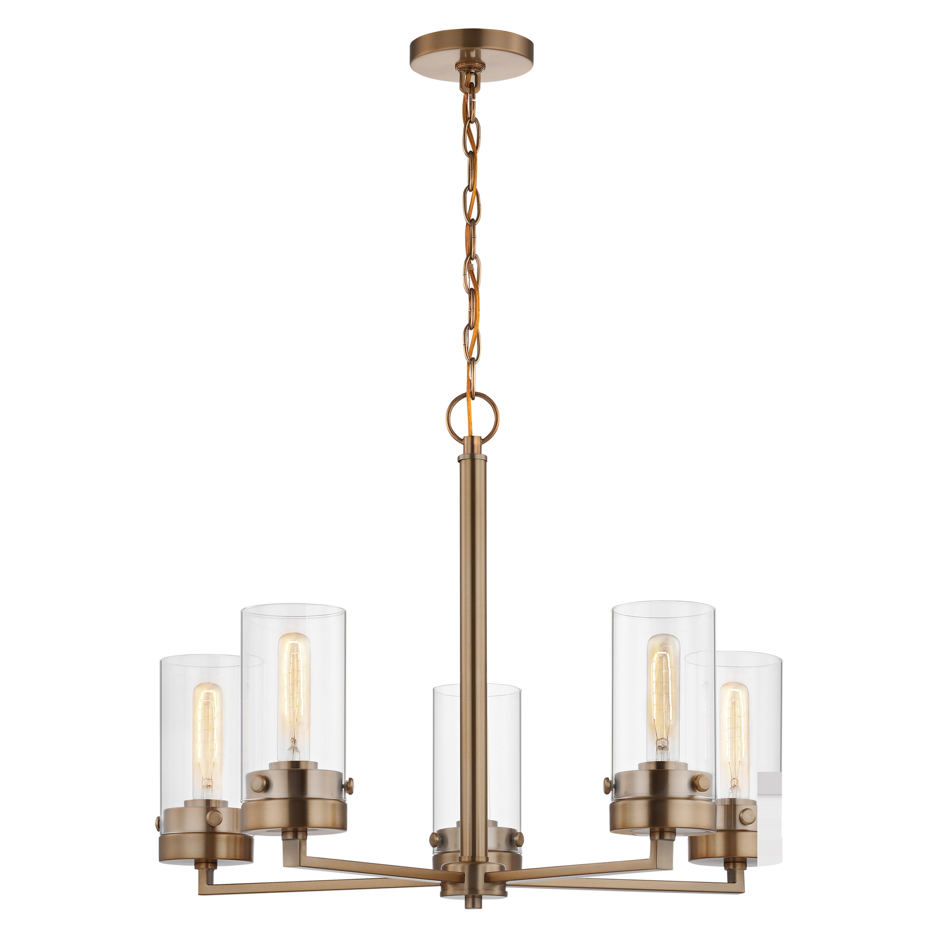 The blend of styles (modern, industrial and chic) is incorporated beautifully into the design of the Intersection chandelier. The cylindrical clear glass shades showcase vintage filament bulbs for a touch of nostalgia. The luster of the rich, burnished brass will pair superbly with existing finishes. Apply to the dining room or over the kitchen island. The Intersection is a stylish addition to any room.