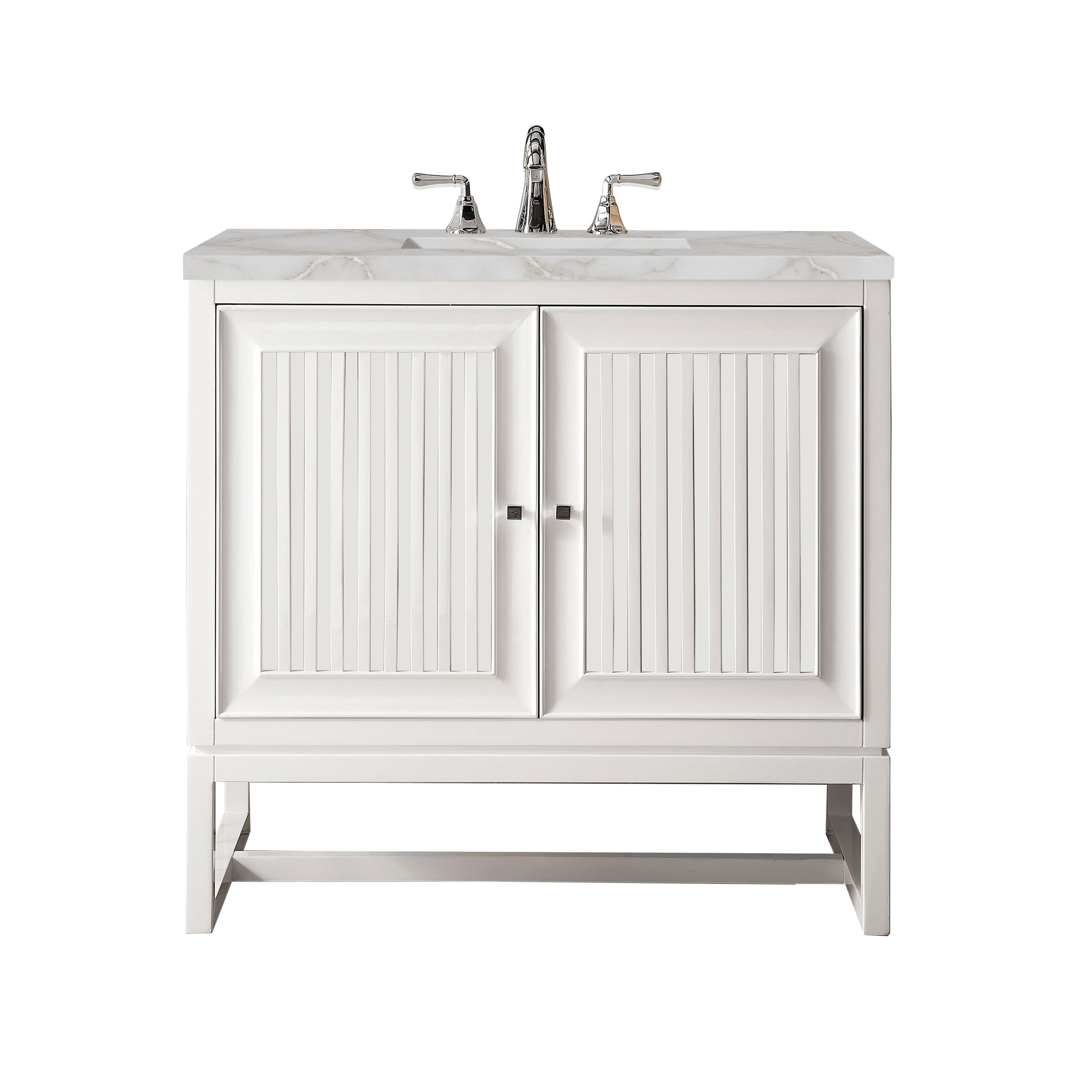 Customize your space with the Athens 36” Glossy White Single Vanity by James Martin Vanities. Part of the larger Athens modular collection, this incredible Vanity boasts an impressive amount of storage space and combines traditional charm with modern functionality. Premium standard features include soft-close undermount drawer glides and adjustable door hinges, brushed aluminum laminate drawer bottoms, and one bamboo drawer organizer. The Bright White finish is accented by the neutral background of the Victorian Silver Silestone top, boasting champagne metallic accents which seamlessly complement wood tones.