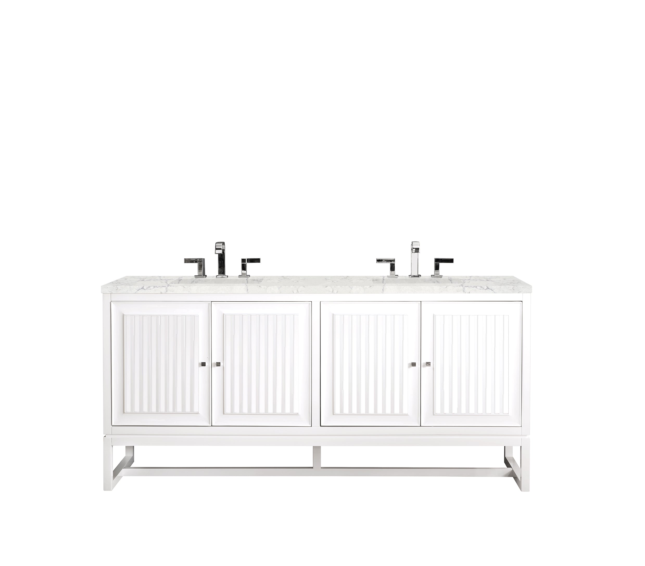 Bring a bit of the Greek Island home with the Athens 72” Glossy White Double Vanity by James Martin Vanities. Part of the larger Athens modular collection, this incredible Vanity boasts an impressive amount of storage space and combines traditional charm with modern functionality. Premium standard features include soft-close undermount drawer glides and adjustable door hinges, brushed aluminium laminate drawer bottoms, and one bamboo drawer organizer. The look is completed with a 3 CM eased edge Eternal Marfil Silestone top and two white ceramic rectangular sinks.