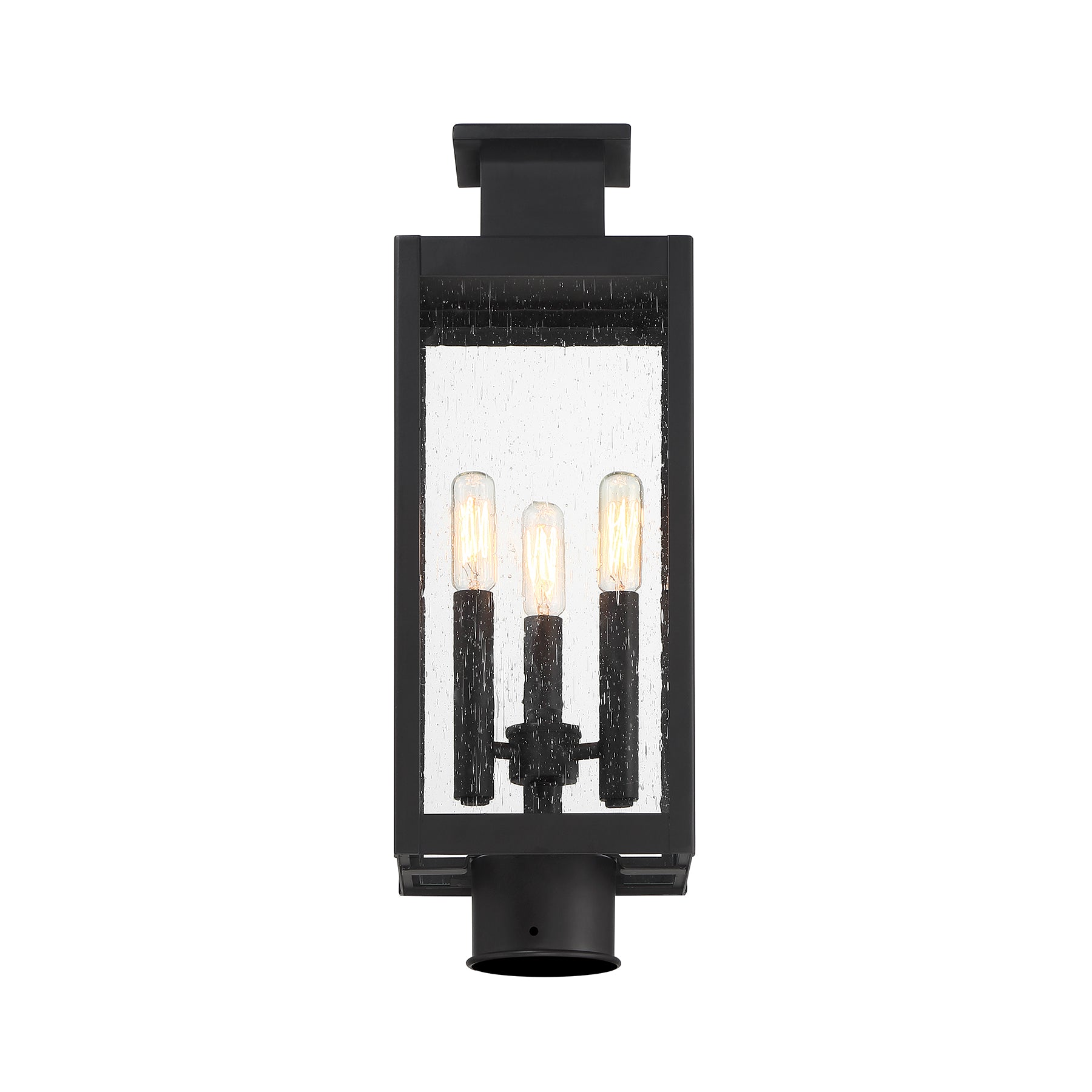 The Savoy House Ascott 3-light outdoor post lantern is a standout source of cool contemporary lighting style for great first impressions. Sleek and slender, Ascott features lights inside panes of clear seeded glass in a sharply angled frame. Matte Black finish. Ascott is 18.75" in height and 6.5" in width. Uses three candelabra size bulbs of up to 60 watts per bulb. Bulbs not included. Wet area rated.