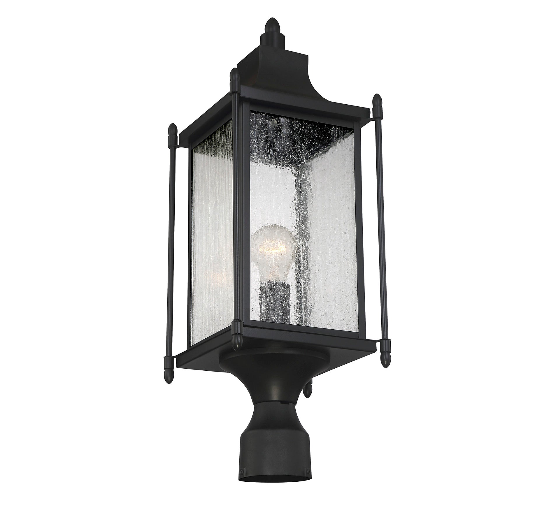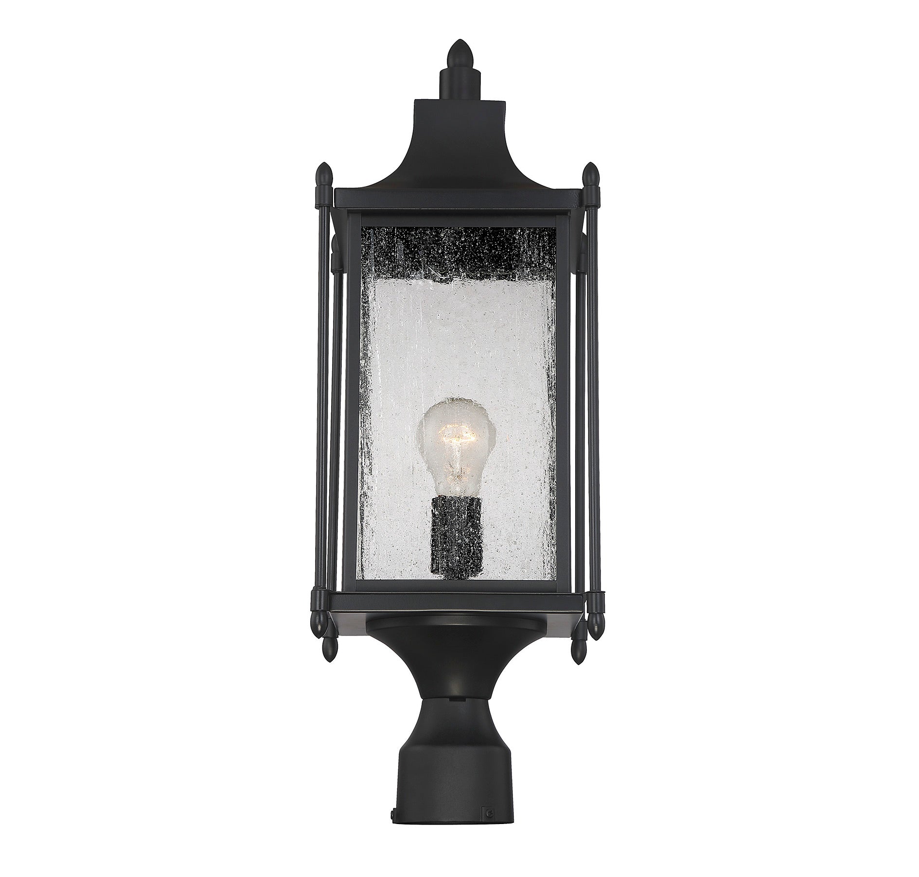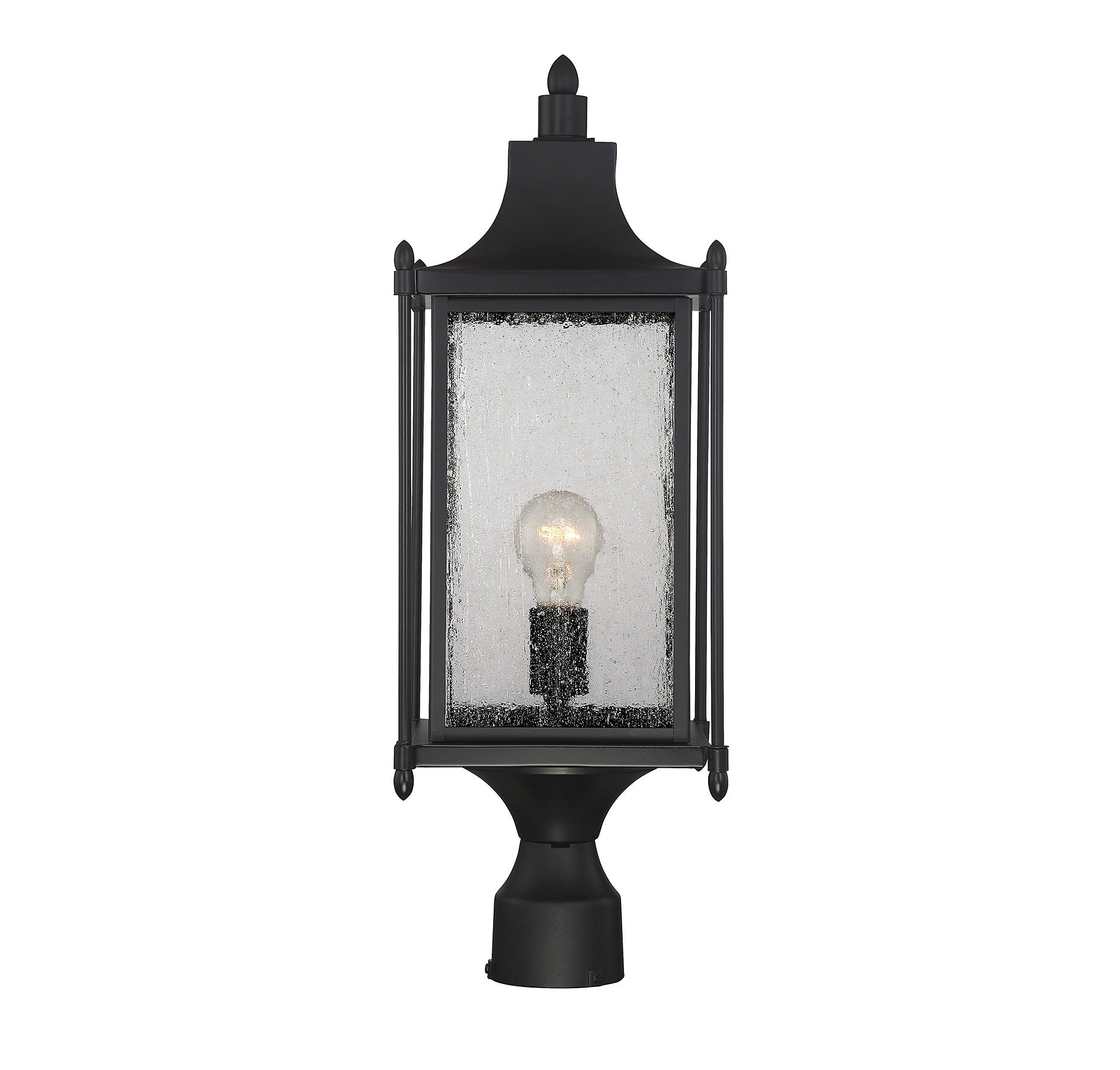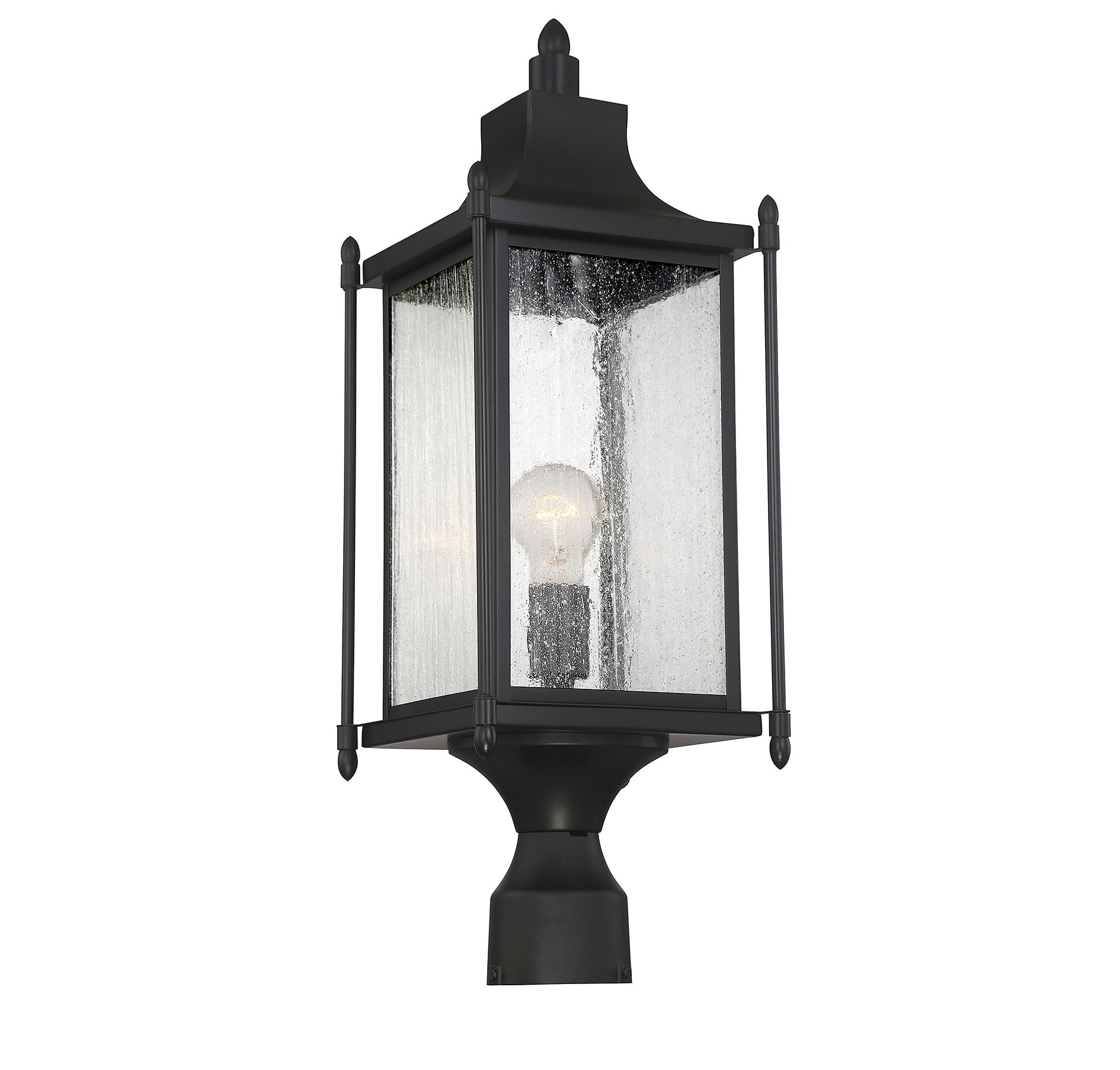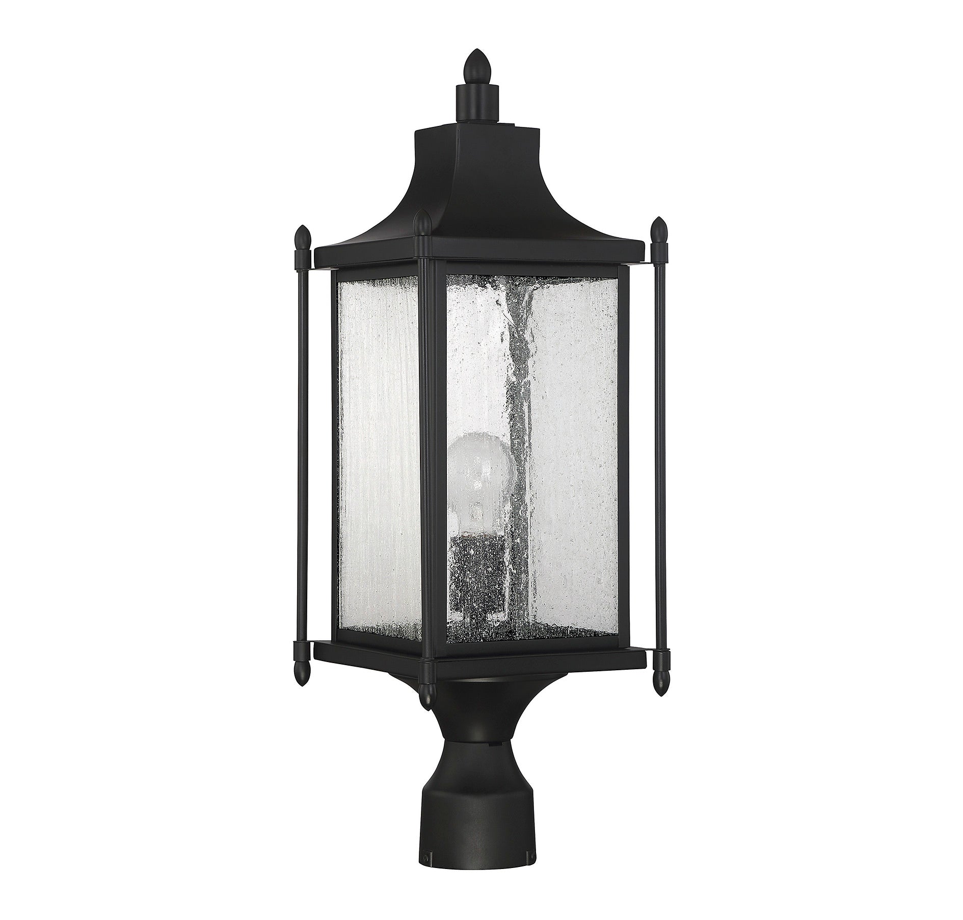 Featuring a design that is classic Americana, this Savoy House Dunnmore 1-light outdoor post light adds timeless elegance to the outdoor areas of your home. A high quality black finish blends incredibly well with many other hardware types and architectural materials. The traditional box shape is enhanced with slim outer columns, delightful finials and a graceful curved mansard roof. Panes of beautiful clear seeded glass add to the vintage charm and this wall lantern holds one 60W standard size bulb for ample, safe and welcoming illumination. It’s 8" wide, 23.5" high and UL rated for wet locations, so it's perfect to give inviting, classic style to your porch, patio, sunroom, pergola or other walls of your outdoor living areas.