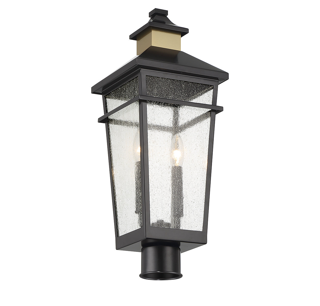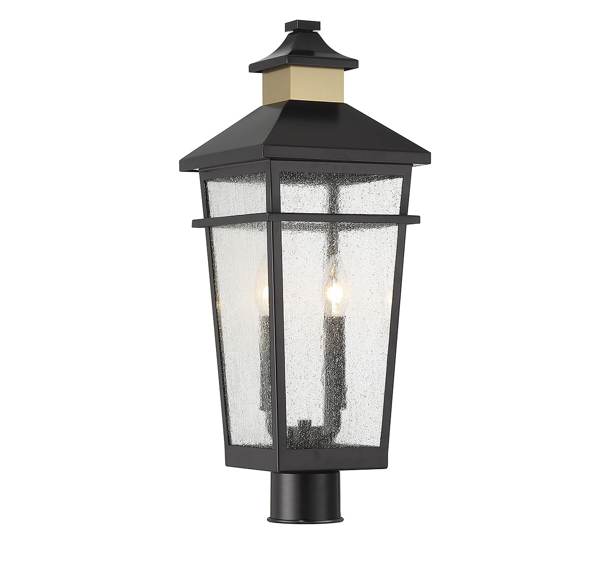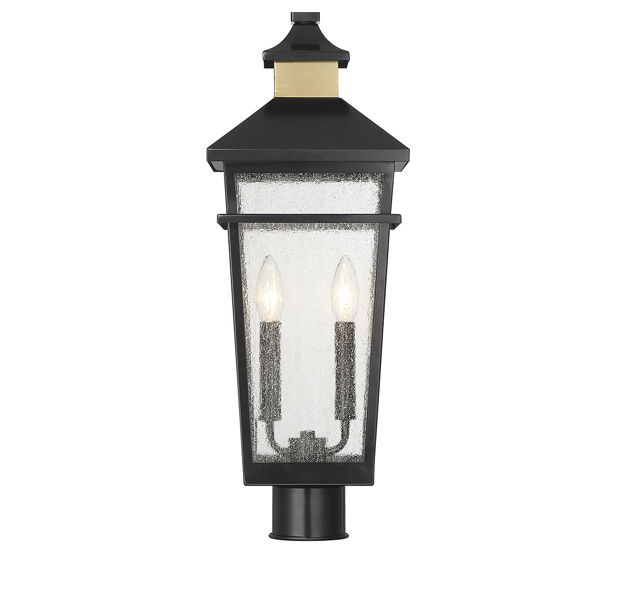 This Savoy House Kingsley 2-light outdoor post light has a coastal-inspired lantern style with highly fashionable touches. Panes of seedy glass are accentuated by a matte black finish with brass detailing at the hood. Kingsley is 22.5" in height and 8.5" in width. It uses 2 candelabra size bulbs of up to 60 watts per bulb (bulbs not included).