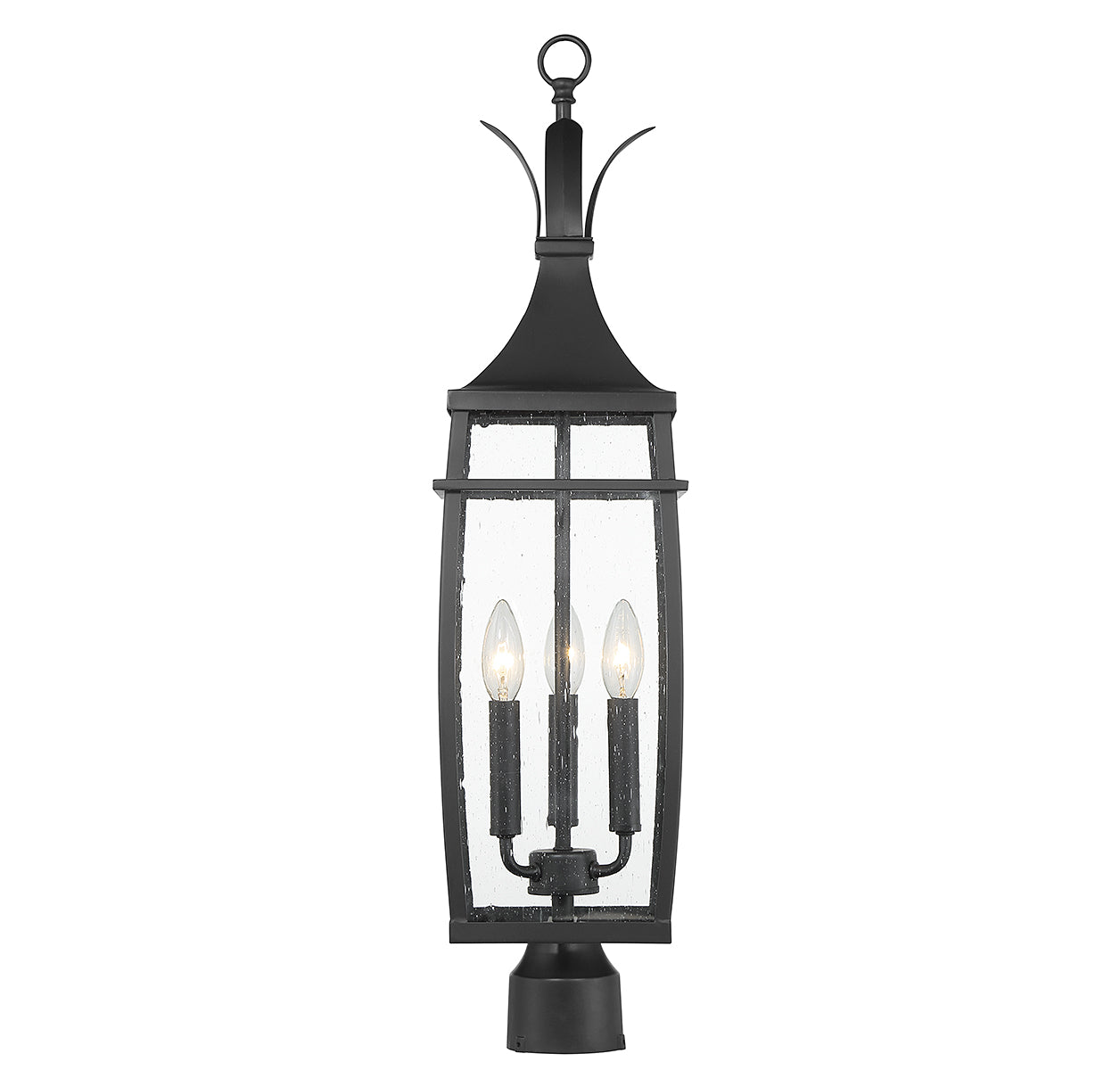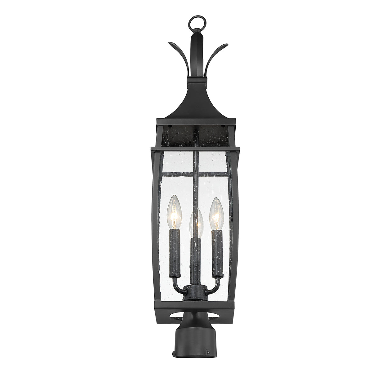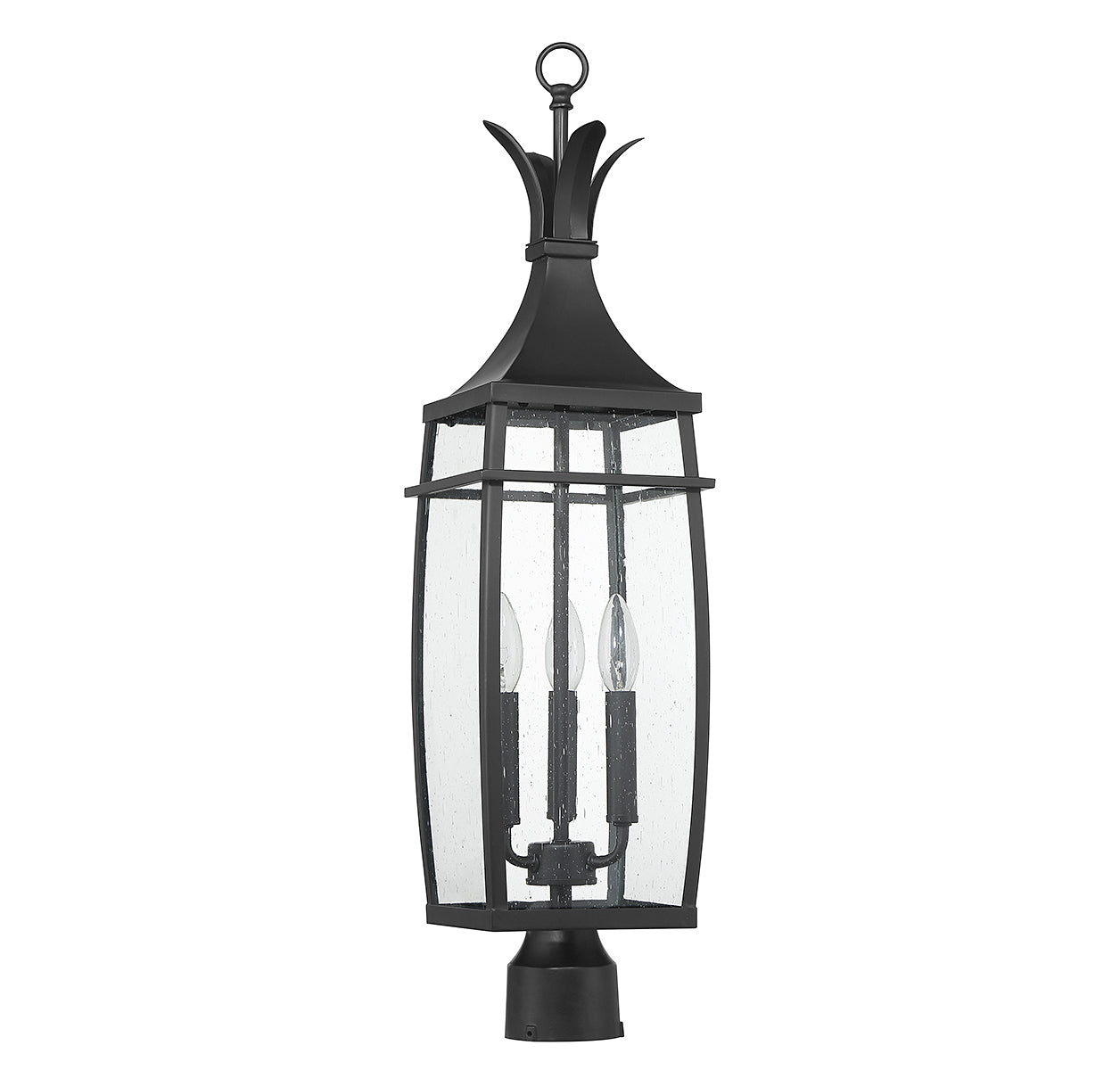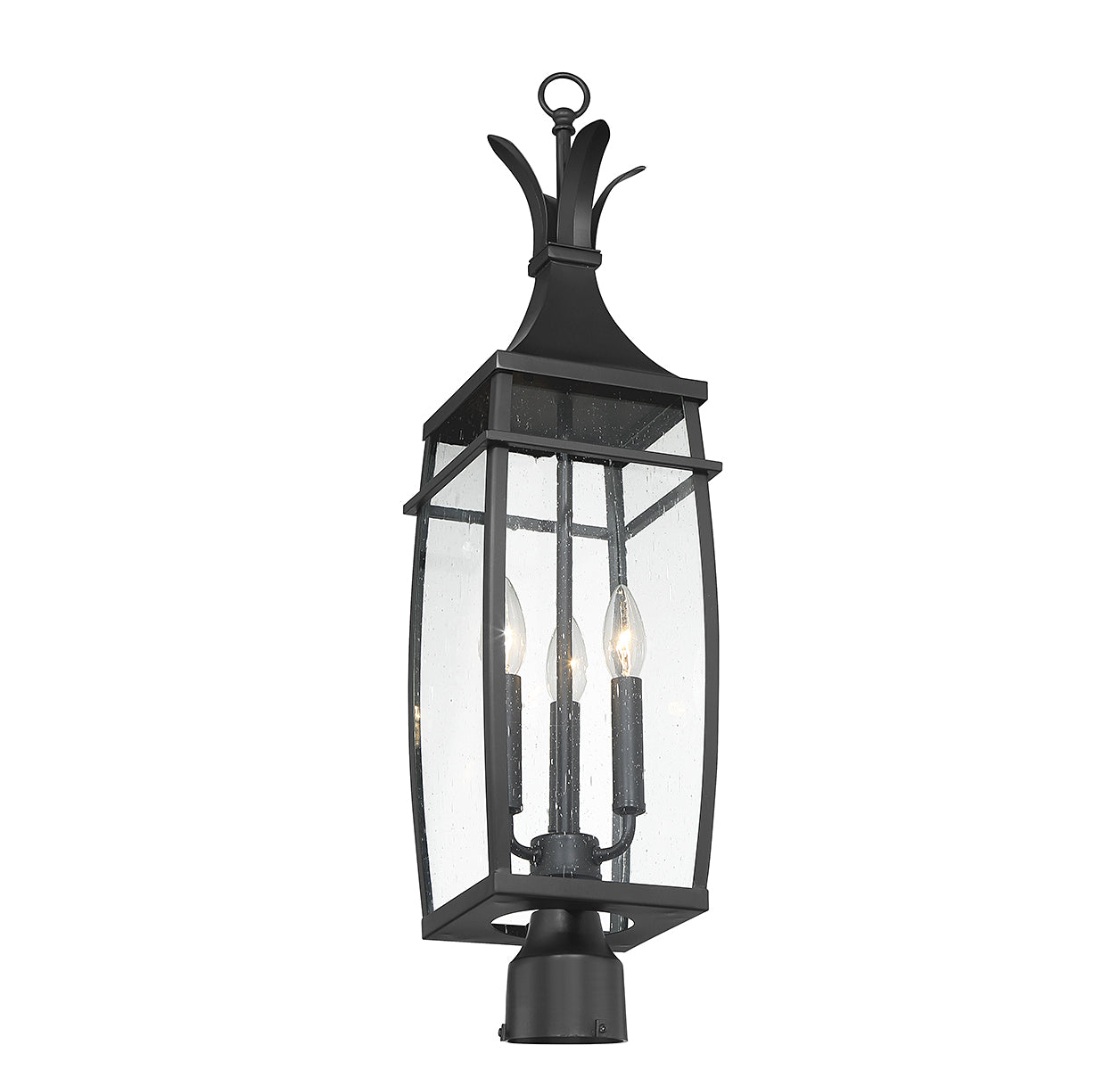 A hint of nature-inspired detailing decorates the top of this Savoy House Montpelier 3-light outdoor post light. Its slightly curved structure features panes of clear seeded glass and is finished in a classic matte black. Montpelier is 29" in height and 7.5" in width. It uses 3 candelabra size bulbs with a max of 60 watts per bulb (bulbs not included).