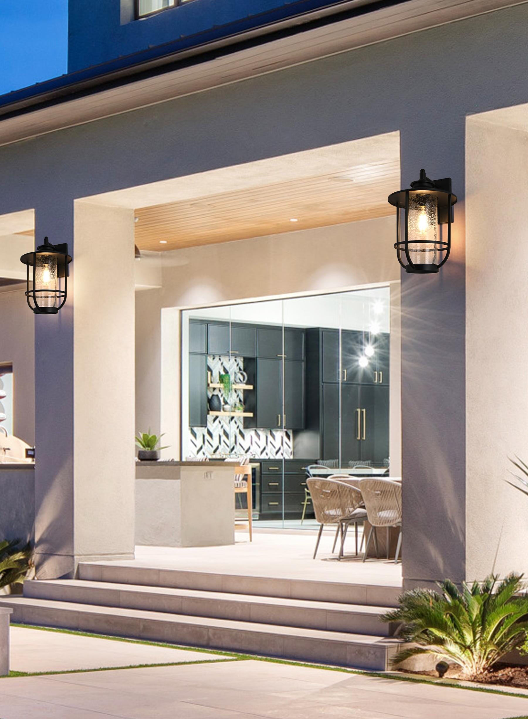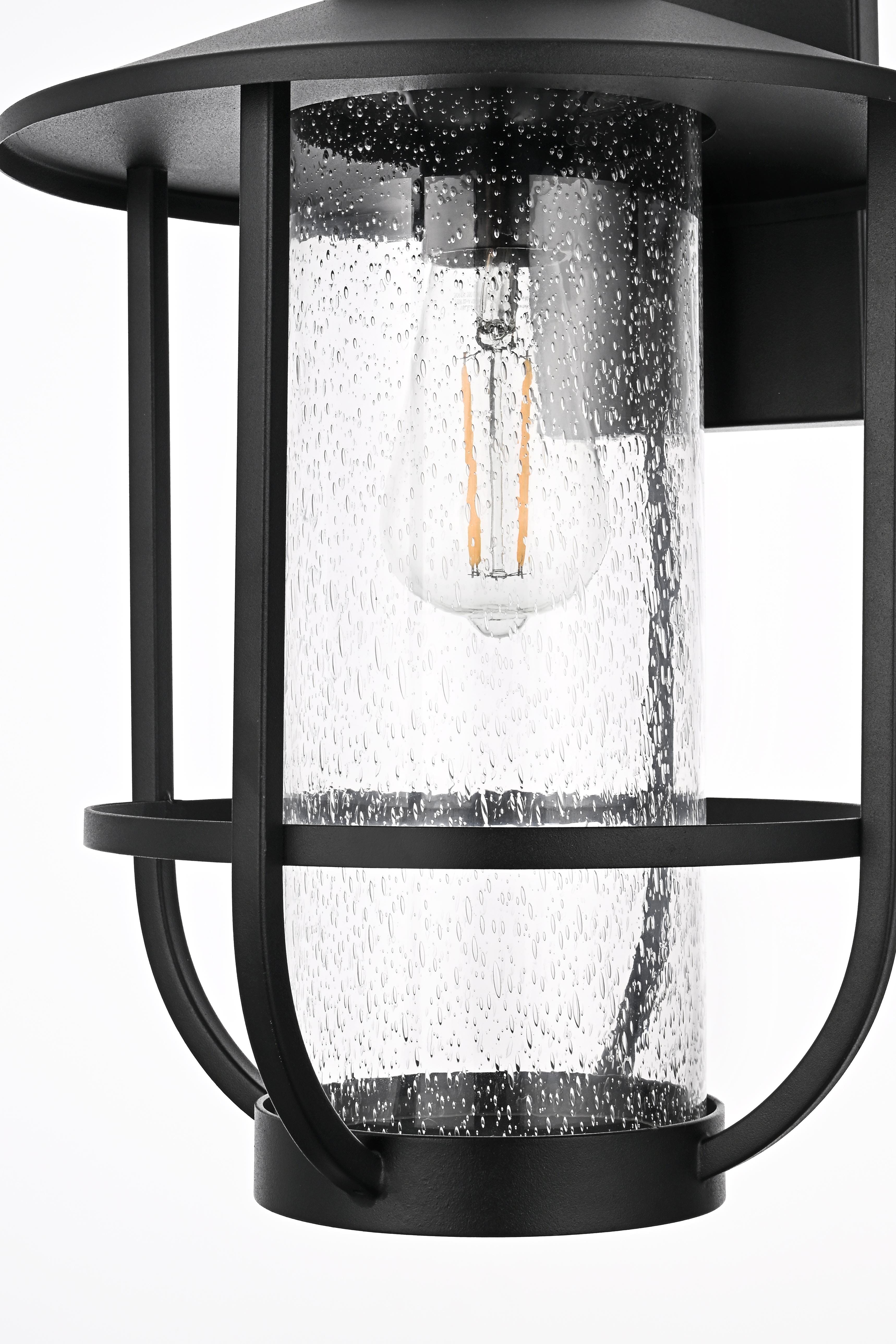 Add character and warmth to your outdoor space with this beautifully crafted iron and glass wall sconce. The sleek black iron frame holds a clear seeded glass shade that provides a rustic yet modern charm, while also ensuring maximum illumination for your entrance, porch, or patio. The fixture has a broad metal hat shade that directs light downwards, creating a comforting atmosphere while adding a touch of industrial flair. Designed to endure all types of weather, this wall sconce is made to last and maintain its beauty for years to come. It blends traditional and contemporary styles, making it versatile for almost any home exterior. The iron framework wraps around the glass for added visual interest, while the seeded glass creates a stunning glow, turning your entryway into a welcoming beacon.