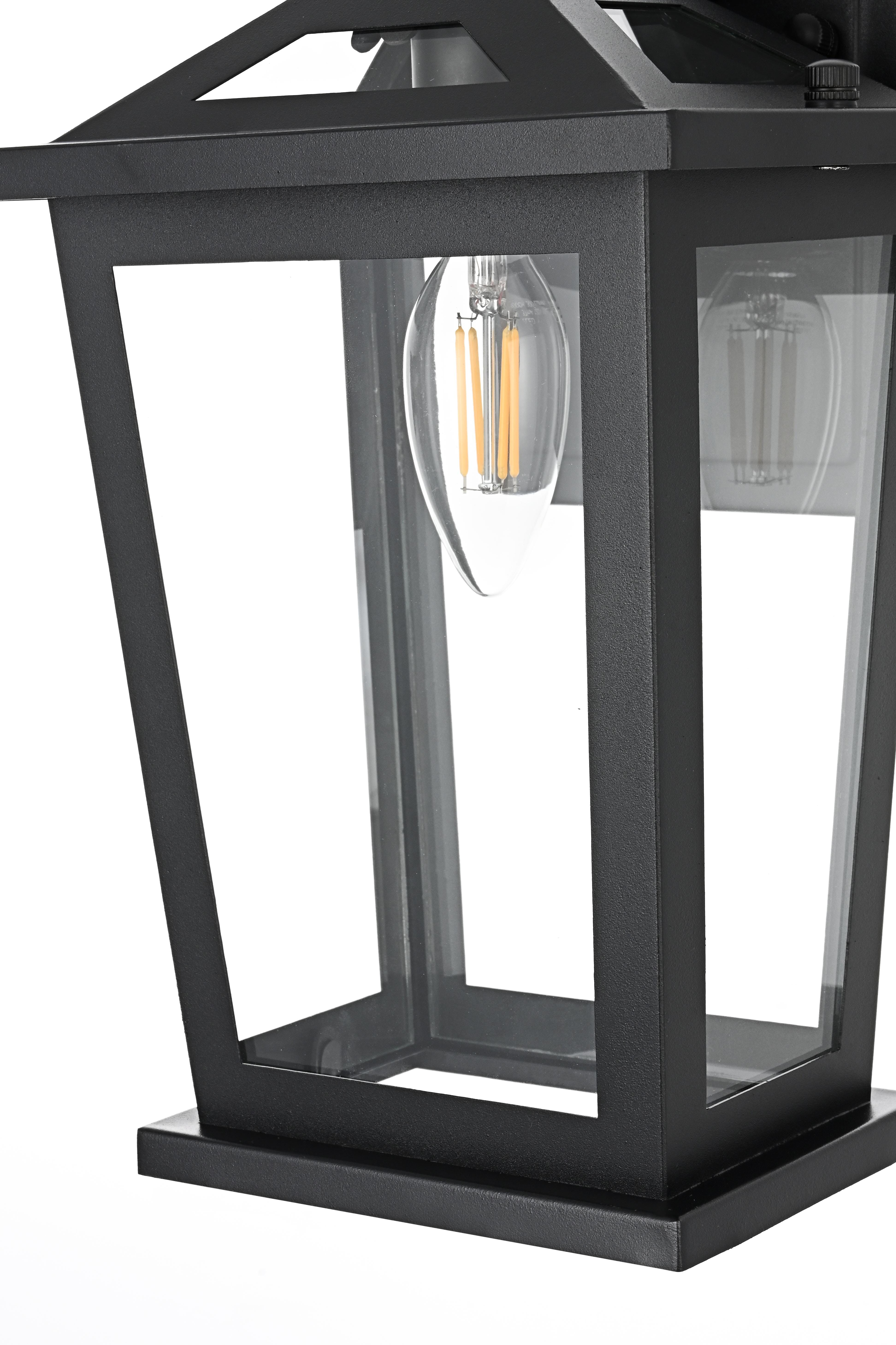 Enhance your outdoor space with this stylish wall sconce that features a striking matte black frame paired with clear glass panels, perfectly showcasing its modern charm. The latern box shape is adorned with a distinctive triangular loop on top, adding a unique architectural touch that seamlessly combines functionality with a bold, sleek aesthetic. The open bottom design allows for easy bulb changes and casts a beautiful downward light, adding a welcoming glow to your entrance or patio area. Crafted from durable iron with a clean, modern style, this wall sconce is perfect for those who appreciate a blend of simplicity and contemporary design. The clear glass ensures maximum light output, enhancing visibility while emphasizing the beautiful shape of the bulb inside. The E12 socket offers versatility for different bulb styles, allowing you to easily customize the ambiance of your outdoor area.