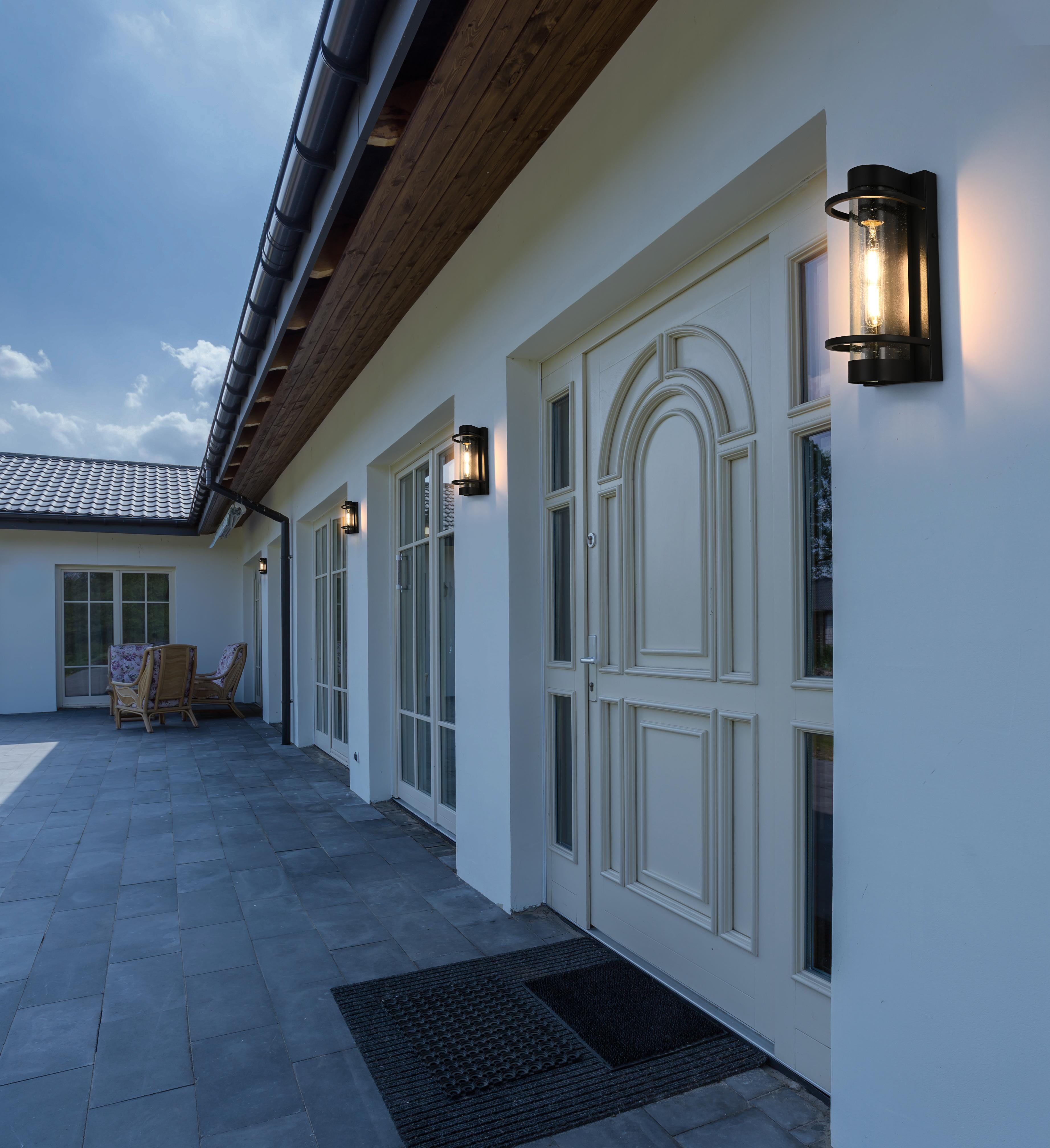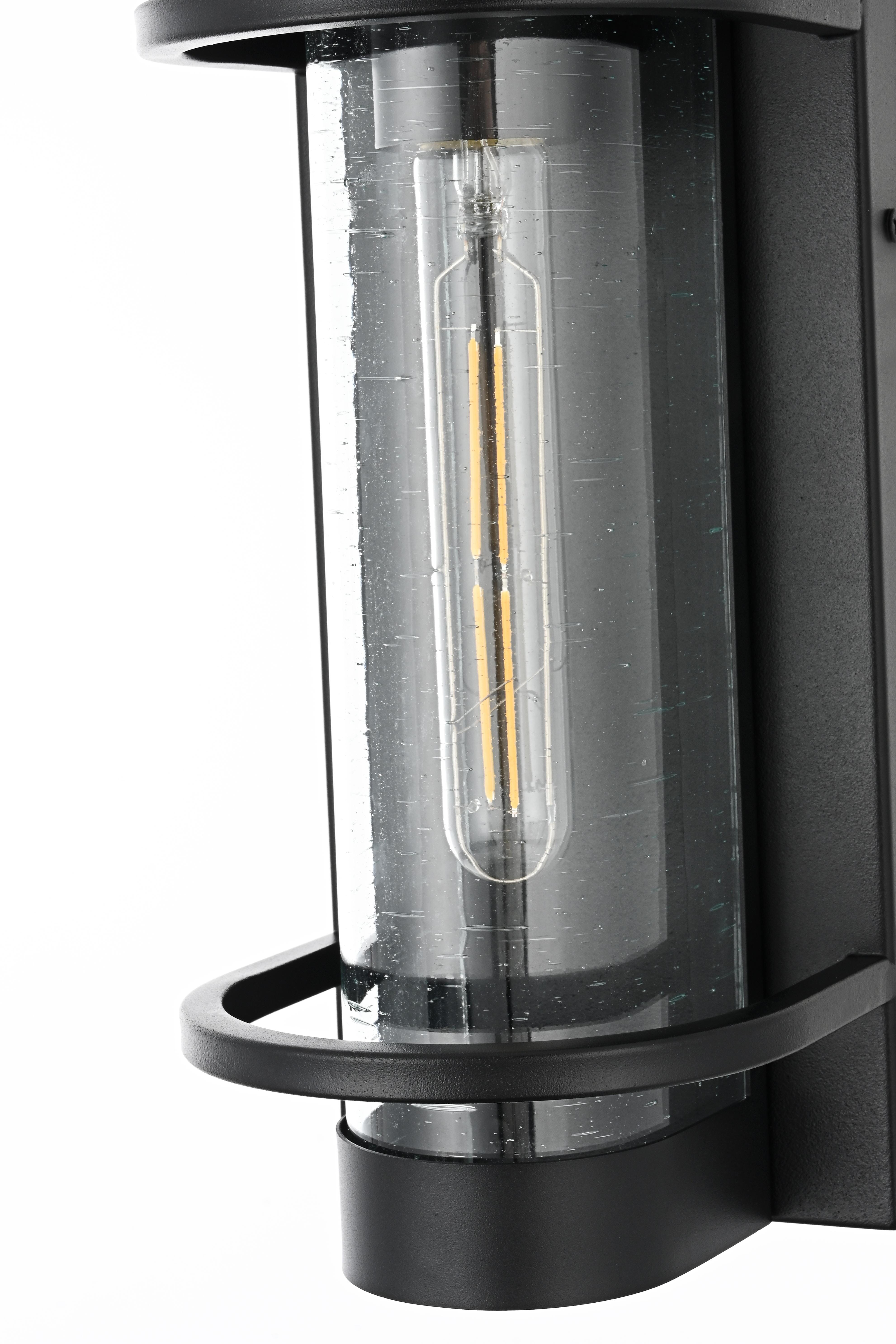 Transform your outdoor space with this striking outdoor wall sconce, expertly crafted from durable iron and clear seeded glass to deliver a blend of modern sophistication and timeless appeal. This wall sconce is designed with a bold cylindrical glass shade that wraps around an E26 socket, ensuring it shines with a warm, inviting glow. The distinctive curved metal armature creates a sense of structural harmony while offering a protective yet stylish look. With a sleek black finish, this sconce brings contemporary refinement to your entryways, patios, or garden spaces, all while being engineered to withstand the elements. Elevate your home's curb appeal and bask in the timeless allure of this refined lighting piece.