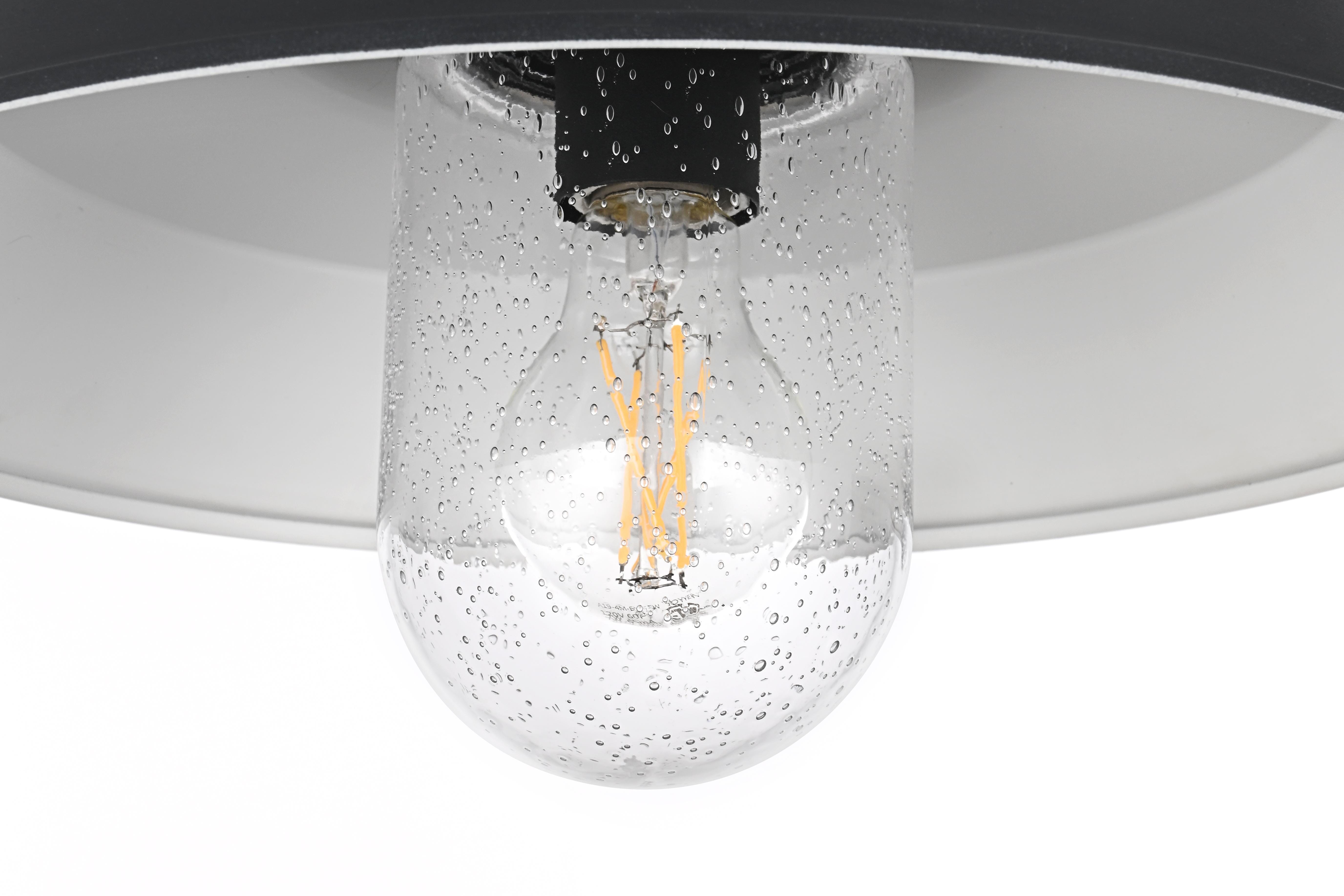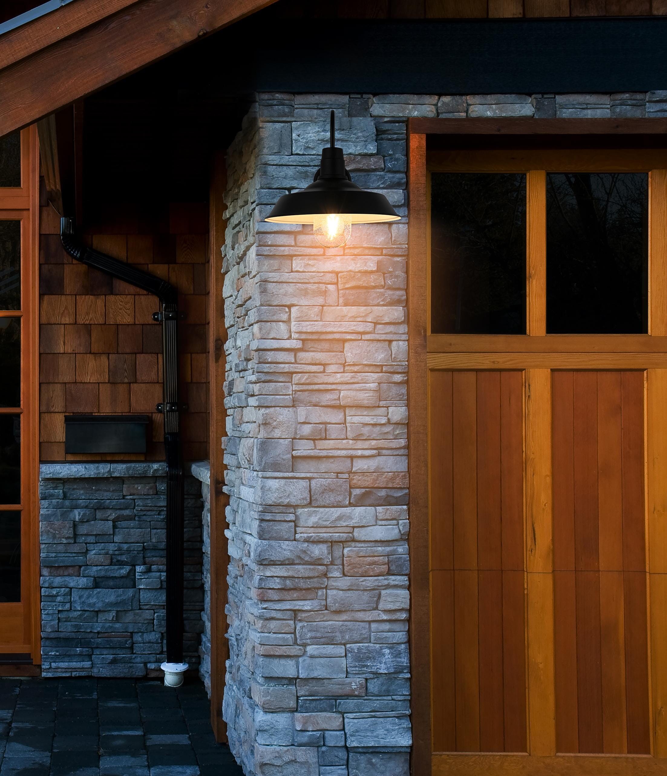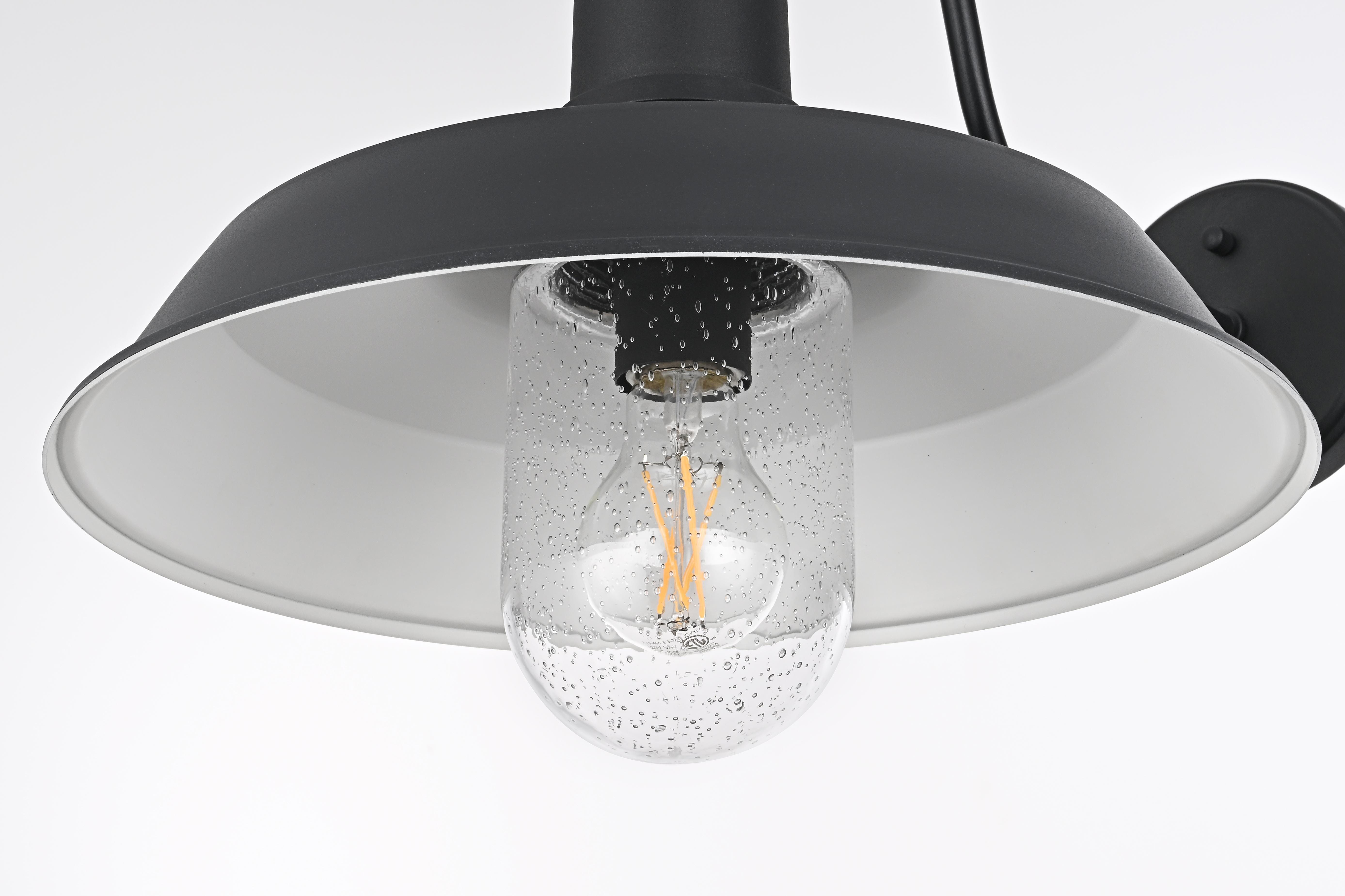 Bring industrial charm and farmhouse character to outdoor spaces with a barn-style wall light that balances vintage appeal with modern functionality. A gracefully curved gooseneck arm extends from the circular backplate, supporting a wide iron shade with a contrasting white interior that maximizes light reflection. The clear seeded glass globe adds a textured, artisanal touch, diffusing the light beautifully while showcasing the bulb inside. Finished in deep matte black, this durable iron sconce is wet rated for all-weather use, making it a perfect choice for patios, porches, garages, and outdoor walkways. Designed with an E26 socket (bulb not included), this versatile outdoor light pairs effortlessly with LED, Edison, or incandescent bulbs to create a warm and inviting ambiance.