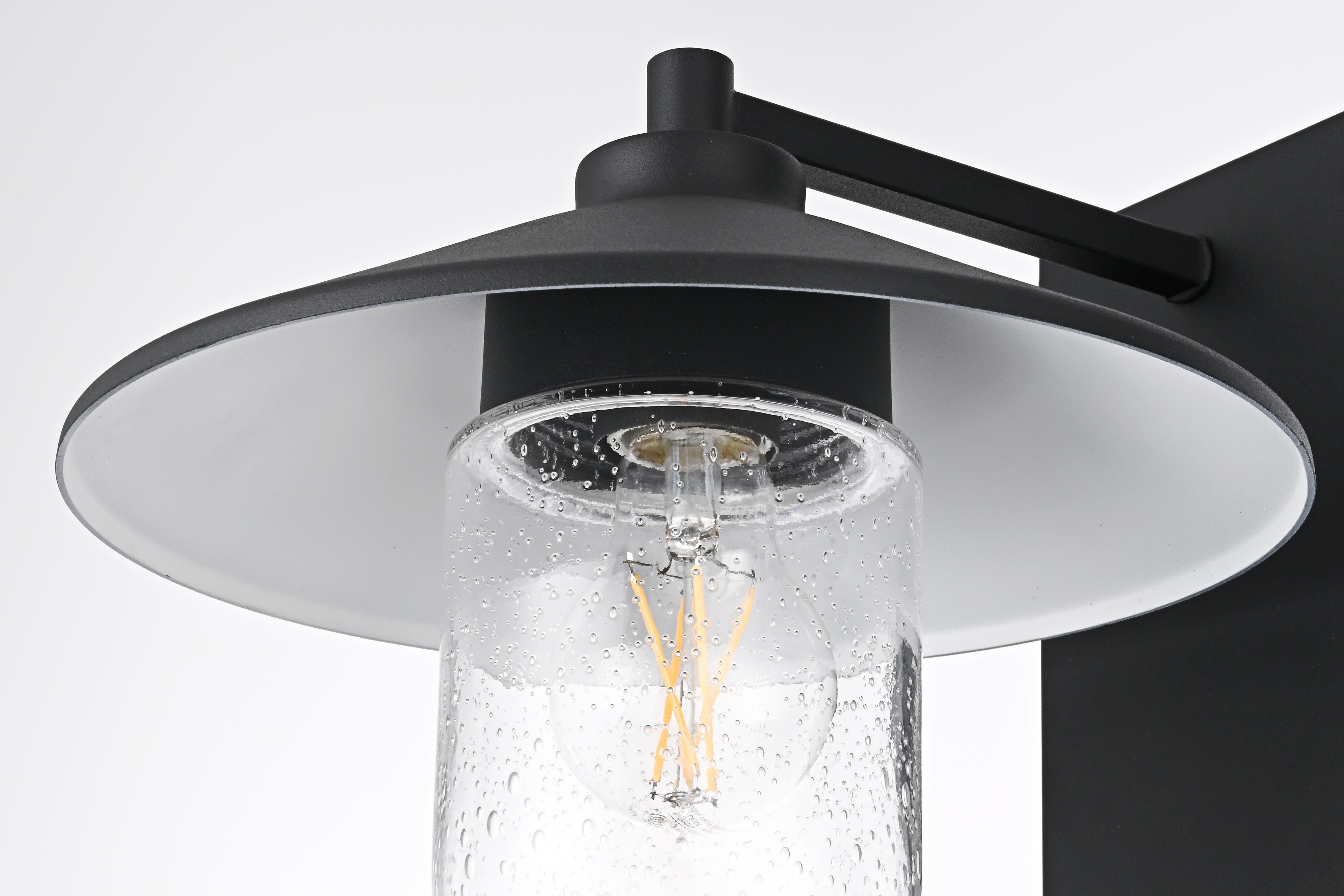 Add character and functionality to any outdoor space with a barn-style wall light that blends classic farmhouse charm with a modern edge. A wide matte black metal shade directs light downward, creating a focused and practical glow, while the crisp white interior maximizes brightness. The clear seeded glass globe introduces a touch of texture, with tiny bubbles catching the light to create a dynamic, eye-catching effect. A sleek angular arm extends from the rectangular backplate, keeping the design balanced and structured. Designed with an E26 socket (bulb not included), this wet-rated outdoor light is built for durability, making it an ideal choice for patios, garages, entryways, and more. Whether styled with an Edison bulb for a vintage-inspired look or a bright LED for efficiency, this standout piece enhances exteriors with its bold, structured design.