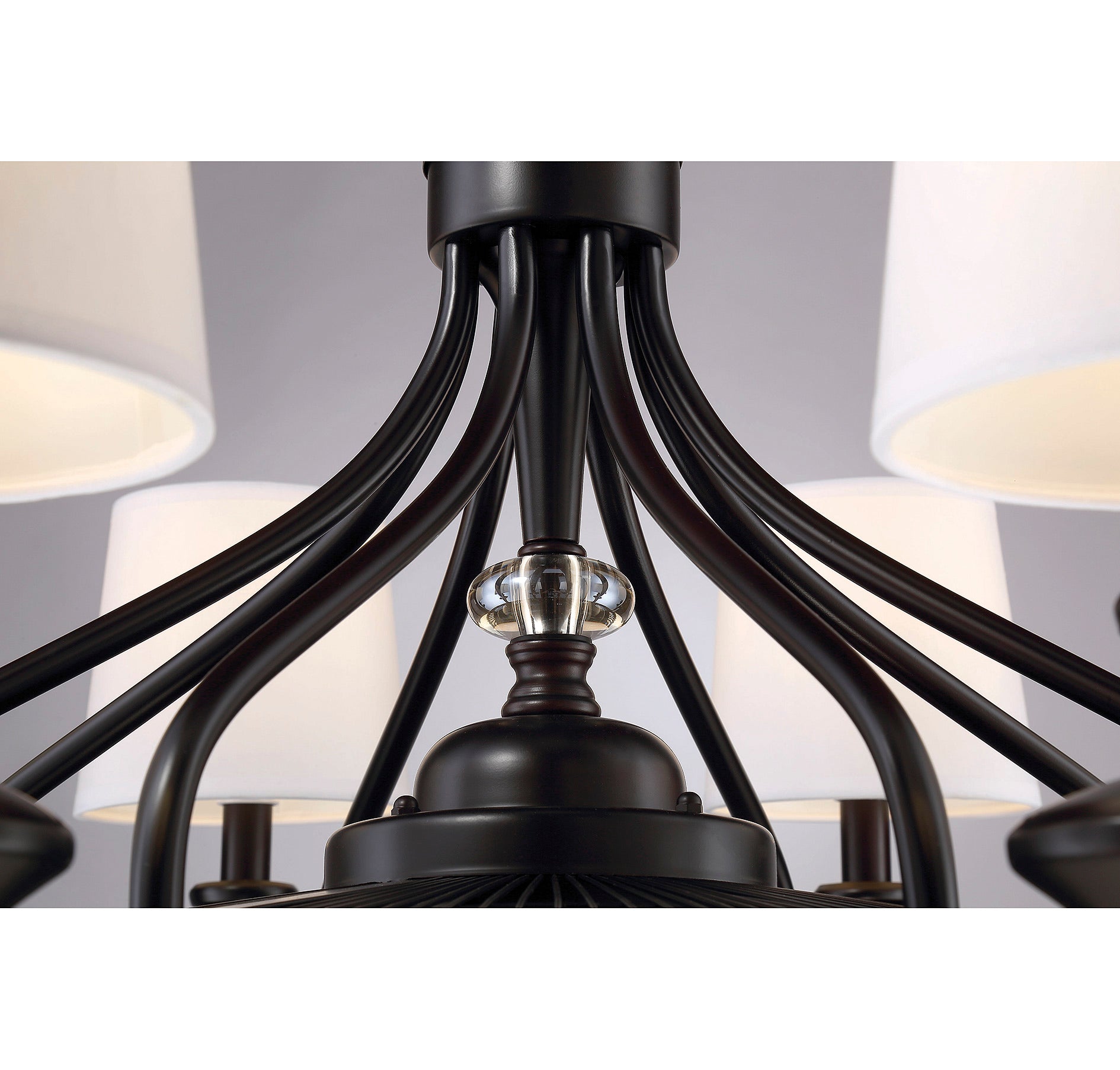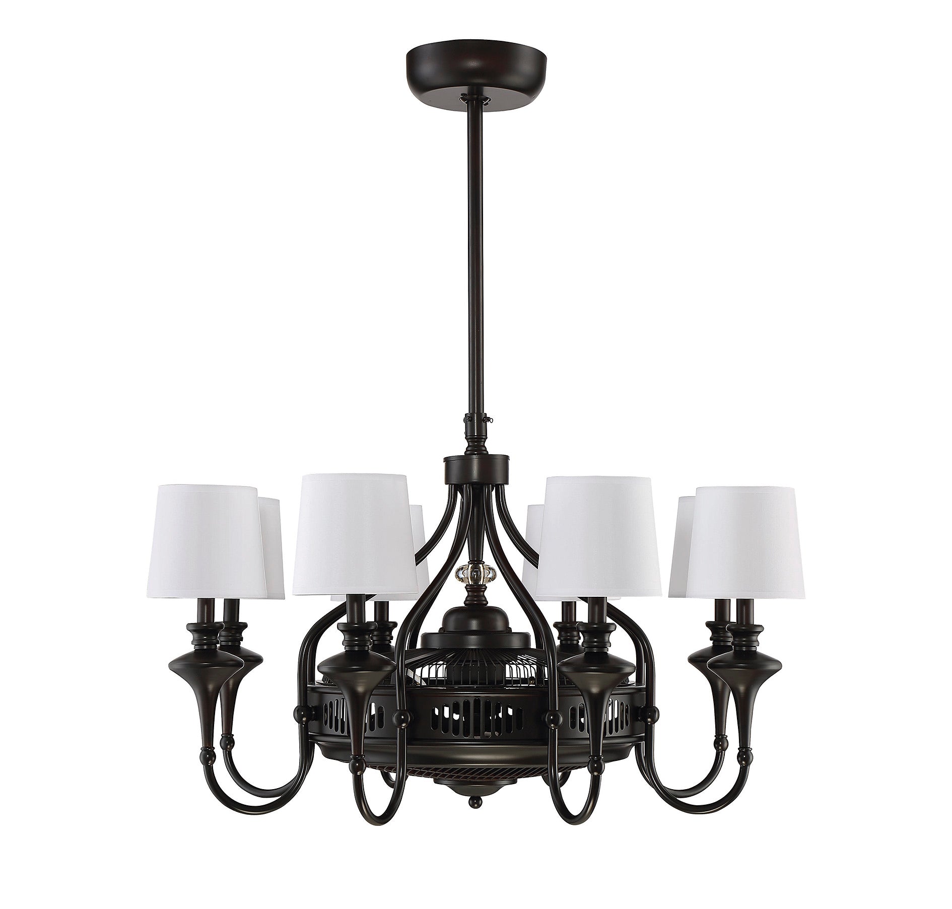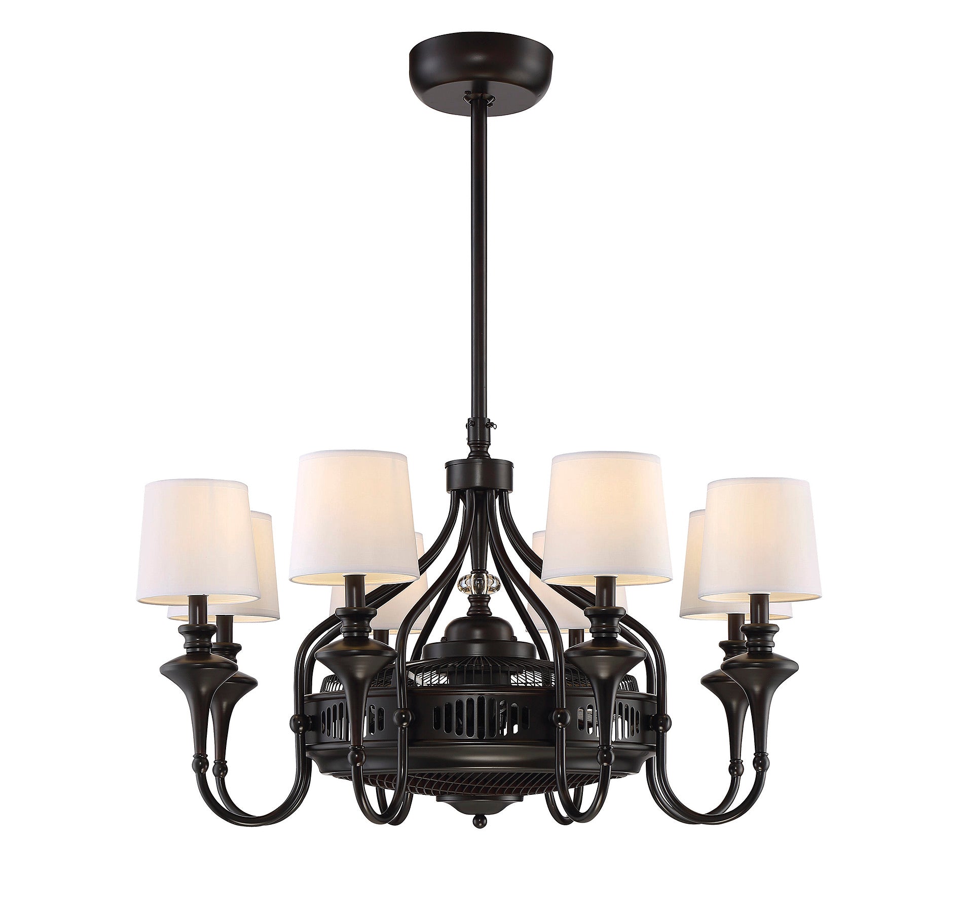 A classic chandelier design meets air circulation functionality in this Savoy House Brisa Fan D'Lier. Improve the comfort while you beautify your home with the elegance of this traditional style fixture. The graceful curved frame, upswept light arms, finial and detailed candle cups all have a rich, dark English bronze finish and each light has a tasteful off-white fabric drum shade. The fan housing features a decorative open grill structure for maximum air flow. Plus, eight 4W LED dimmable bulbs are included, so you can choose the perfect amount of illumination at any time. (A handheld remote with independent light control is included, too.) 34.75" wide and 21" high with an 18" downrod, so it’s ideal for your dining room, living room, family room, bedroom, enclosed porch or office.