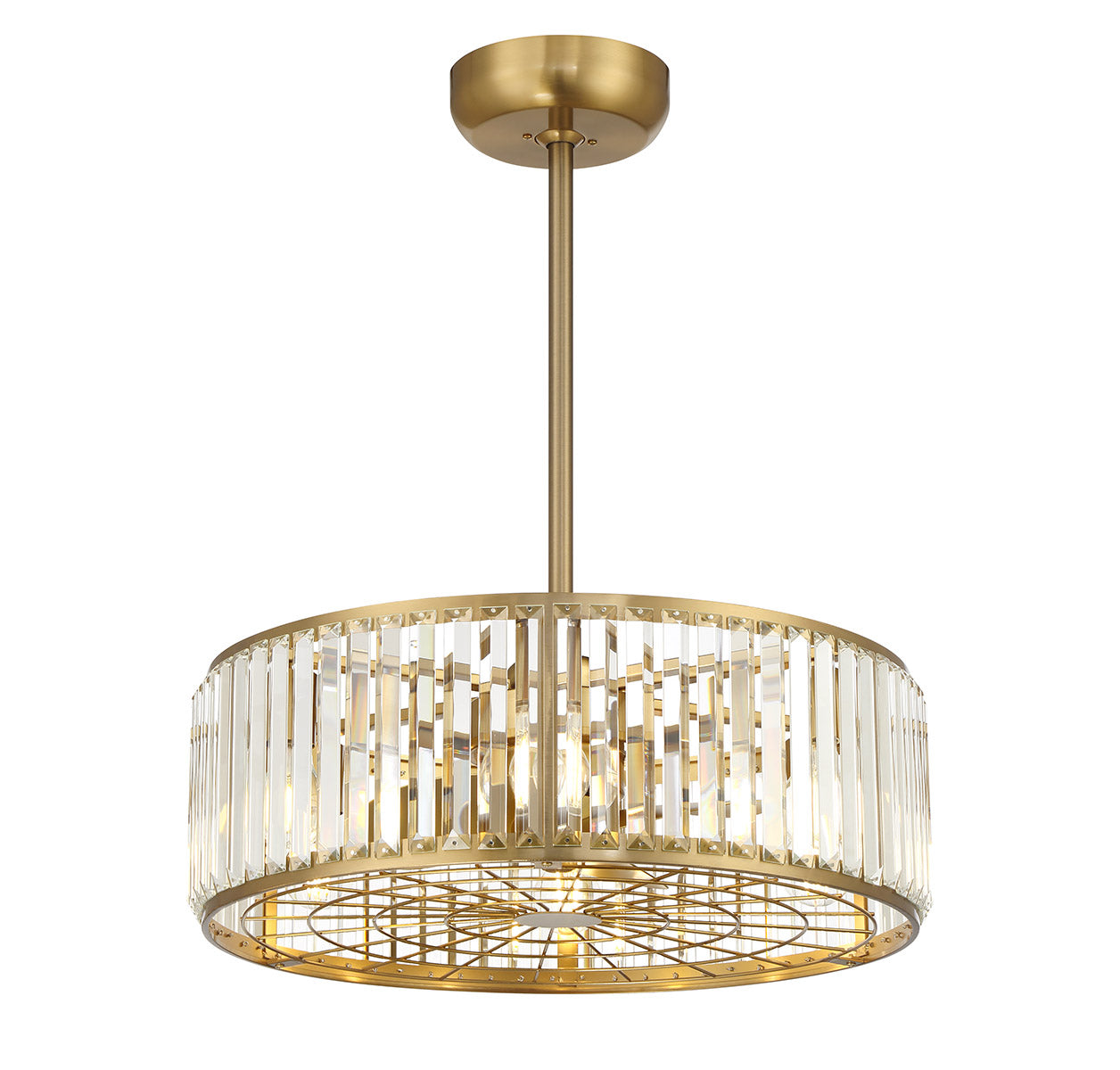 Lovers of glamorous style will adore this Savoy House Janus 6-light Fan D'Lier. The lights sparkle from behind slim, sleek pieces of faceted clear crystal that pop nicely against the Warm Brass finish. Janus uses an efficient DC motor, includes six standard size dimmable LED bulbs of 6 watts per bulb and has a handheld remote control for extra convenience. It is 23" in width and 10.3" in height. Comes with a 4" downrod and an 18" downrod. Fan D'Liers are a Savoy House exclusive that combines the best of ceiling fans with the best of chandeliers in one fabulously fashionable fixture. These custom designs are inspired by high-end designer styles and take top trends to a whole new level.