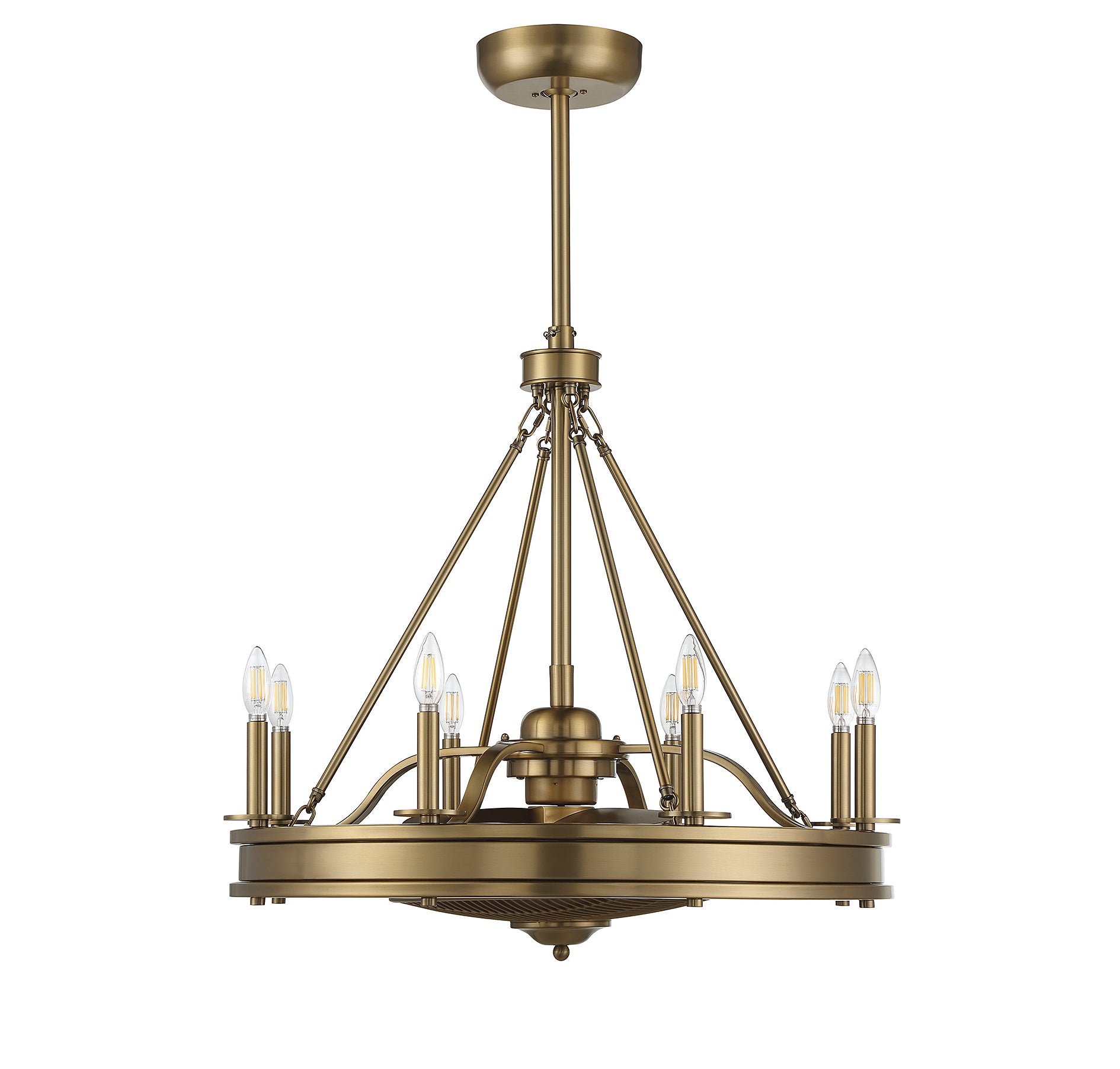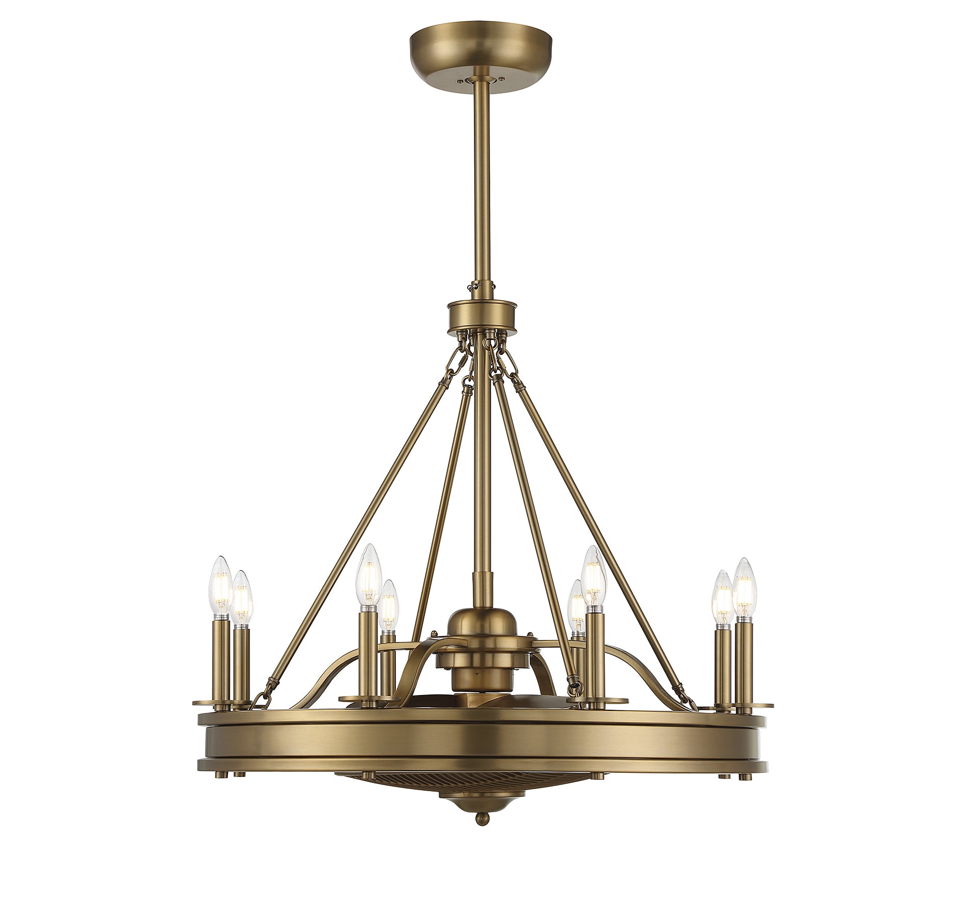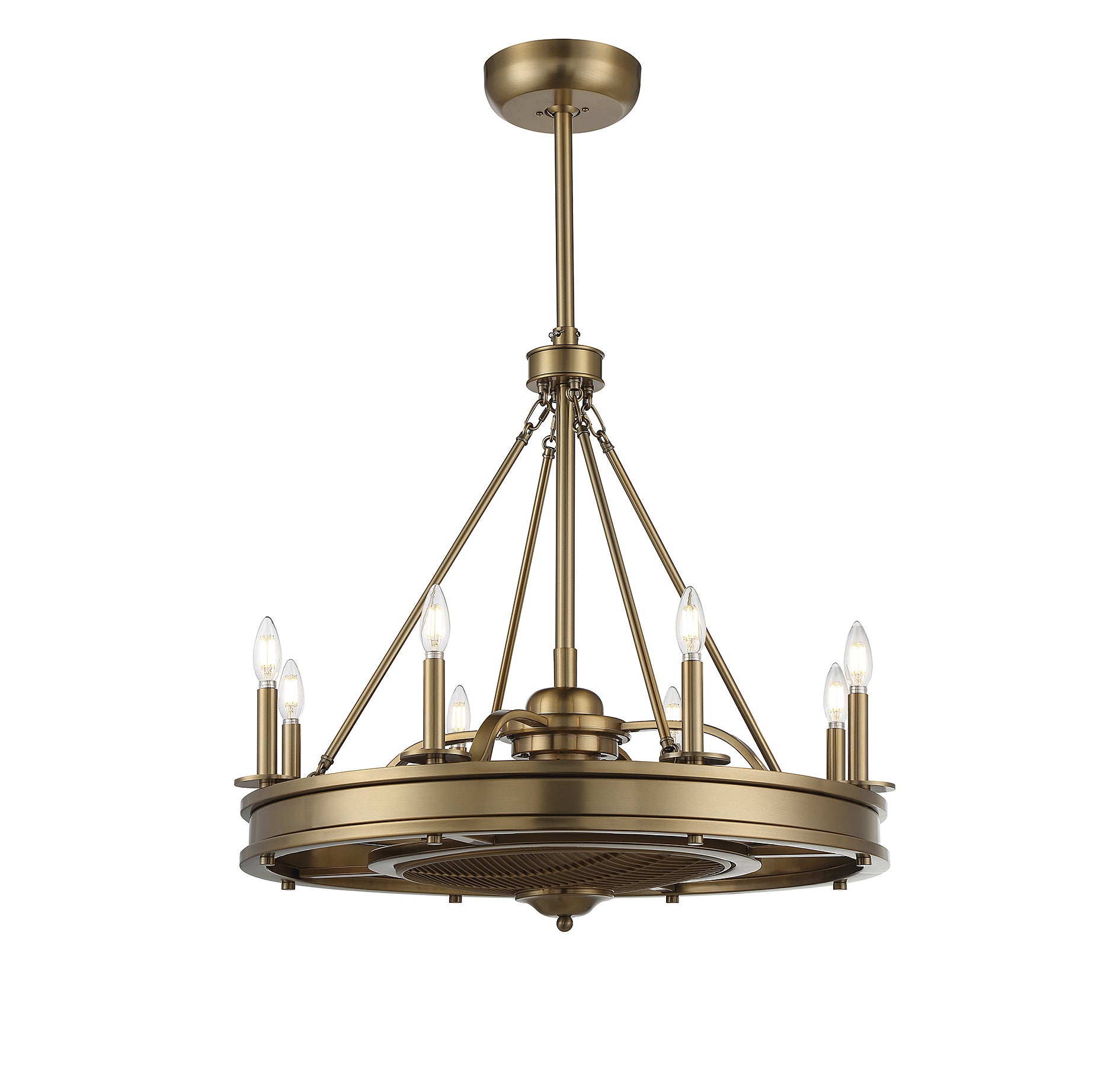 The regal Savoy House Lyon 8-light Fan D'Lier has a bonus benefit. In addition to serving as a fashion-forward chandelier in a versatile warm brass finish, Lyon is equipped with a functional ceiling fan cleverly concealed within its 28.6" high x 30" wide frame. Illumination is provided by eight candelabra bulbs.