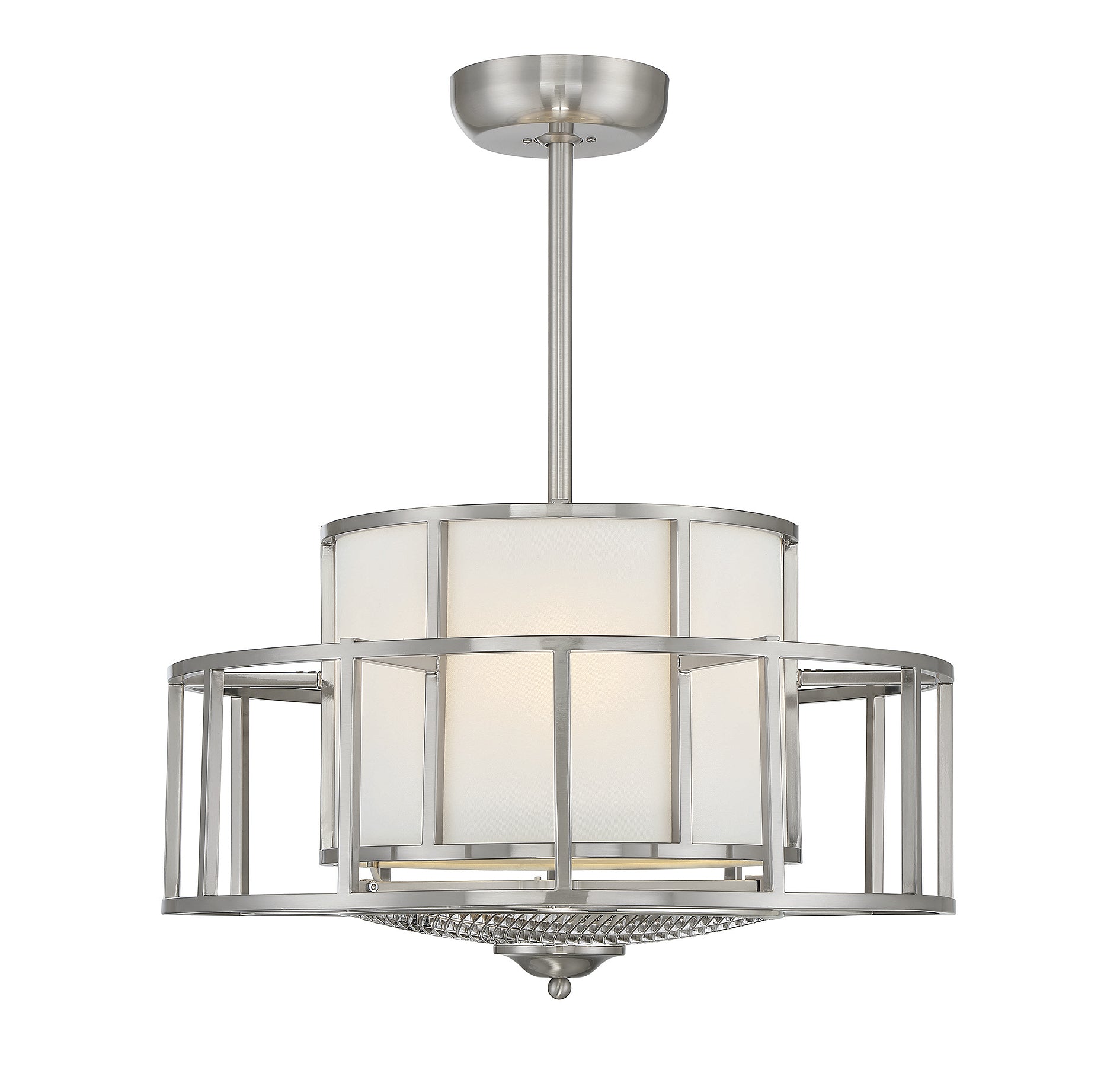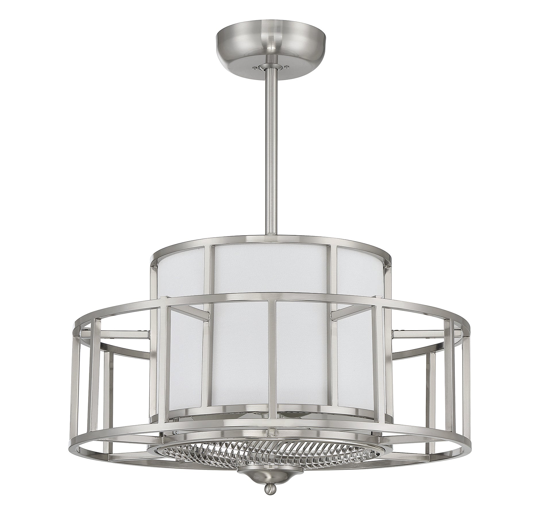 The Savoy House Oslo Fan D'Lier makes a beautiful visual statement in any room. In addition to serving as a fashion-forward chandelier with a white fabric shade and a sculptural outer frame in a satin nickel finish, Oslo is equipped with a functional ceiling fan cleverly concealed within its 12.9" high x 26" wide frame. Illumination is provided by four standard size bulbs.